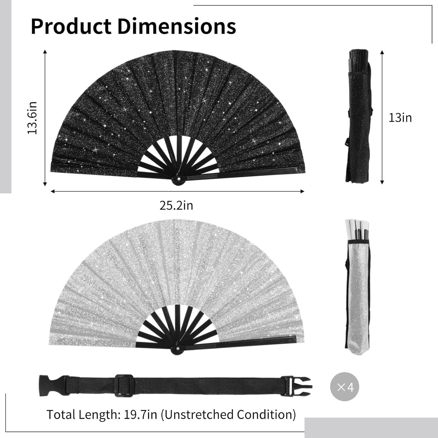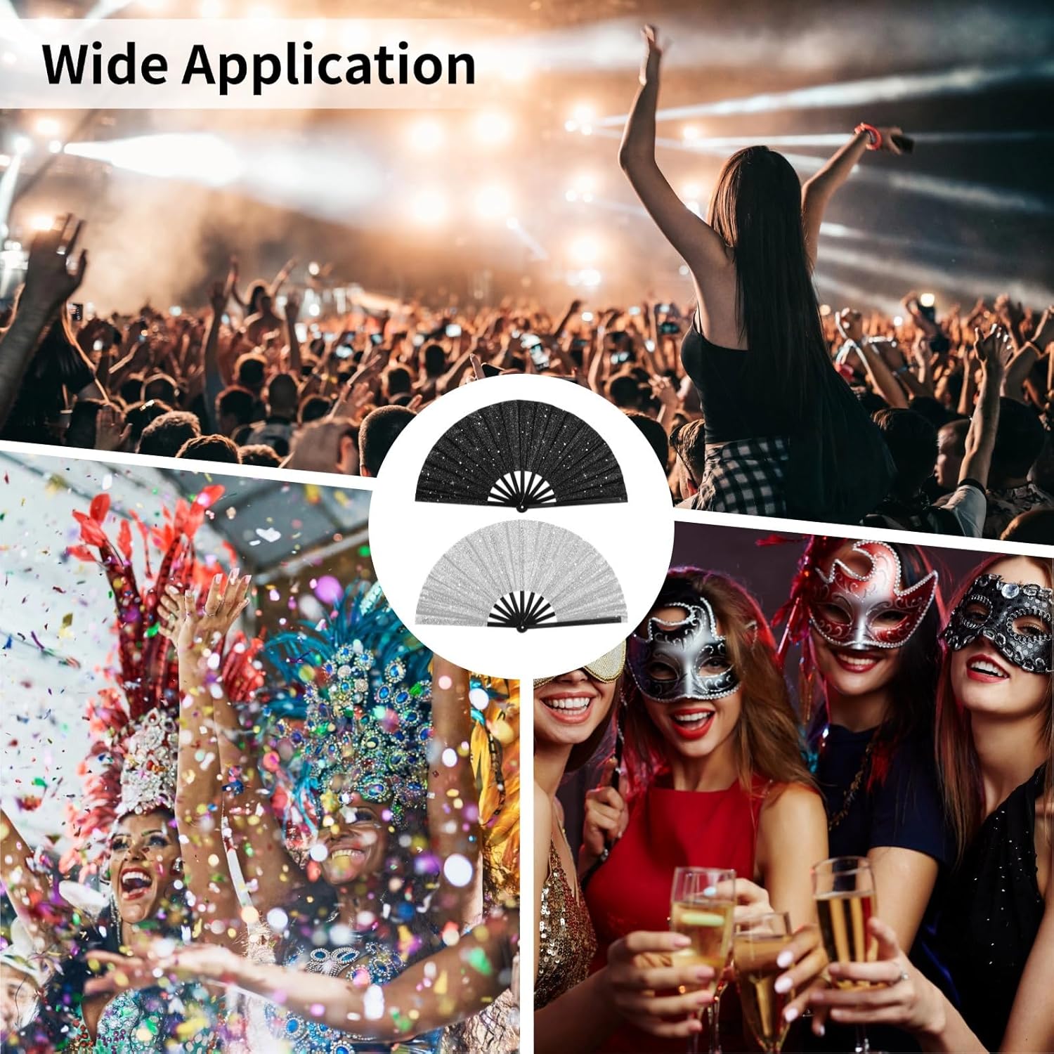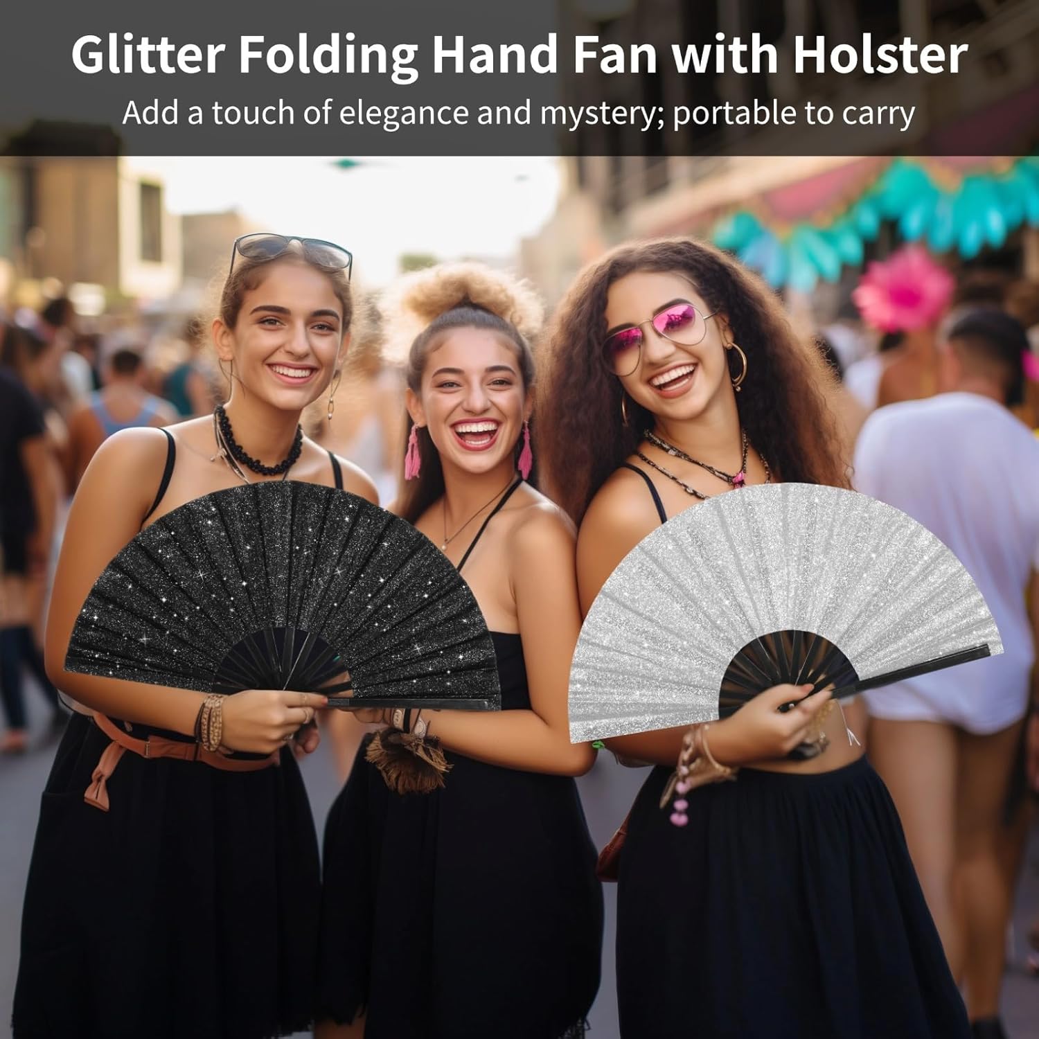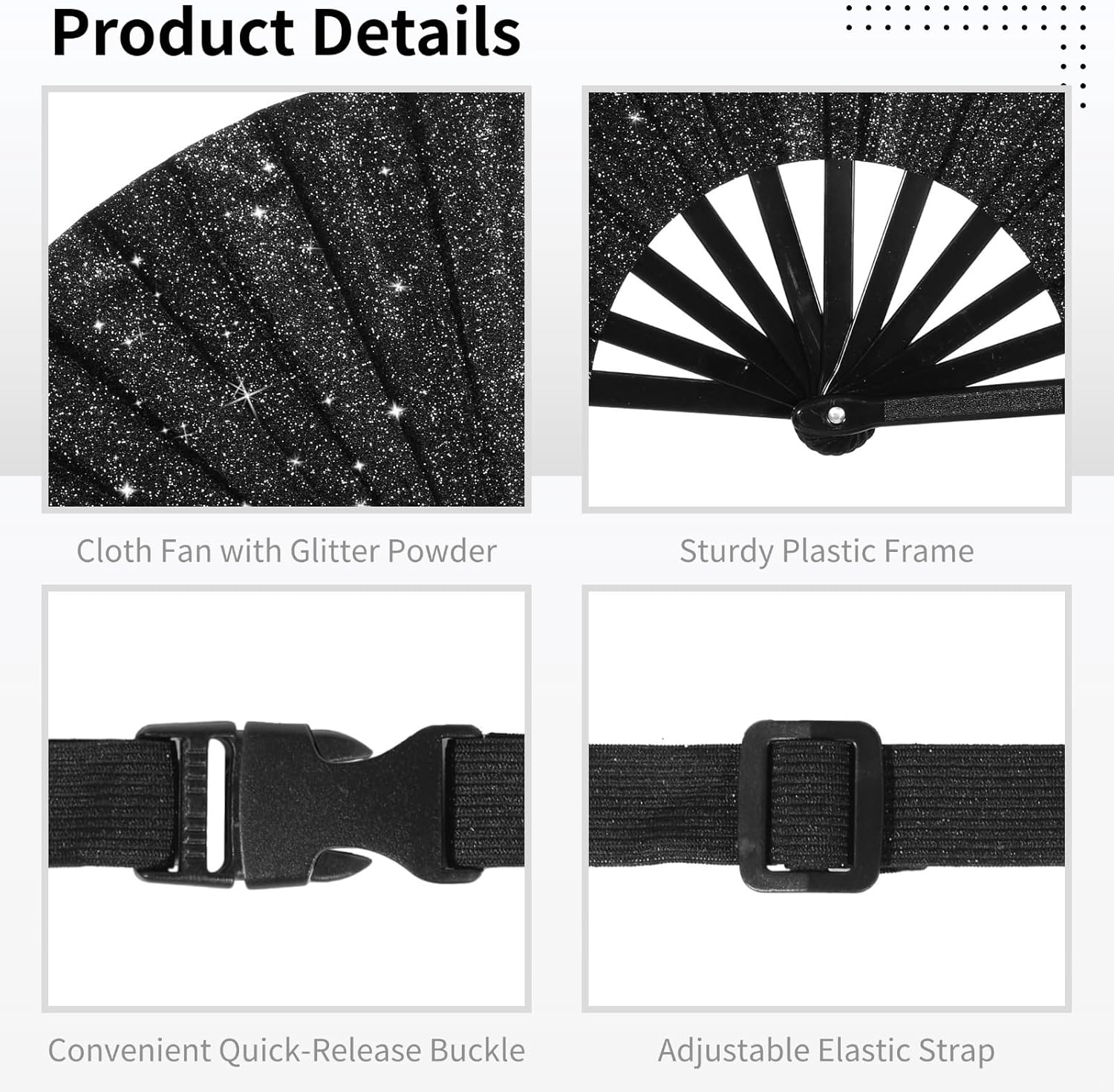 Set di ventagli multiuso: include 2 ventagli pieghevoli glitterati, 2 sacchetti e 4 cinghie elastiche; per regali in vacanza o eventi speciali, offrendo divertimento e praticità Design glitterato scintillante: il ventaglio è decorato con glitter che catturano la luce, creando un effetto abbagliante che ti fa brillare in qualsiasi evento Costruzione durevole: realizzati con tessuto Oxford e cornici in plastica, questi ventilatori sono costruiti per durare, fornendo un suono robusto e nitido quando aperto, garantendo durata e una sensazione tattile soddisfacente Compatto e facile da trasportare: i ventagli misurano 64 x 34,5 cm aperti e si piegano ordinatamente nelle borse di stoccaggio; le cinghie elastiche consentono un facile fissaggio alla vita o alle gambe per comodità Uso versatile: ideale per carnevale, feste a tema, matrimoni, concerti e spettacoli teatrali; per accessoriare costumi e aggiungere fascino a qualsiasi evento