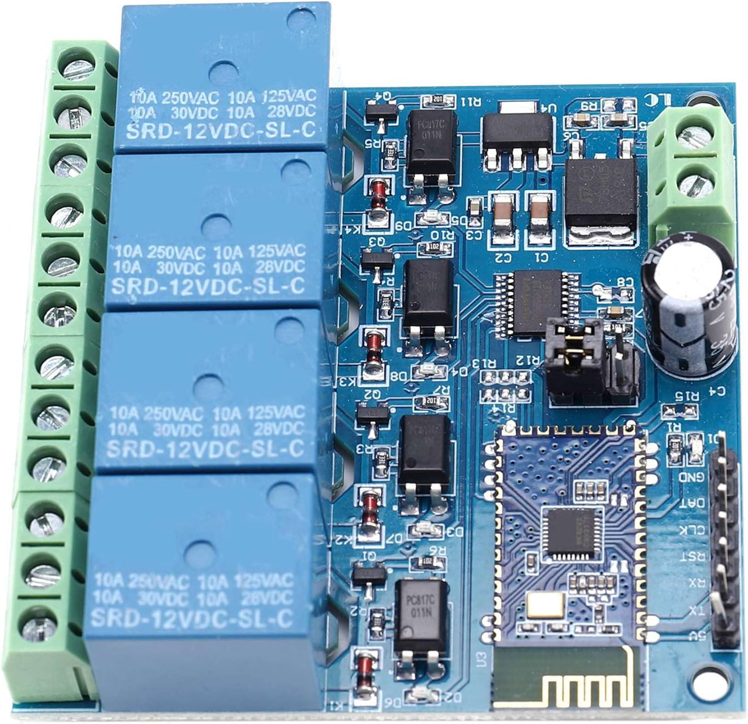 Fonte di alimentazione: DC : relè Bluetooth Tensione: 5 V Utilizzo: Telecomunicazioni Modulo relè Bluetooth a 4 canali LC 12 V dotato di modulo SPP-C Bluetooth 2.1 slave e MCU ad alte prestazioni a 8 bit, è possibile controllare direttamente il relè con l'app del cellulare.
