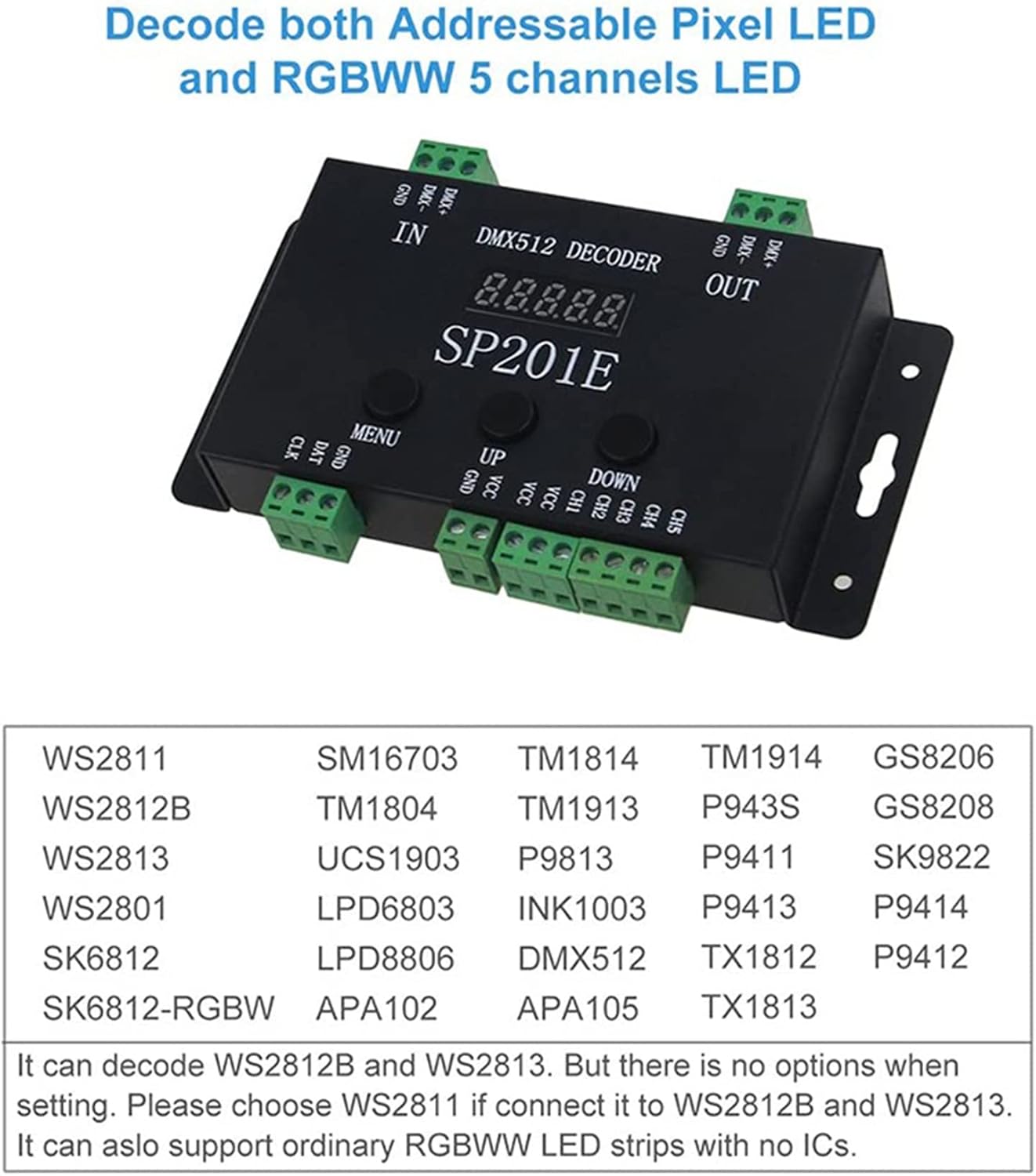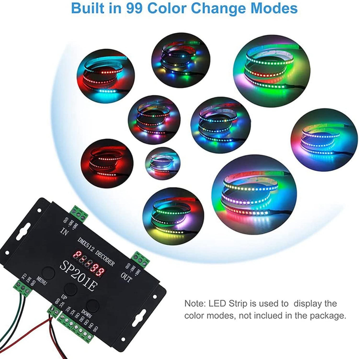 Supporta più driver ICs, ad es. B. SP201E DMX512 WS2812B WS2811 Se non viene immesso alcun segnale, può fungere da controller SPI e controllare i pixel. Nome: Decoder Sono disponibili diverse modalità di colore dinamiche integrate, come: B. ricottura, dissolvenza, lisciatura, caccia, streaming, diffusione e , che sono vivaci e . La velocità è regolabile.