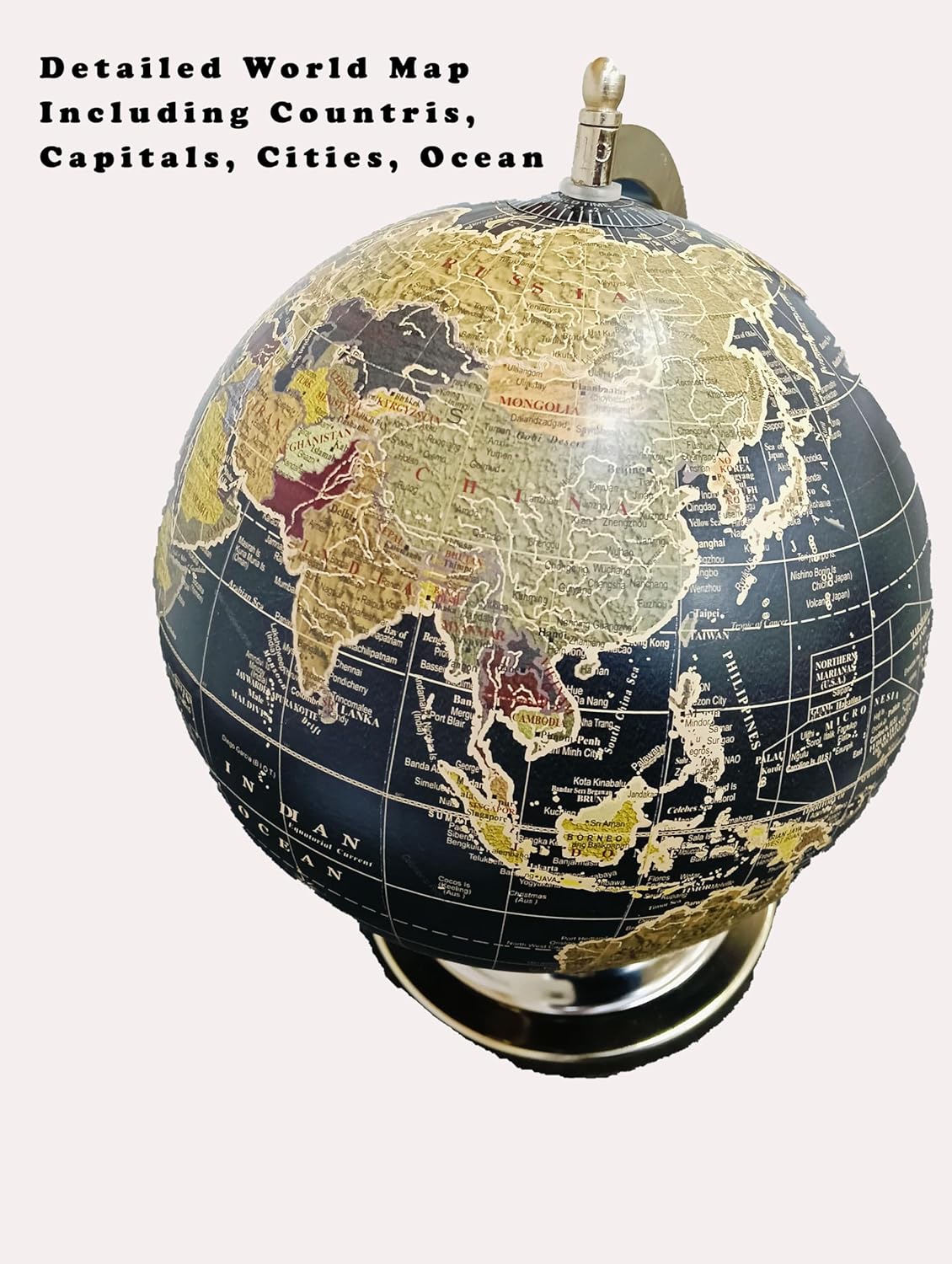 Un elemento di arredamento premium che trasuda lusso e raffinatezza. Questo globo ha un duplice scopo, combinando educazione ed estetica Il globo di medie dimensioni da 20,3 cm di diametro raggiunge il perfetto equilibrio tra l'essere abbastanza compatto per una scrivania o un tavolo da ufficio e abbastanza grande da visualizzare informazioni geografiche dettagliate in modo efficace. Questo mappamondo è perfetto per decorare i tavoli dell'ufficio, aggiungere un tocco di raffinatezza al tuo spazio di lavoro e servire come antipasto di conversazione.