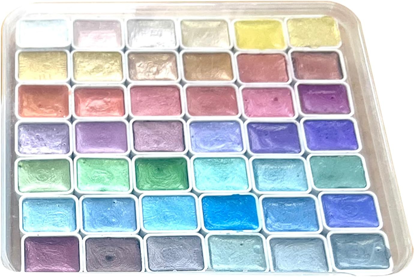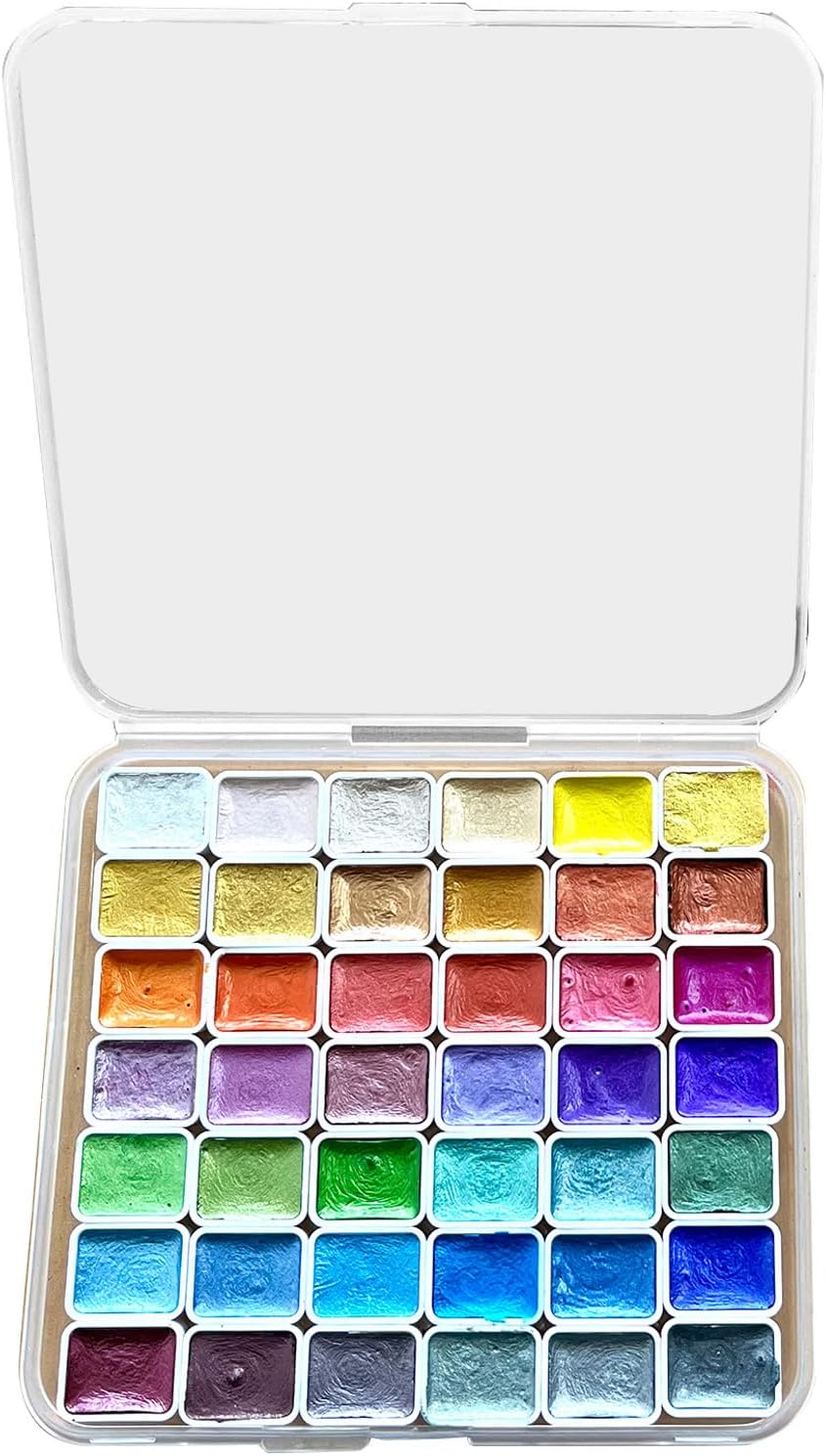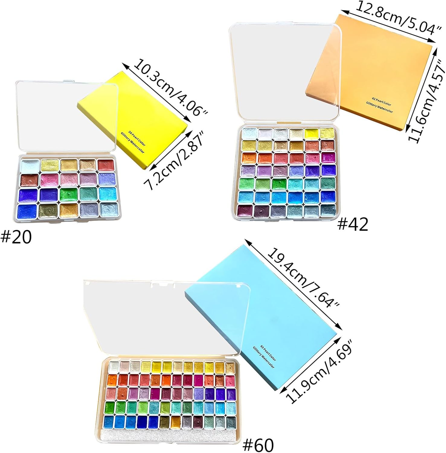 La vernice è stata macinata finemente, solubilità rapida in acqua, grande diffusione, colore uniformemente miscelato, elevata resistenza alla luce e alta saturazione. Può essere facilmente miscelato con altri colori per effetti unici Piccole custodie per vernici individuali, tutte ben organizzate in scatola. Compatto e portatile. La sua consistenza liscia si asciuga per una finitura audace, scintillante e brillante, ed è con pennello e spugne per diversi effetti sorprendenti pigmenti solidi acquerello, non tossici e sicuri, molto festivi, compleanni, per studenti, principianti. Molto adatto per incoraggiare la passione dei bambini all'arte e Questi acquerelli solidi professionali sono adatti a tutti i pittori, principianti, artisti, studenti e bambini che dipingono su carta, tessuto, legno, pietra, artigianato. Grande aiuto per aggiungere e brillare le loro opere d'arte 20 42 o 60 colori perlescenti brillanti, la vernice ad acquerello ha un alto grado di colorazione, più brillante sotto una forte luce. Sia sulla carta bianca/nera, è molto piena di colore e fornisce un effetto brillante brillante