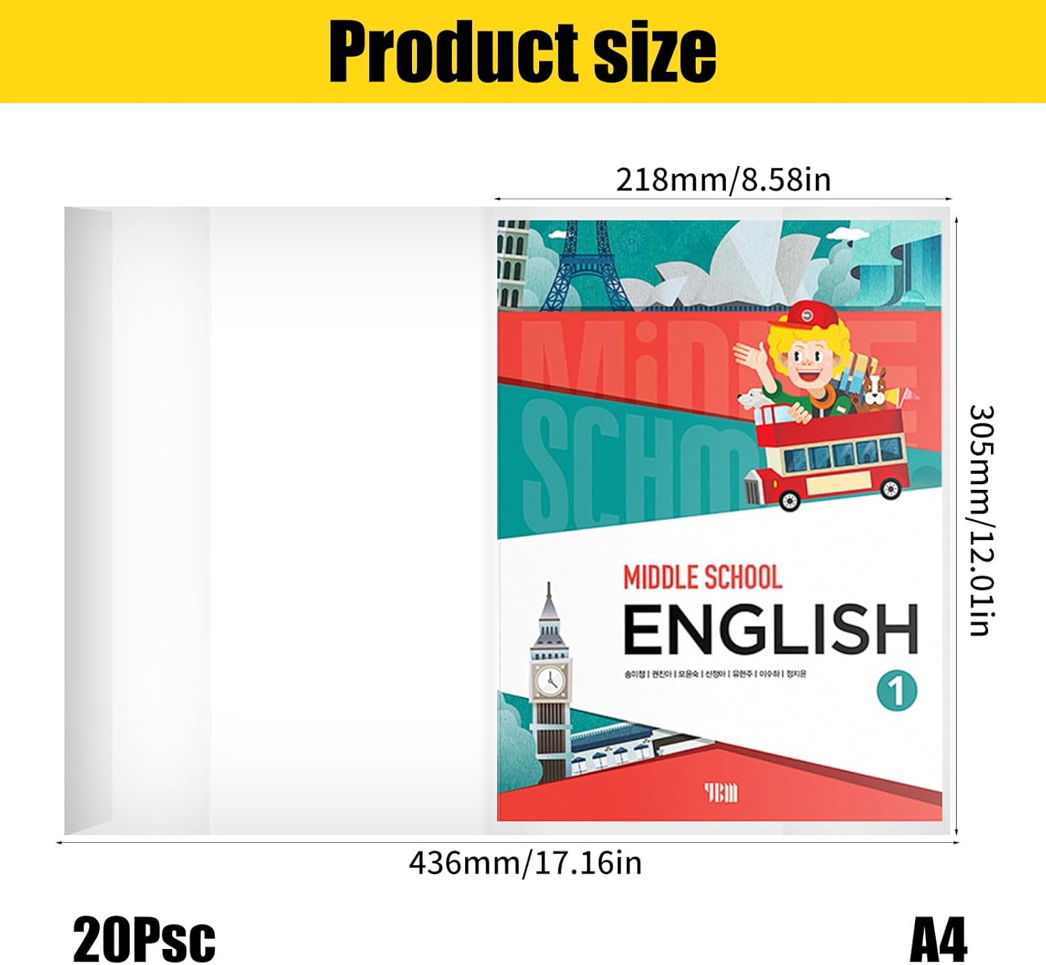 Contenuto della confezione: riceverete 20 buste trasparenti per libri, la dimensione del prodotto è di 305 × 218 mm. Adatto per quaderni e libri A4, proteggi i tuoi libri, prolunga la vita dei libri Materiali di alta qualità: copertina trasparente realizzata in plastica PP di alta qualità, impermeabile e resistente all'usura. La consistenza è morbida e si deforma dopo la piegatura, non è facilmente riutilizzabile. Protegge efficacemente i tuoi libri da sporco e danni Design regolabile: le copertine per libri scolastici adottano un design unico e possono essere coperti anche libri più spessi. e la larghezza di una pagina della copertina del libro può essere regolata a piacere, in modo che vari libri si adattino facilmente Facile da usare: protezione per libri trasparente, con guarnizione autoadesiva su un lato. Basta far scorrere la parte anteriore e posteriore del libro nelle due sovraccoperta, quindi rimuovere la pellicola protettiva e incollarla saldamente. per proteggerlo da polvere, sporco, umidità e altro ancora Ampia gamma di applicazioni: il design trasparente della copertina del libro non è adatto solo per quaderni scolastici A4, libri. Ma anche per spartiti, disegni per bambini, diari, disegni, manuali per auto, documenti, biglietti, ecc. Ideale per l'uso in famiglia, scuole, uffici