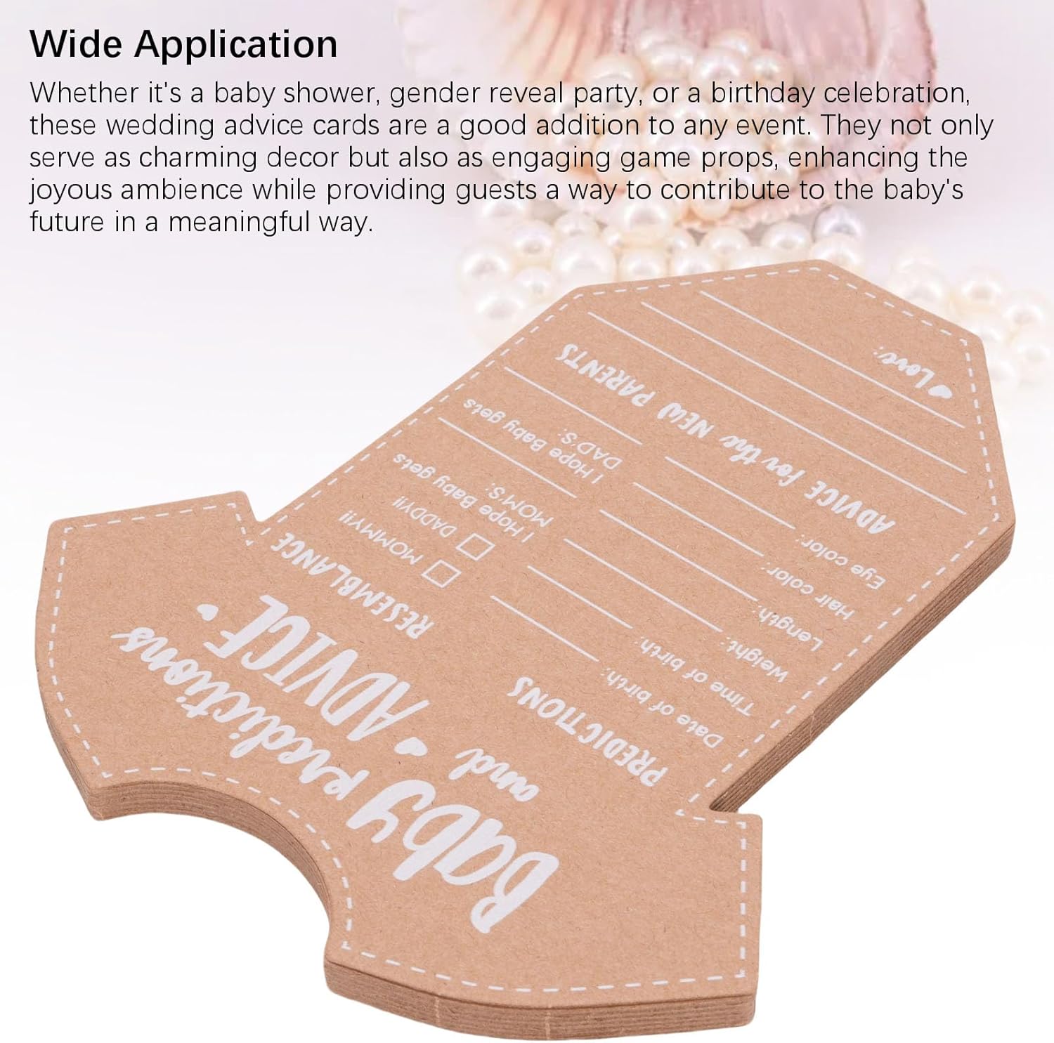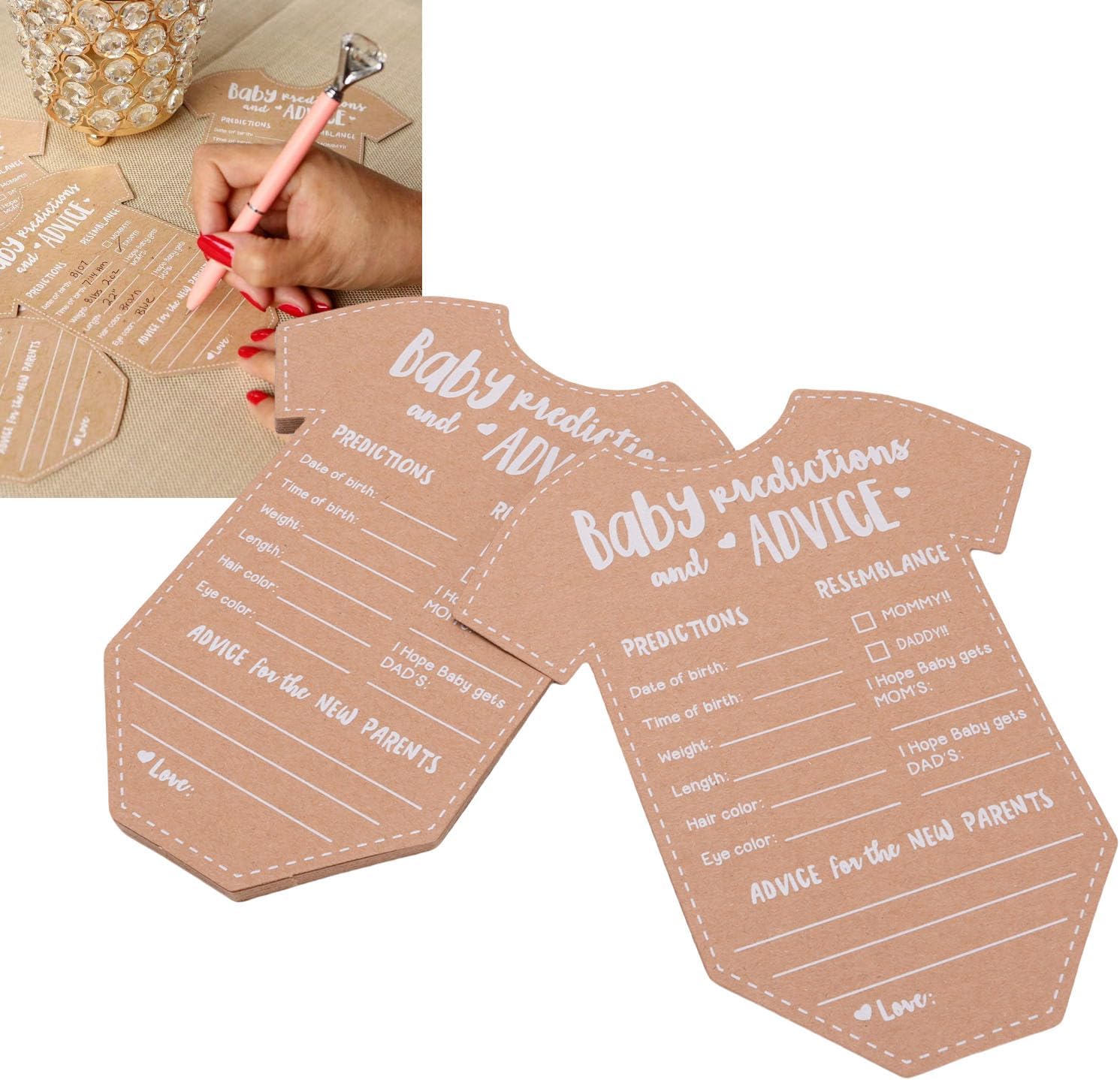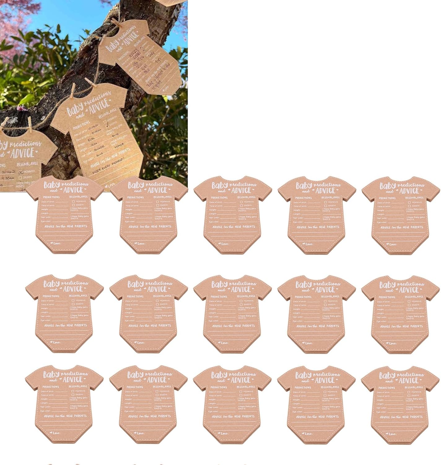 Carta kraft durevole e di alta qualità: le carte di consulenza e previsione del bambino sono realizzate con una carta kraft spessa e di alta qualità che impedisce l'inchiostro a sanguinare. Questo materiale durevole garantisce un'esperienza di scrittura regolare per gli ospiti e crea un ricordo duraturo che i nuovi genitori possono fare tesoro per molti anni come un bel ricordo del loro giorno speciale. Design adorabile e funzionale: un affascinante design a forma di tutina aggiunge un elemento divertente e visivamente accattivante alla tua celebrazione. Le carte offrono ampio spazio agli ospiti per scrivere le loro previsioni e i messaggi sinceri, rendendo queste decorazioni di carta Kraft sia un'aggiunta carina e pratica a qualsiasi festa di rivelazione di baby shower o genere che delizierà i tuoi ospiti. Attività coinvolgente e interattiva: queste carte di attività dei giochi per baby shower sono un ottimo modo per coinvolgere i tuoi ospiti e interagire tra loro. Il gioco di Fun Party per gli ospiti incoraggia tutti a condividere le loro intuizioni, consigli e auguri, rendendo l'evento più memorabile e creando una raccolta di messaggi sinceri per il divertimento dei genitori. Crea un ricordo memorabile: un set di carte ricordi memorabili è un modo meraviglioso per preservare i ricordi felici della tua celebrazione. Dopo la nascita del bambino, i nuovi genitori possono guardare indietro a queste nuove carte e previsioni di consulenza dei genitori, creando un viaggio sentimentale pieno di amore e risate condivise da amici e familiari man mano che la propria famiglia cresce. Versatile per le celebrazioni multiple: le forniture per feste di Gender Reveal sono una grande aggiunta a una varietà di eventi, dalle docce per bambini alle prime feste di compleanno. Le carte fungono sia da arredamento affascinante che da attività coinvolgente, migliorando l'atmosfera gioiosa fornendo al contempo un modo significativo agli ospiti di contribuire al futuro del bambino, rendendoli un accessorio per la festa molto versatile.