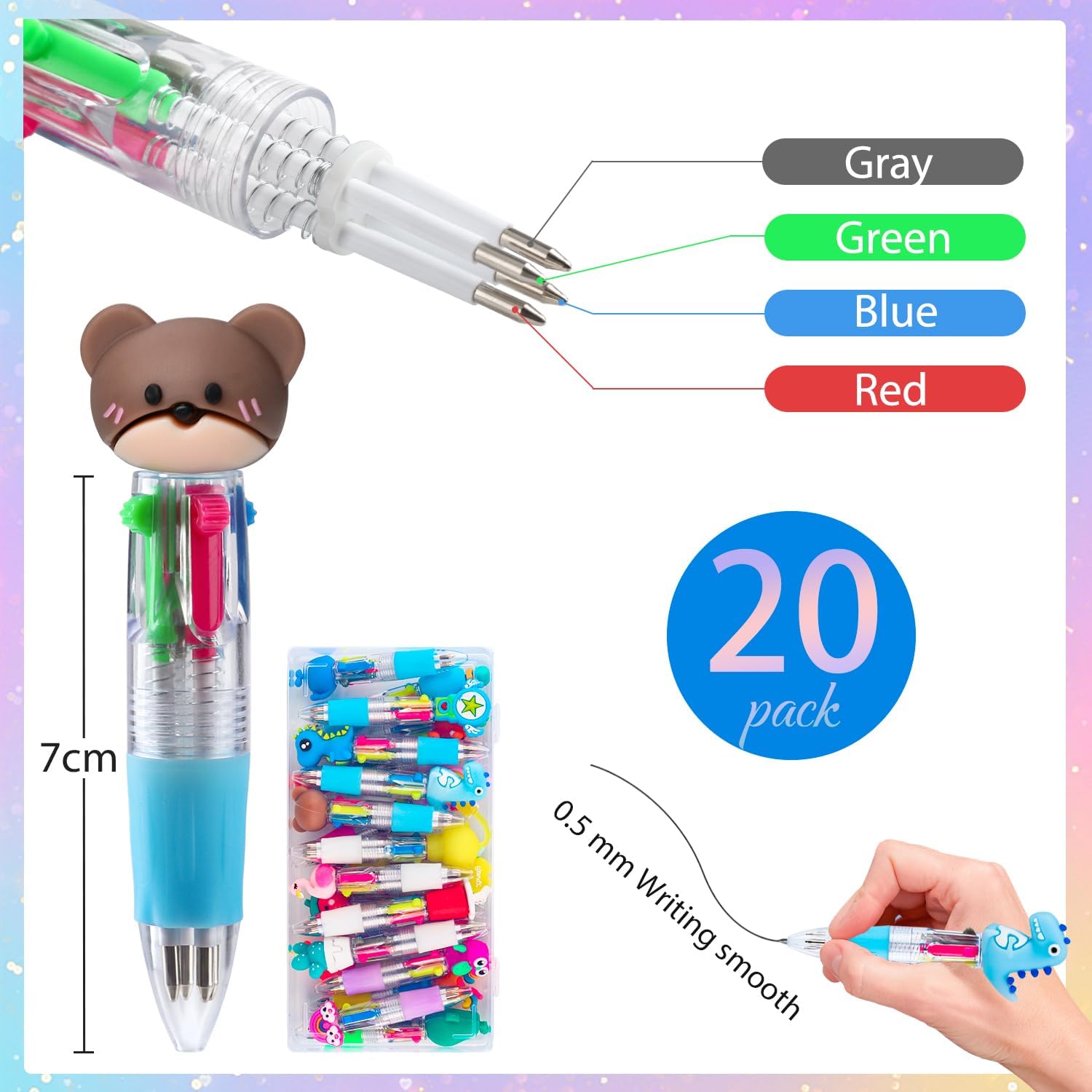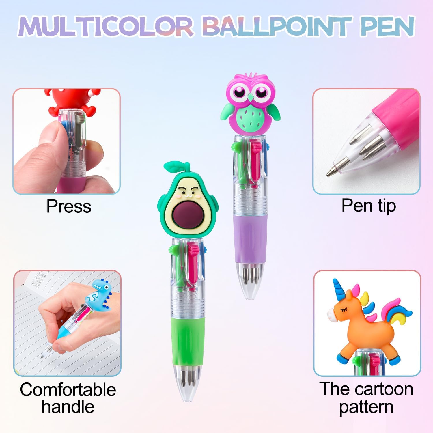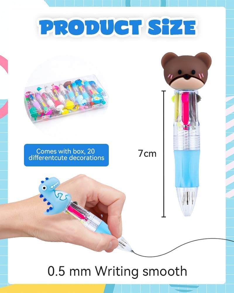 1. Queste simpatiche penne multicolori sono adatte per bambini e adulti e possono essere utilizzate a scuola, a casa e in ufficio. Perfetto per scrivere, scarabocchiare, disegnare, inserire foto e creare schizzi colorati. Cattura i tuoi preziosi pensieri, ricordi ed esperienze divertenti con queste penne multicolori 2. Include 20 diversi modelli di cartoni animati: avocado, dinosauro, coniglio, cigno, pentagramma, unicorno, maiale, ecc., con colori vivaci, sono ideali anche per regali di compleanno, regali per gli ospiti, riempitivi per sacchetti regalo, premi in classe e molto altro ancora. 3. 10 cm x 2 cm, piccolo e portatile, facile da trasportare, penna da 0,7 mm, inchiostro resistente allo sbiadimento garantisce una linea di scrittura solida, mantiene la scrittura pulita quando si prendono appunti e si scrivono, per compiti di scrittura che richiedono pulizia e precisione. 4. Questa penna multicolore è disponibile in 4 colori vivaci: rosso, blu, verde e nero. È possibile utilizzare penne a sfera di diversi colori per evidenziare contenuti importanti in libri o quaderni, sostenere la memoria e anche per i bambini da colorare. 5. Questo divertente set di penne a sfera con animali è un regalo perfetto per la classe, l'aula, la scuola, il compleanno dei bambini, la festa di Natale, il giorno del Ringraziamento, la festa di Capodanno, ecc