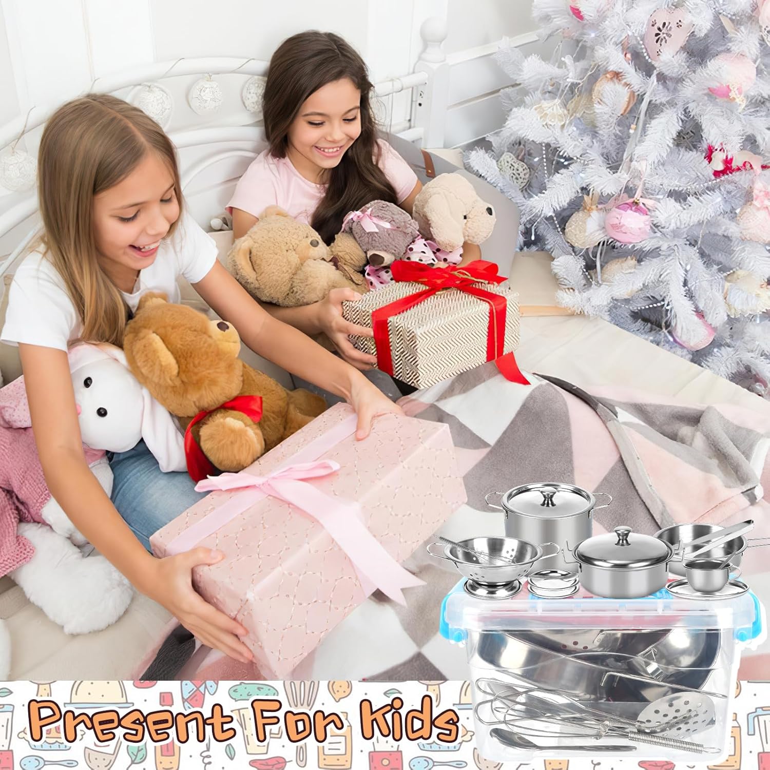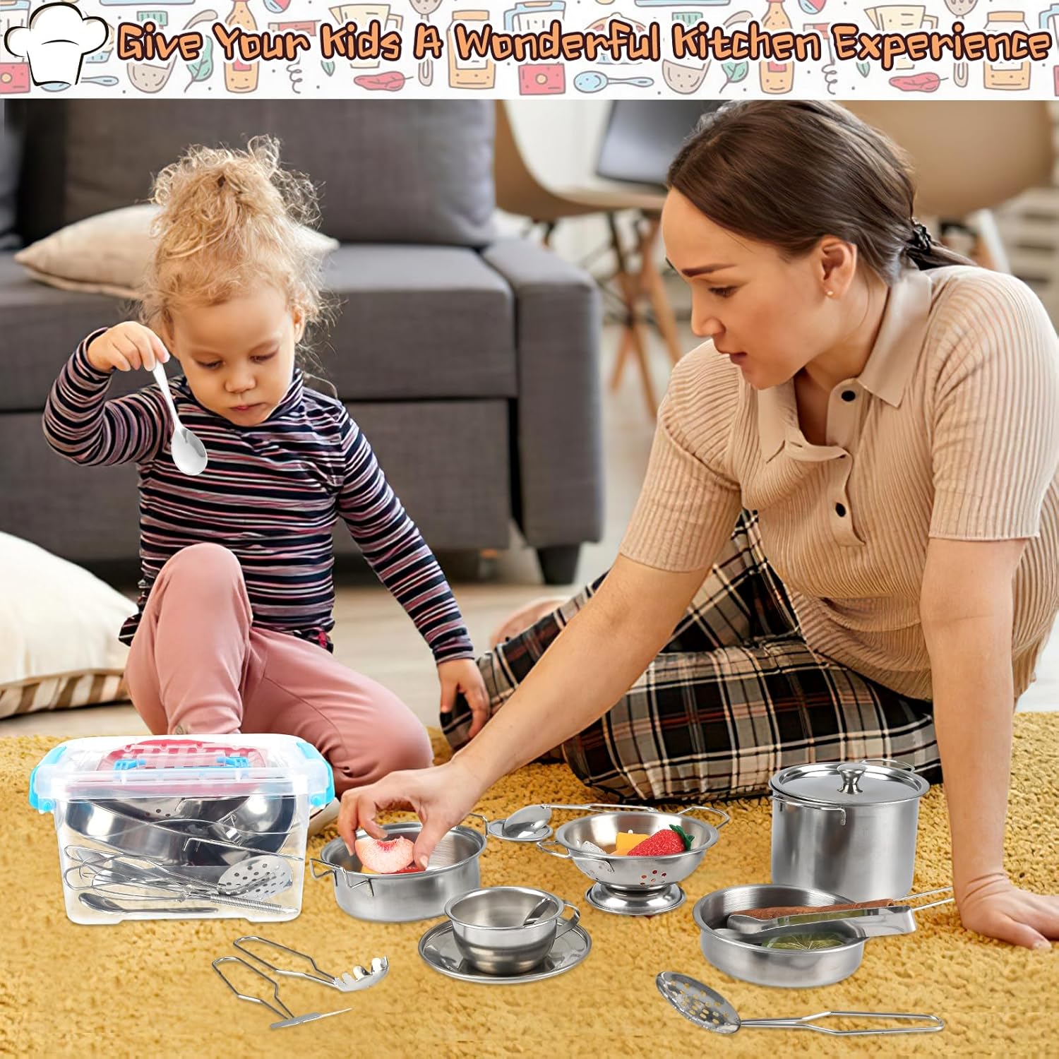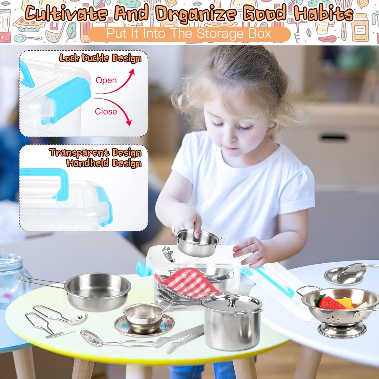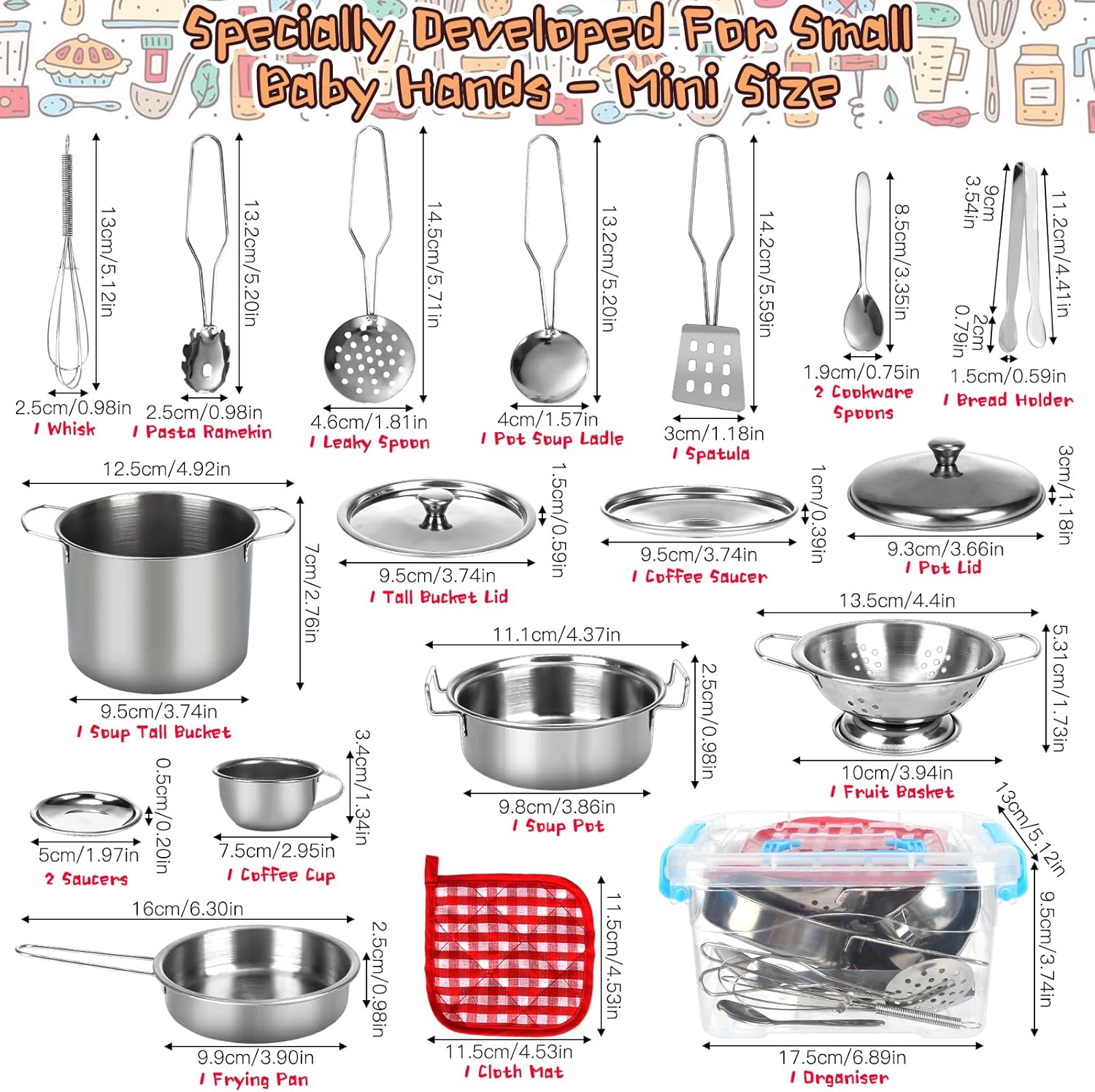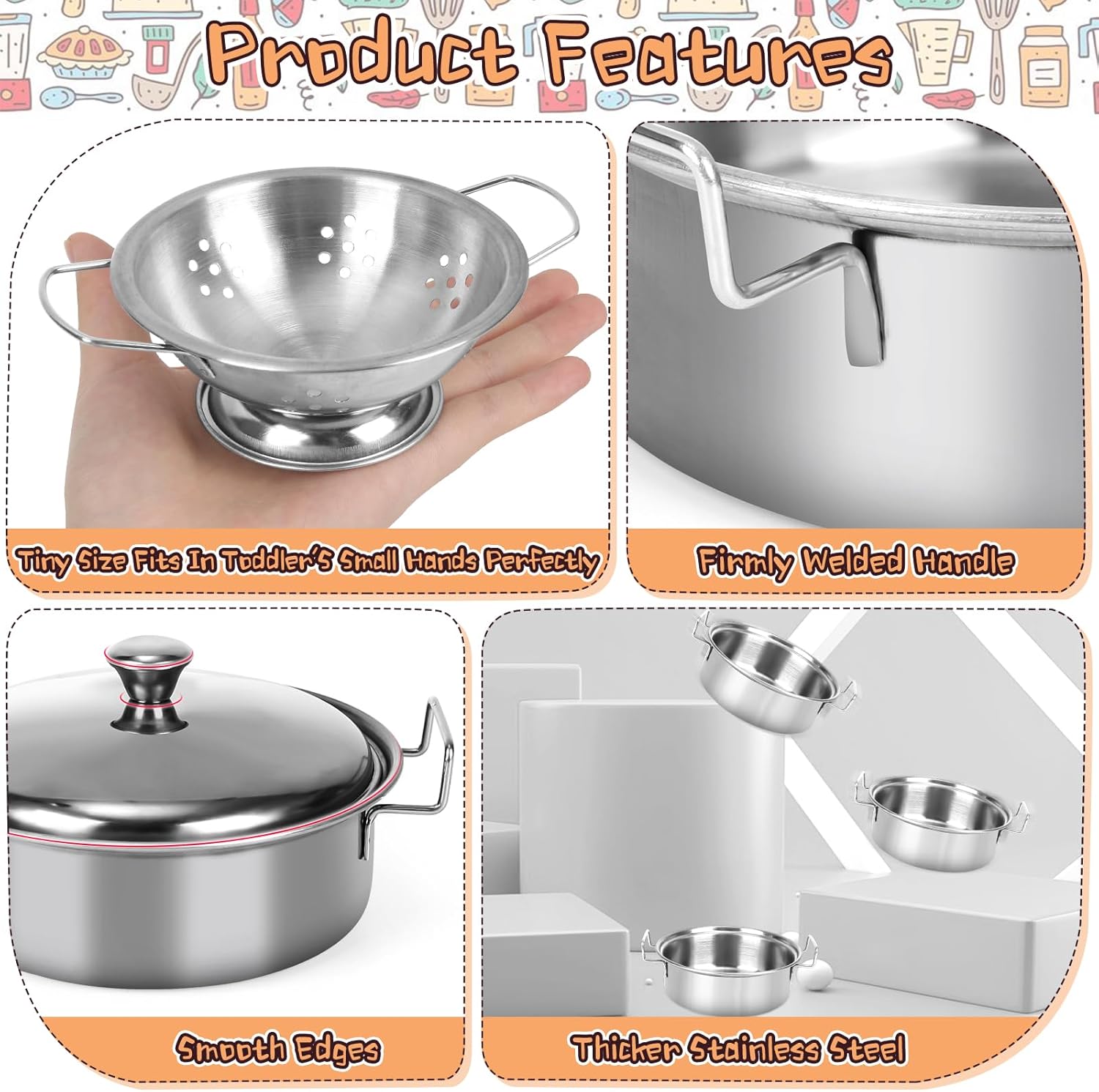Set di accessori da cucina per bambini: accessori per la cucina giocattolo composto da un totale di 20 pezzi, tra cui 1 clip per pane, 1 tazza da caffè, 1 piatto da caffè, 2 piatti, 1 coperchio, 1 pentola per zuppa, 1 pentola per zuppa, 1 coperchio alto, 2 cucchiai da cucina, 1 cucchiaio da zuppa, 1 colino, 1 spatola, 1 batticuova. fer, 1 padella anne, 1 cesto per frutta, 1 paletta per pasta, 1 tappetino in tessuto e 1 scatola portaoggetti. Un'offerta ampia e diversificata che soddisfa le esigenze dei bambini Materiale in acciaio inossidabile: il nostro set di accessori da cucina per bambini è realizzato in acciaio inossidabile per uso alimentare, spesso lucidato a mano, che può essere utilizzato come vera tavola nella vita quotidiana. Manico che prende il processo di saldatura, durevole e non facile da rompere. Lavabile in lavastoviglie. Bordi lisci senza innocui per le mani piccole Dimensioni corrette: il nostro set di pentole e padelle per bambini lucenti starà benissimo in ogni cucina. Mini formato appositamente progettato per i bambini, più facile da afferrare per le mani piccole e più divertente da giocare. Il set di accessori da cucina giocattolo può essere utilizzato in giochi di ruolo, cucina reale e altre scene. Gli accessori da cucina per bambini possono soddisfare le esigenze di cucina dei piccoli cuochi. Aiuta i bambini a riconoscere e imparare a utilizzare diversi utensili da cucina e utensili da cucina Giocattolo da cucina classico: i giochi di ruolo sono importanti per i bambini per stimolare la loro immaginazione. I bambini possono simulare un processo di cottura attraverso un accessorio da cucina per bambini, migliorare la coordinazione occhio-mano, condividere e abilità sociali. Non si tratta solo di fingere i giocattoli, ma anche di preparare piatti veri per i bambini Set regalo ideale: con accessori da cucina per bambini, pentole e padelle, questo accessorio da cucina per bambini è sia carino che pratico. Con il set di accessori da cucina per bambini i bambini possono entrare nel ruolo di uno chef e imparare a cucinare con i loro amici Un ottimo accessorio da cucina per bambini, regalo per ragazze e ragazzi per compleanni, Ringraziamento, Natale e Capodanno