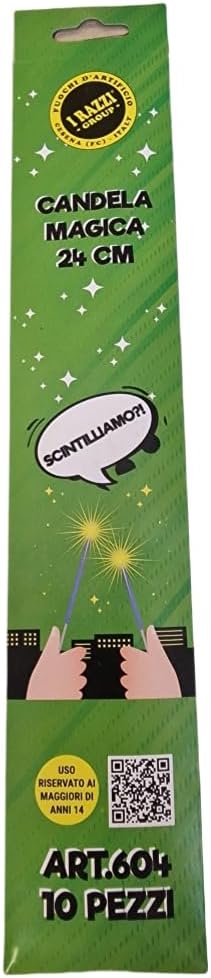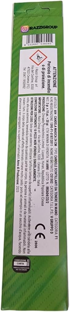Quantità 20 pezzi Effetti Spettacolari: Quando accese, le candele rilasciano bellissimi effetti di luce e scintille, creando un'atmosfera magica e festosa. Categoria fuochi di artificio F1 candele magiche da 24cm producono scintille luminose e scintillanti, perfette per matrimoni, compleanni e Capodanno.