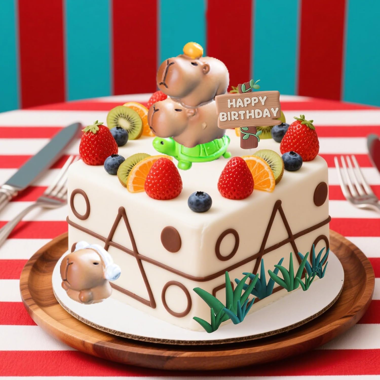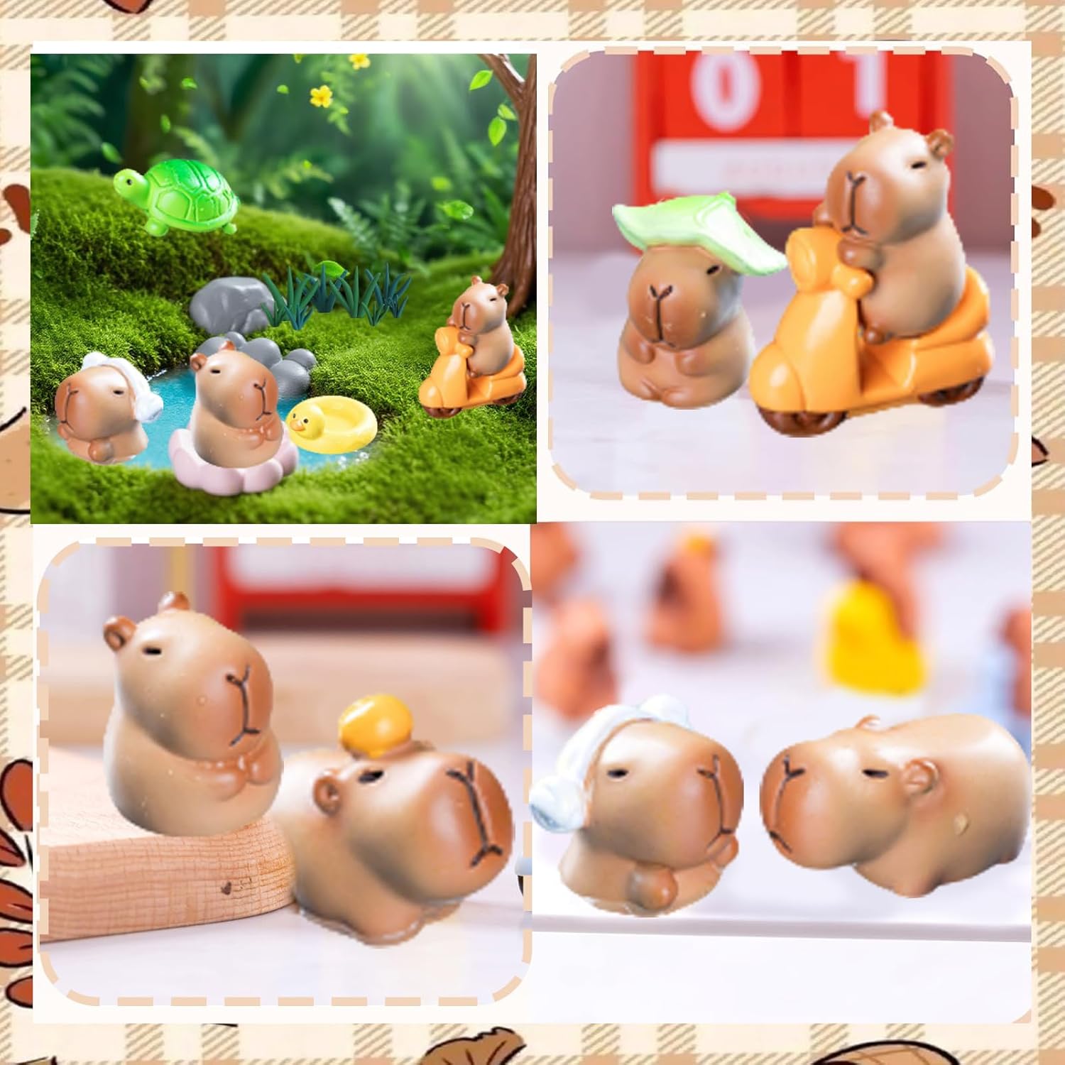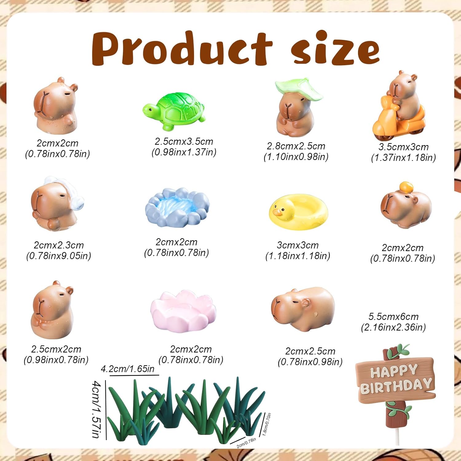 Materiale di alta Qualità: Questo decorazioni torta è realizzato in resina di alta qualità, con un'ottima stabilità, non sbiadisce, non si deforma o si danneggia facilmente, può essere conservato a lungo e riutilizzato più volte. Decorazioni per torte è la scelta ideale per decorazioni da dessert per festival, compleanni o altre celebrazioni Design Accattivante: Questo decorazioni torte adotta un grazioso design cartoon, le linee generali sono rotonde e graziose, le espressioni sono vivide e giocose, piene di infantilismo e immaginazione. Ogni decorazione torta compleanno è stato accuratamente scolpito, non solo mostrando le caratteristiche della personalità gentile e carina del capibara, ma aggiungendo anche un pieno senso di tenerezza Facile da Usare: Il nostro topper torta compleanno è facile da montare e pronto all'uso. Basta aprire la confezione per decorare la torta immediatamente. Questi cake topper lasceranno ricordi indimenticabili per la tua festa! Molto adatti per un utilizzo rapido e semplice con i prodotti capibara Contenuto della Confezione: Il nostro set topper torta include decorazioni capibara X7, erba X8, tartaruga X1, base di loto X1, salvagente X1, piscina X1, cartello stradale di compleanno X1, per un totale di 20 pezzi. Decorazioni compleanno aggiunge un tocco giocoso alle attività della tua festa di compleanno ed è la scelta ideale per feste a tema e occasioni speciali Ampia Gamma di Usi: Decorazione torta di compleanno per bambini è molto versatile e può essere utilizzato per torte di compleanno, muffin, piatti di frutta, cupcake, tavoli da dessert e altre decorazioni. Decorazione torta può essere utilizzato anche per mini giardini delle fate, decorazioni per la casa, scrivanie per computer o ovunque tu voglia decorare
