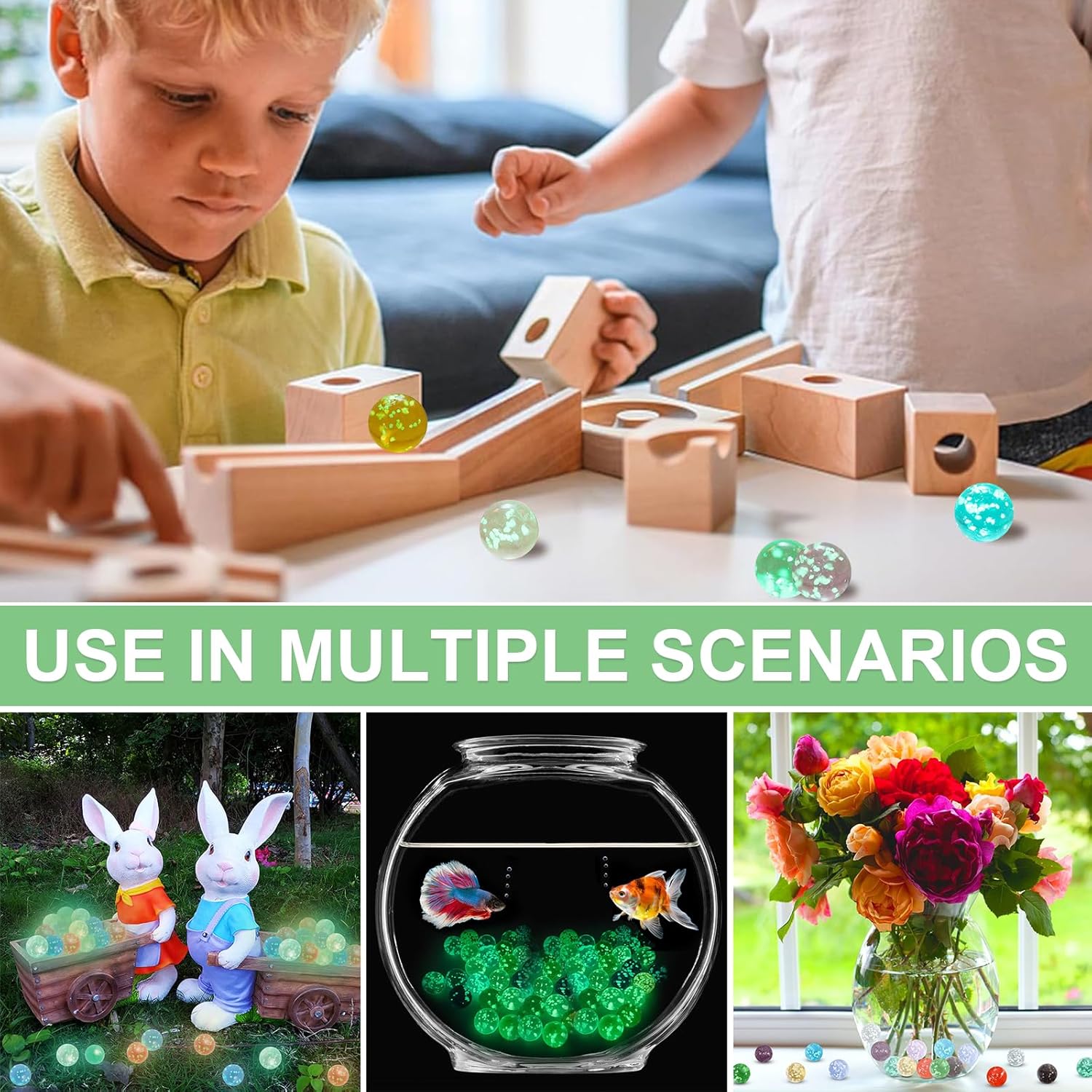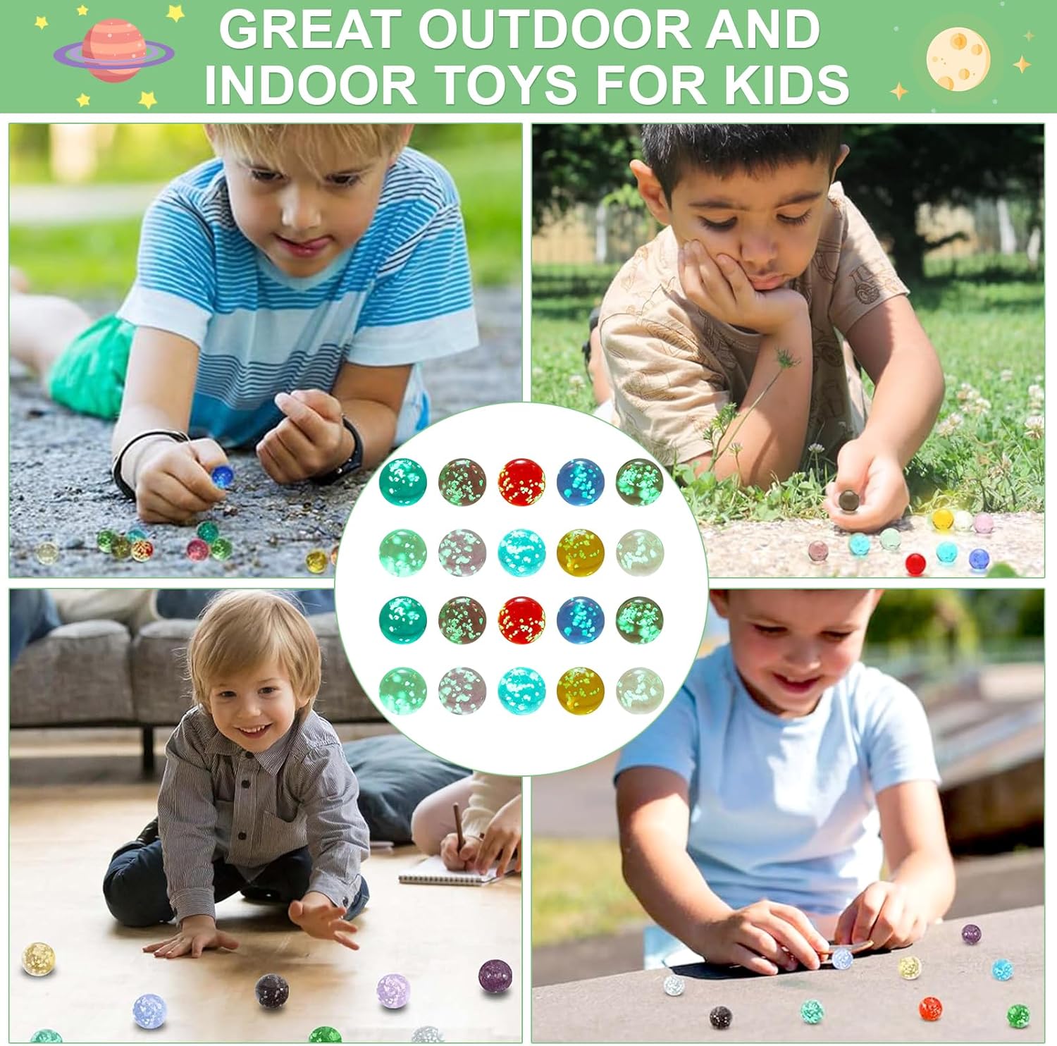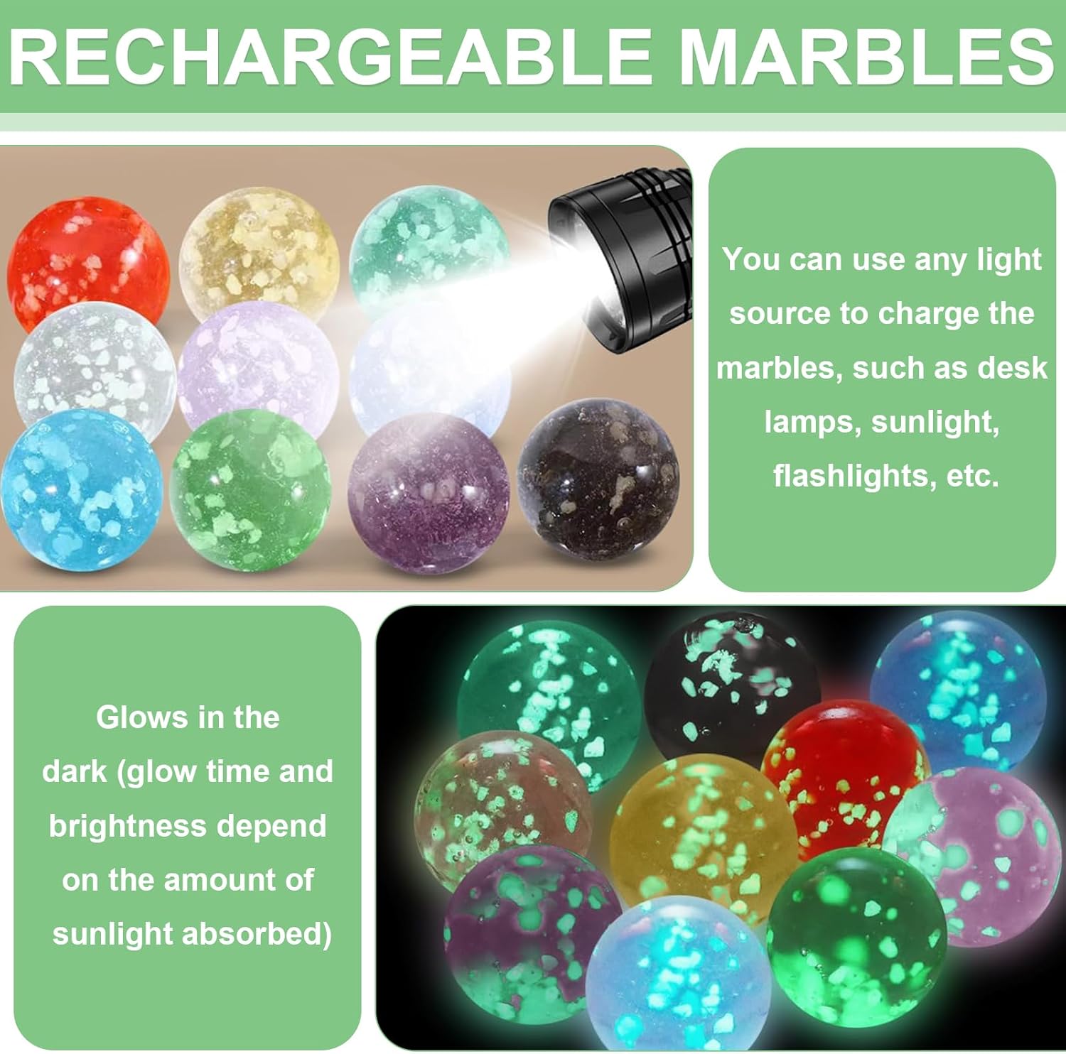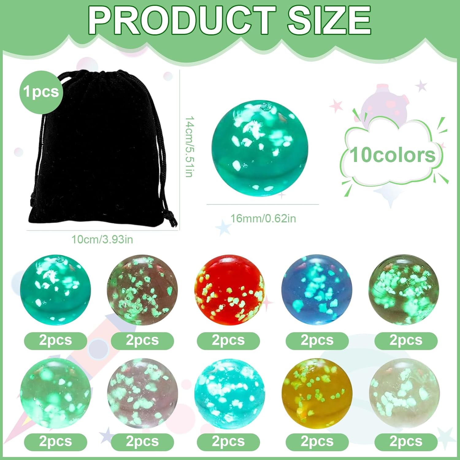 【Contenuto della Confezione】La confezione contiene 20 biglie in 10 colori diversi, ogni colore viene fornito con 2 biglie di vetro. Include Verde frutta, viola, rosso, blu zaffiro, grigio fumo, verde, rosa, blu lago, dorato, trasparente. Inoltre, viene fornito con una borsa in velluto con cordoncino, morbida al tatto, facile da organizzare e trasportare, e garantisce che le biglie rimangano in ordine e non vadano perse. 【Materiale di Alta Qualità】I proiettili di vetro colorato sono realizzati in vetro di alta qualità e sono finemente lucidati per garantire una superficie liscia e un rotolamento regolare. Robusto e anticaduta, non si danneggia facilmente dopo un uso a lungo termine. Il materiale luminoso sigillato ed ecologico incorporato è atossico e innocuo, consentendo ai bambini di divertirsi pur essendo sicuri e senza preoccupazioni. 【Si Illuminano Nella Notte】A differenza dei normali giocattoli che si illuminano al buio, l'effetto luminoso delle nostre biglie di vetro può essere attivato rapidamente e facilmente, senza la necessità di strumenti o prodotti chimici aggiuntivi. Semplicemente esposto alla luce naturale o alle lampade, assorbe rapidamente la luce e la trasforma in uno straordinario effetto luminoso. Non importa dove ti trovi, puoi facilmente portare gioia luminosa ai tuoi figli. 【Facile e Portatile】 Dì addio ai giocattoli ingombranti e complicati. Le biglie di vetro per bambini sono piccole e leggere e stanno facilmente in una tasca o in una piccola borsetta senza aggiungere peso o occupare spazio. Non è solo un compagno di giochi intimo per i bambini, ma anche un ponte attraverso il quale i bambini possono condividere la felicità. Le risate passano tra amici, le amicizie si scontrano in gare di abilità e la felicità non finisce mai. 【Ampia Applicazione】Adatto a vari giochi di biglie, come piste di biglie e giochi di biglie tradizionali, e può essere utilizzato anche per l'artigianato, la decorazione della casa e dell'acquario. I giochi possono allenare la coordinazione occhio-mano dei bambini, stimolare l'immaginazione e la creatività, ridurre lo stress e le preoccupazioni e rendere l'infanzia spensierata. Questo è anche un ottimo regalo per sorprendere i tuoi bambini.
