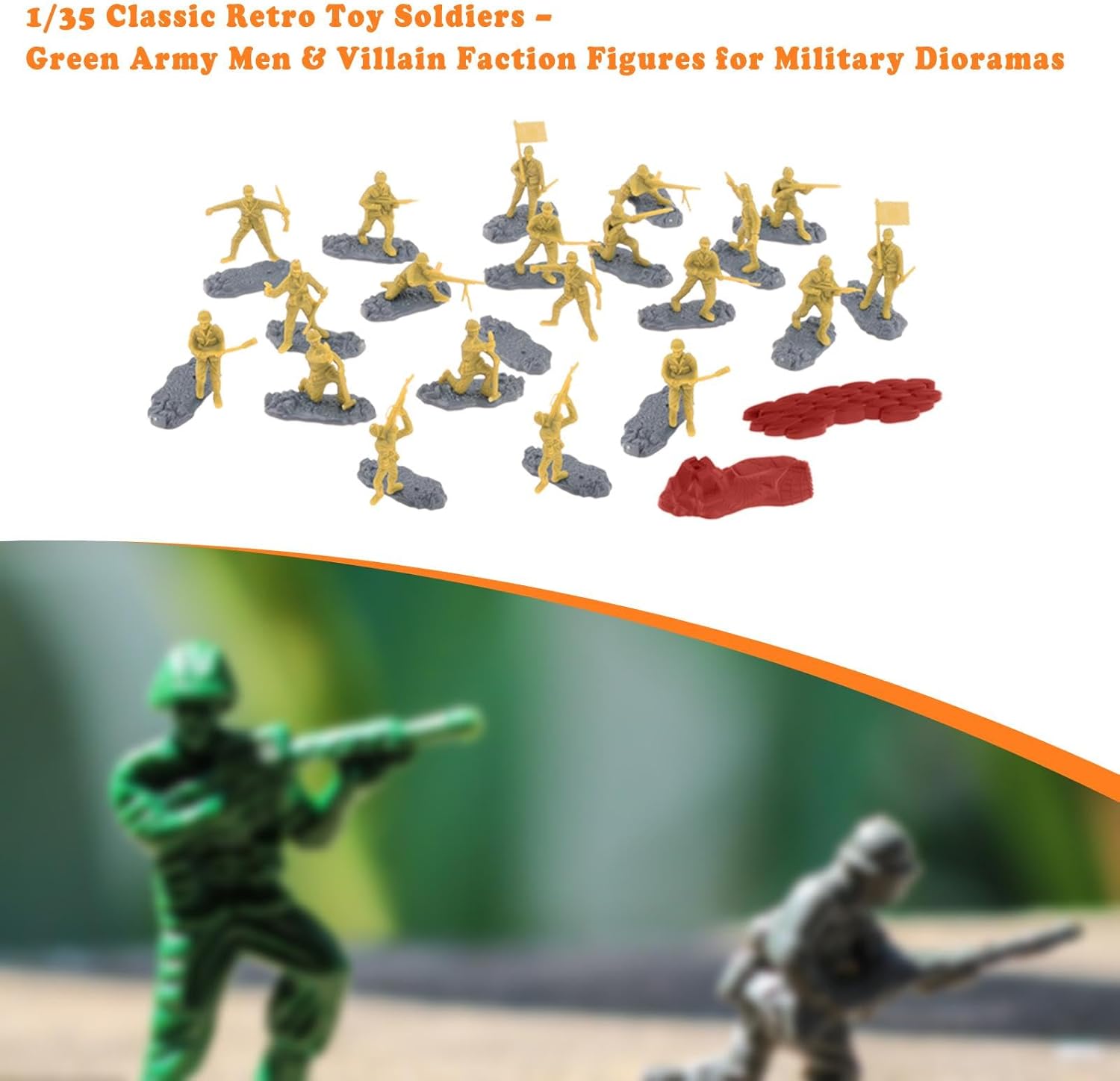 【Giocattolo educativo】: Questo set di mini soldatini è un ottimo strumento educativo per imparare dei soldati e può essere combinato con altri giocattoli per un divertimento senza fine 【Set completo con accessori】: il pacchetto include 18 mini soldati e 2 modelli di bunker, fornendo tutto il necessario per creare scene di battaglia dinamiche 【Set di gioco coinvolgente】: questo classico set di modelli di soldatini giocattolo in scala 1/35 offre un'esperienza di gioco a tema accattivante, consentendo ai bambini di esplorare e comprendere dei soldati attraverso varie forme 【Dimensioni adatte alle manine】: ogni soldato è alto circa 4-5 cm/1,57-1,97 pollici, il che lo rende della dimensione ideale per i bambini piccoli da maneggiare comodamente durante il gioco. 【Materiale Premium】: Realizzati in PP di qualità, questi modelli di soldati in scala 1:35 sono progettati per resistere a ore di gioco mantenendo il loro aspetto dettagliato