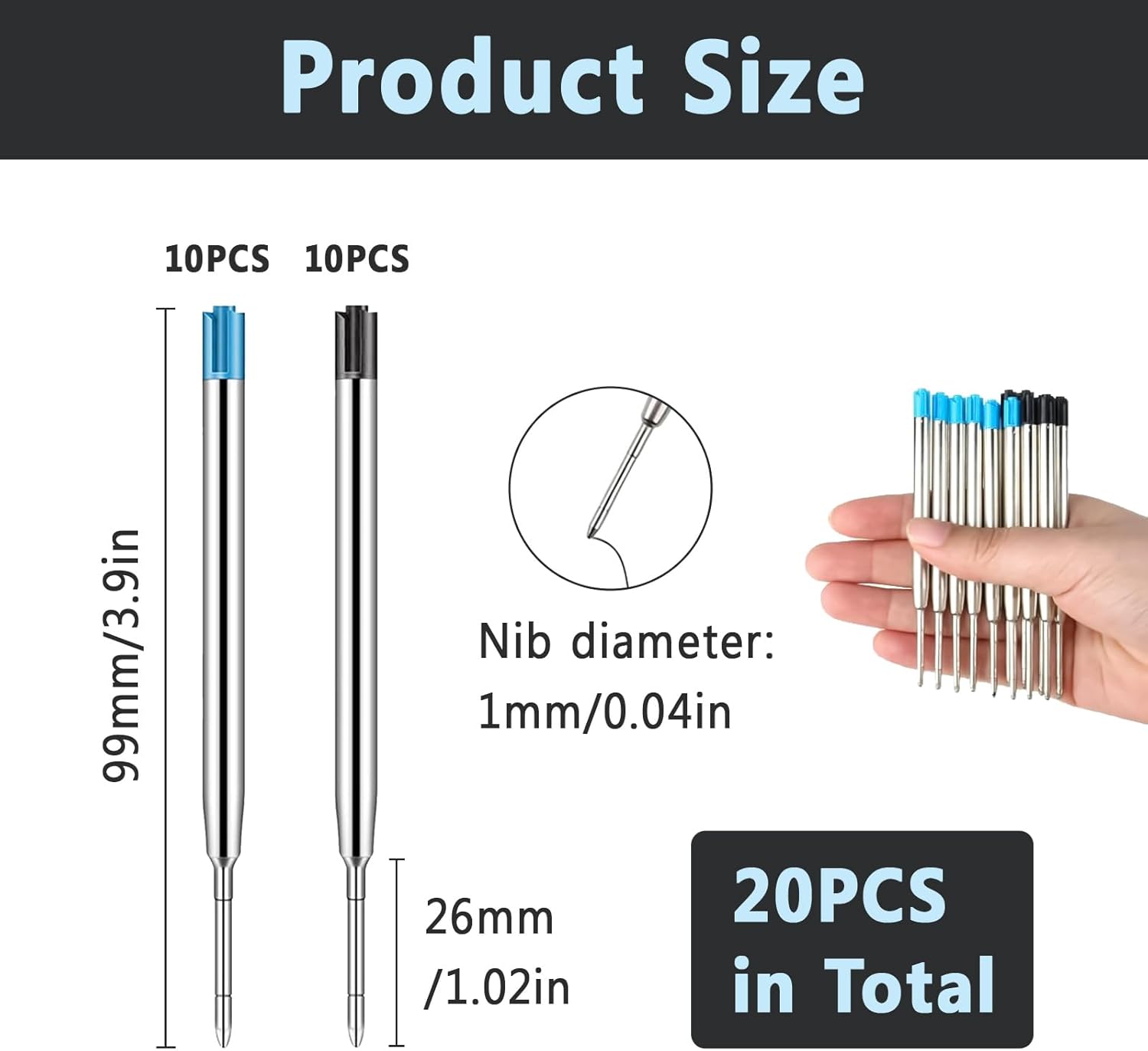 Compatibilità Universale: Queste ricarica penna sono compatibili con la maggior parte delle penne G2. Ogni refill da 1mm assicura un'ottima prestazione di scrittura, ideale per uso quotidiano e per ogni tipo di documento. Scrittura Fluida e Senza Interruzioni: Refill penna a sfera L'inchiostro scorre uniformemente sulla carta, garantendo una scrittura chiara e continua. Le ricariche offrono un'esperienza di scrittura senza sbavature, perfetta per professionisti e studenti. Asciugatura Rapida: Il flusso di inchiostro rapido e omogeneo asciuga velocemente, evitando sbavature. Perfette per chi ha bisogno di scrivere velocemente e mantenere le mani pulite durante l'uso. Portatile e Pratico: Ogni ricariche penne ha una lunghezza di 9,9 cm e un peso di 3,1 g, rendendola facile da trasportare e perfetta per essere riposta nella tua custodia per penne o in una tasca. Ottimo per chi è sempre in movimento. Ottimo Rapporto Qualità-Prezzo: Questo set include 10 ricariche blu e 10 nere, offrendo una soluzione conveniente per mantenere sempre pronte le tue penne a sfera, riducendo al minimo la necessità di acquisti frequenti.