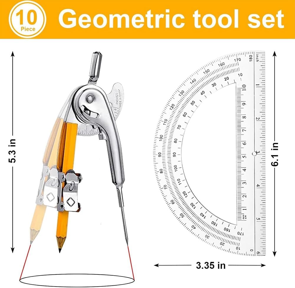 [Contenuto della confezione] Riceverai un set di 20 compassi geometrici, la confezione include 10 compassi geometrici e 10 goniometri per geometria, queste quantità sono sufficienti per l'uso e la sostituzione, puoi anche condividerle con altre persone, come studenti, insegnanti, ingegneri, , artisti e altro ancora [Materiali di qualità] La bussola in metallo è realizzata con materiali metallici di qualità e il goniometro adotta una plastica, che non si deforma o si rompe facilmente, la bussola matematica per la geometria adotta una tecnologia, in modo che gli ingranaggi di ciascun componente siano strettamente ingranati e non facili da allentare, potresti usarli per molto tempo [Facile da usare] Il goniometro trasparente consente di vedere facilmente le parole, le lettere e le cifre pagina, il che è da usare, l'intervallo da 0 a 180 gradi soddisferà la maggior parte delle tue esigenze [Informazioni sulle dimensioni] la lunghezza del compasso da disegno è di circa 5 pollici e il diametro del goniometro per la scuola è di circa 6 pollici, sono leggeri e facili da trasportare e sono adatti alla maggior parte delle persone da [Strumenti di misurazione e disegno] Il set di compassi goniometrici è necessario per matematica, arte e altro ancora, puoi usarli per misurare gli angoli, disegnare gli angoli e altri lavori come vuoi, offrendoti una piacevole esperienza d'uso