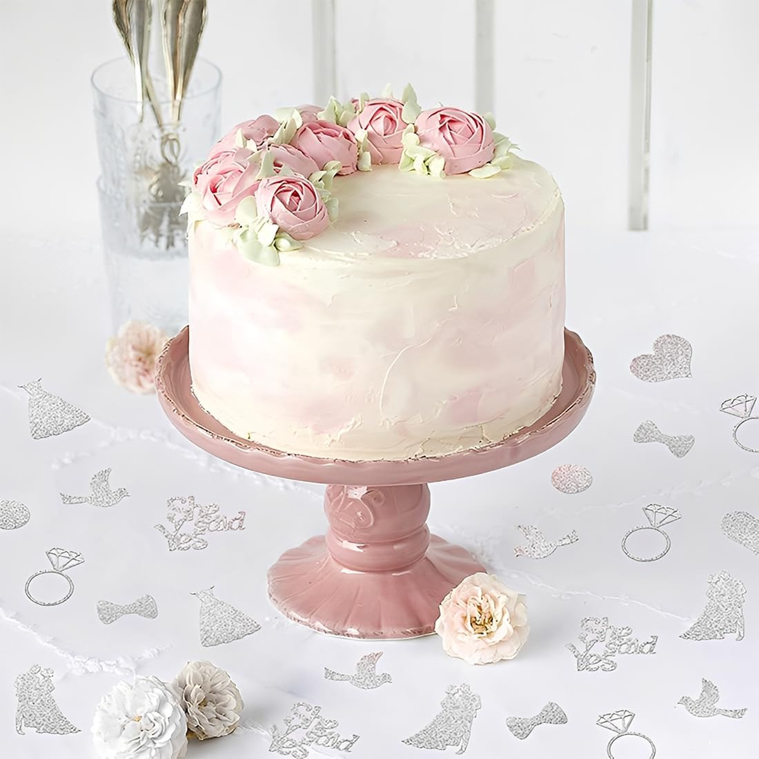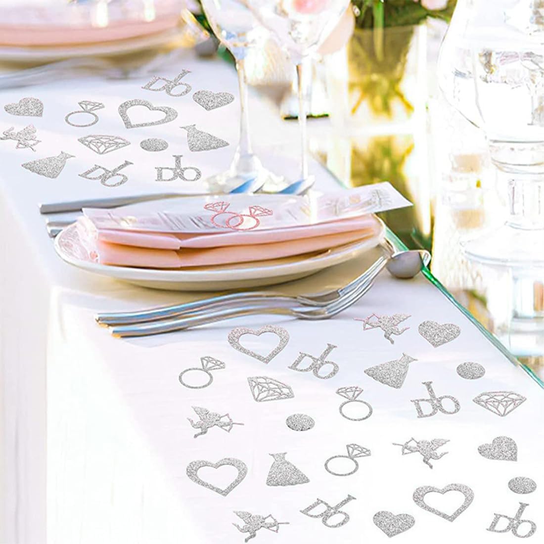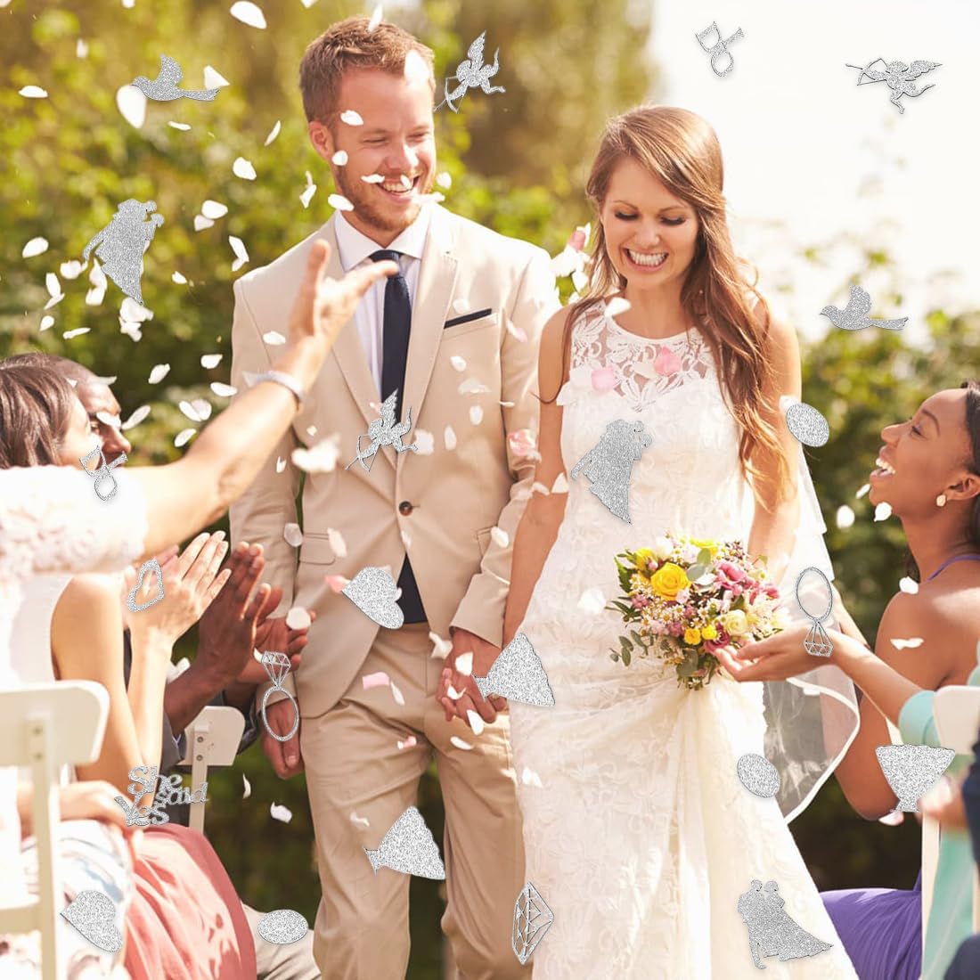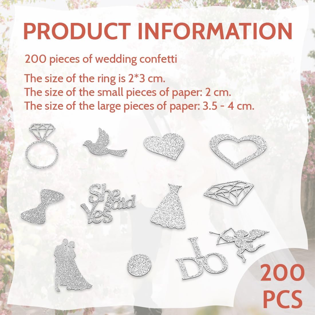 200 decorazioni glitterate per matrimonio in argento: contiene 200 motivi nuziali come anelli (2 × 3 cm), cuori, abiti da sposa, "SÌ," ecc. Gli elementi glitterati scintillanti creano un'atmosfera romantica sul tavolo nuziale, sul pavimento e sulla navata, creando uno sfondo da sogno. Diversi elementi romantici: includono simboli classici del matrimonio come Cupido, diamanti, "Ha detto sì", ecc. Disponibili in dimensioni piccole (2 cm) e grandi (3,5-4 cm), possono essere distribuiti sul tavolo della torta e sui posti a sedere degli ospiti per creare un'atmosfera dolce con piccoli dettagli e aggiungere un tocco celebrativo al matrimonio. Accessori facili da disporre: non è richiesta alcuna installazione complicata, basta spargerli sul tavolo, sul pavimento o nell'area ricevimento. Le paillettes sono leggere e non scivolano. Quando vengono fotografate, ricadono sulle spalle e decorano gli orli delle gonne, aggiungendo un effetto vibrante alle foto del matrimonio e catturando momenti indimenticabili. Adatto a molte occasioni: oltre a cerimonie nuziali e banchetti nuziali, sono adatti anche per feste di fidanzamento, addio al nubilato e altre occasioni. La lucentezza argentata si adatta a vari stili di matrimonio (occidentale, semplice, lussuoso, ecc.) e impreziosisce l'evento. Conserva dolci ricordi: le paillettes sono riciclabili e possono essere raccolte e conservate come ricordo dopo il matrimonio. Gli ospiti possono partecipare alla distribuzione delle paillettes, creando un'atmosfera gioiosa e creando ricordi romantici e indimenticabili per gli sposi, i loro amici e familiari.