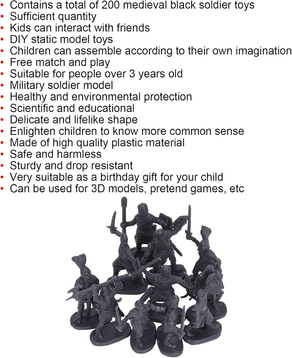 Quantità sufficiente: la confezione contiene un totale di 200 giocattoli medievali del soldato nero, una quantità sufficiente può soddisfare le esigenze di tuo figlio di interagire con gli amici. Abbinamento: giocattoli modello statici fai-da-te, i bambini possono assemblare secondo la propria immaginazione, abbinare e giocare, adatti a persone di età superiore a 3 anni. Giocattoli educativi: il modello del soldato militare, ecologico, scientifico ed educativo, può illuminare i bambini a conoscere più conoscenze militari. Realistico: questi soldati sono molto delicati e realistici, realizzati in materiale plastico, sicuri e innocui, robusti e resistenti alle cadute e possono essere utilizzati a lungo. Il : questo set di soldatini è molto adatto come di compleanno per il tuo bambino e può essere utilizzato per modelli tridimensionali, giochi di finzione, ecc.