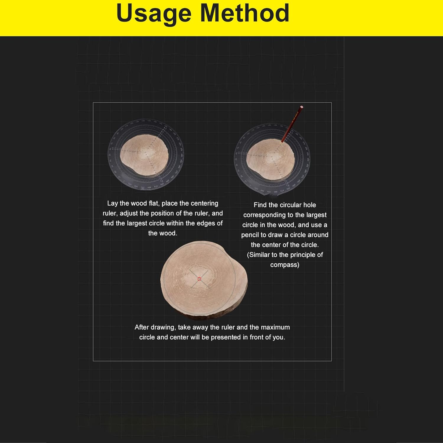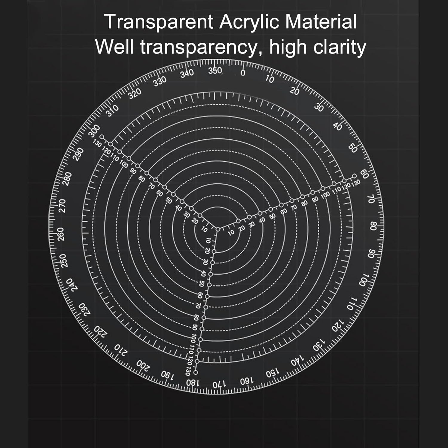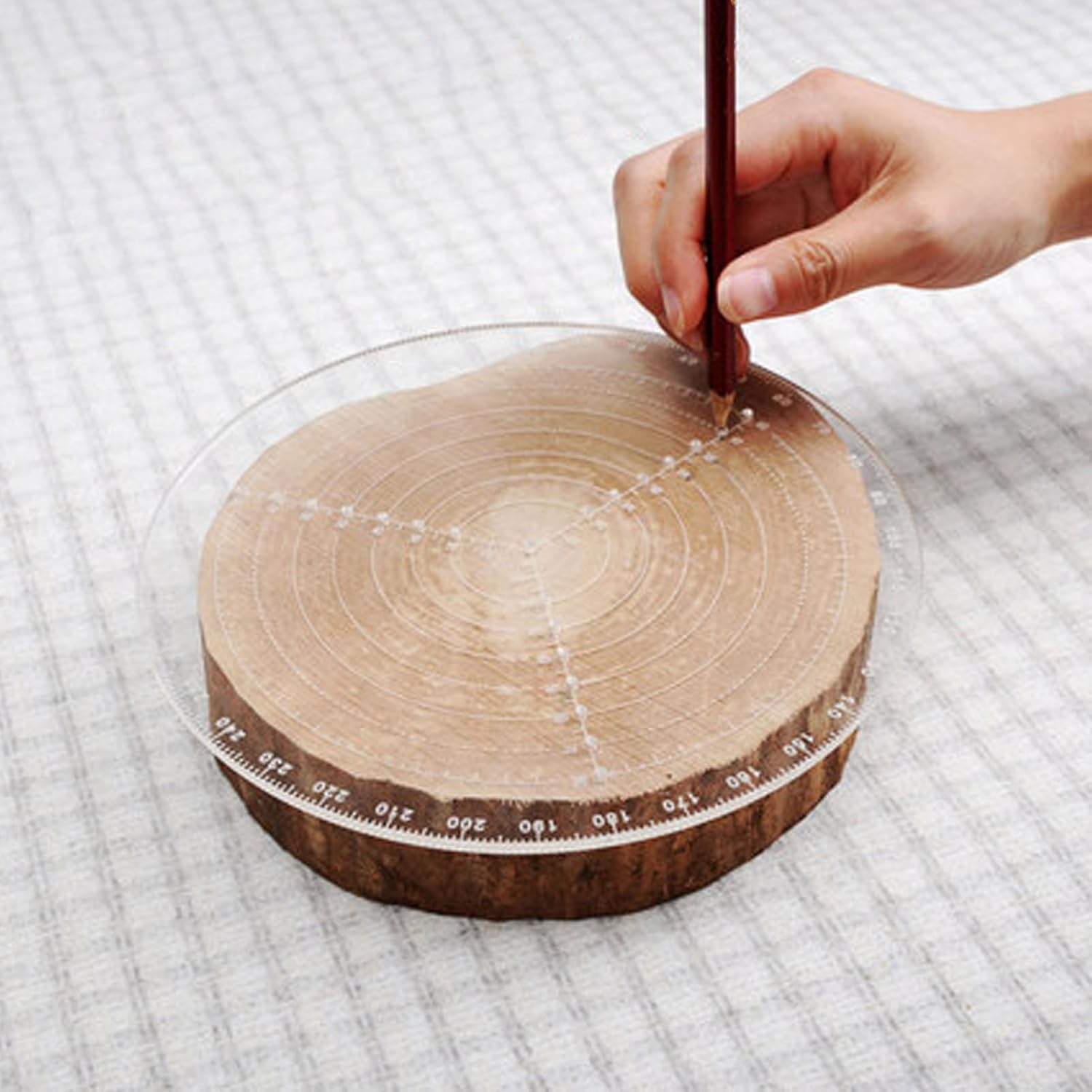 Circle Center Finder: Quickly locate the exact center of round or irregular objects to avoid wasted material and speed setup; this precision round center finder and centering compass lets woodturners mark true centers for boring, drilling, or lathe work with repeatable accuracy and less rework. Versatile Marking and Sizes: With a large 200mm diameter plate and multiple graduated holes, this circle center finder compass lets you scribe a wide range of circle sizes and transfer layouts directly to workpieces; the clear engraved scale simplifies radius selection for accurate circle marking and layout tasks. Acrylic Durable Construction: Molded from thickened, high-clarity acrylic, the circle template resists chips and offers long service life while keeping markings visible; the robust acrylic material provides stable rigidity and the printed graduations remain legible for precise wood centering over repeated shop use. Simple To Use Operation: Insert the center pin through the chosen center hole, place a pencil in the selected scribing aperture and rotate steadily to draw ideal circles; this user-friendly compass design speeds setups and is ideal for beginners and pros needing reliable center finding on various parts. Wide Applications And Compatibility: Designed for woodworking, woodturning, model making, and classroom projects, this round center finder works on wood, plastics, poster board, and thin metal; a versatile shop aid for the lathe bench that improves accuracy for drilling, inlay, and decorative circle work and CNC prep.