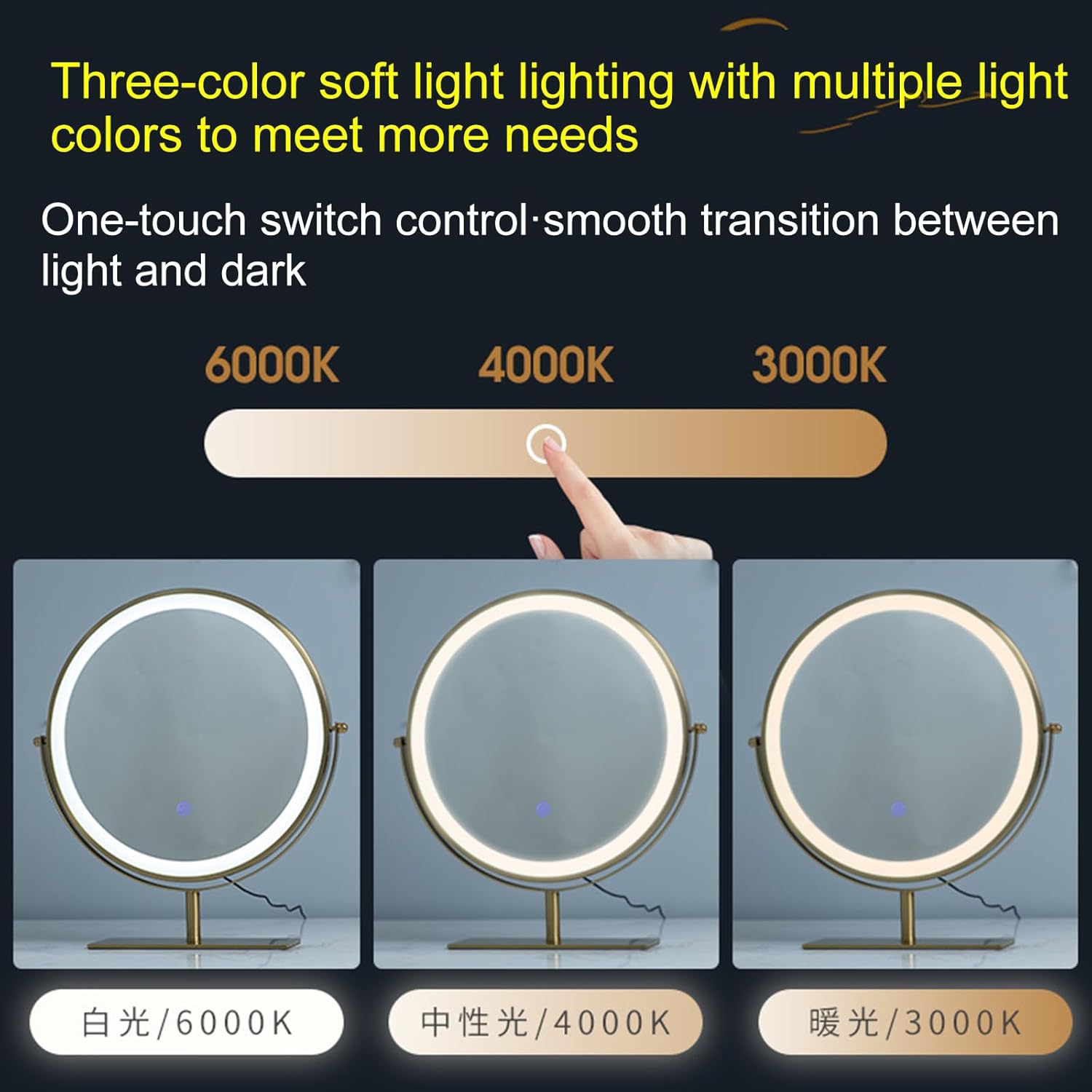 2024 Nuovo Specchio cosmetico con luci a LED, Specchio per Trucco dimmerabile con Illuminazione a 3 Colori, Controllo Touch, Rotazione a 360° per Piano della Camera da Letto,A,50CM