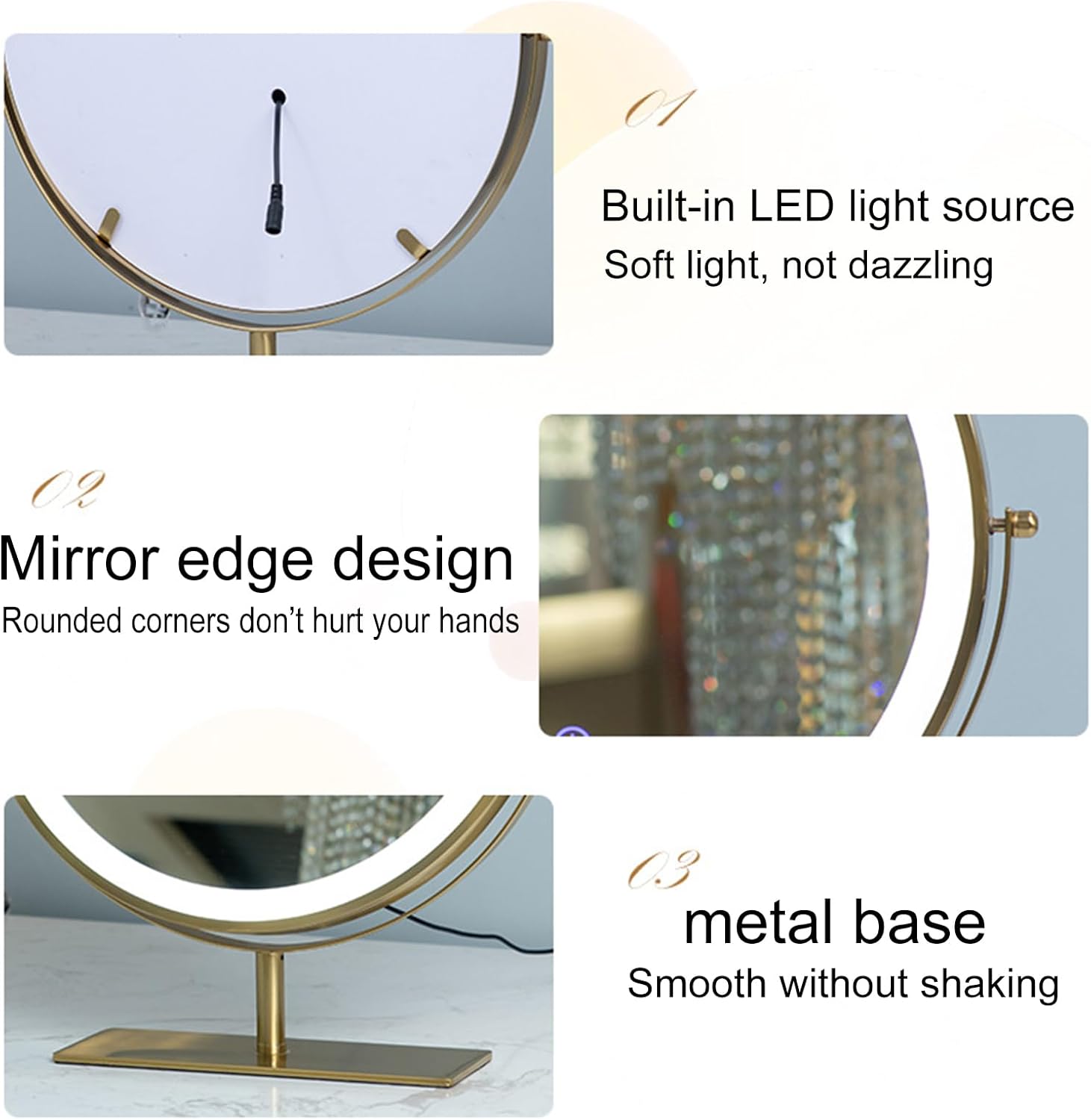 Nome: specchio per il trucco rotondo a LED da tavolo Materiale: struttura in ferro battuto + specchio argentato ad alta definizione + alta definizione Colore della sorgente luminosa: luce bianca/luce naturale/luce gialla Metodo di controllo: tocco intelligente dello specchio Funzione: specchio ad alta definizione, sorgente luminosa a tre colori, tocco intelligente, protezione per gli occhi a luce soffusa, rotazione a 360 gradi Il pacchetto include: 1x specchio per il trucco Appunti: Poiché lo specchio è fragile, maneggiarlo con cura. Se danneggi lo specchio quando lo ricevi, ti preghiamo di contattarci in tempo. Collaboreremo attivamente per aiutarti a risolvere il problema. Grazie per la comprensione e il supporto