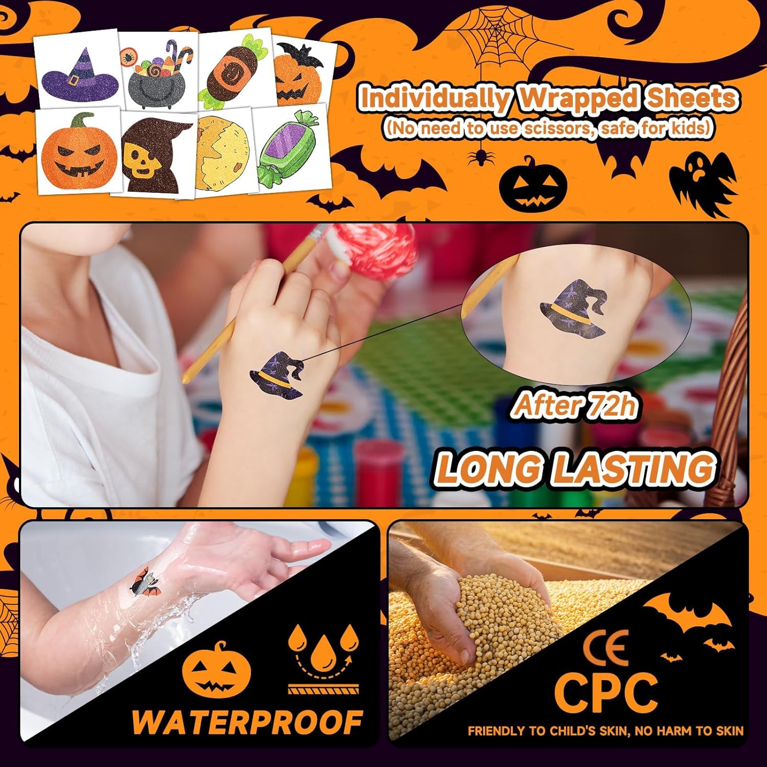 【204 tatuaggi di Halloween confezionati singolarmente】 Preparati a ricevere una dose di magia di Halloween con gli adesivi per tatuaggi glitterati EMOME! 204 fogli di tatuaggi per bambini sono decorati con accattivanti glitter che aggiungono un elemento incantevole a qualsiasi festa di Halloween, tanti elementi come vampiri, fantasmi, ragni, zombie, scheletri e altro ancora! 【Bomboniere per le feste di Halloween】 Questi adorabili tatuaggi temporanei glitterati non sono adatti solo per feste ed eventi di Halloween, ma anche per aggiungere ulteriore brillantezza al tempo di gioco quotidiano. Che si tratti di travestirsi da strega incantevole o da fantasma amichevole, questi adesivi per tatuaggi miglioreranno qualsiasi outfit di Halloween con uno stile abbagliante. 【Materiali premium e sicuri】 I tatuaggi per bambini EMOME sono realizzati con materiali sicuri e non tossici e inchiostro di soia sano, non hanno odori caratteristici e sono sicuri da usare da parte dei bambini. I tatuaggi di Halloween possono essere applicati su mani, braccia, volti o oggetti lisci come bottiglie, lattine, vetro, ecc. La durata dei tatuaggi dei bambini varia a seconda della frequenza con cui vengono lavati e strofinati. 【Metodo di Applicazione e Rimozione】Scegli un motivo e rimuovi la pellicola protettiva, quindi posiziona l'adesivo del tatuaggio finto sulla pelle e premilo con una spugna bagnata per circa 10 secondi. E vedrai tatuaggi fantastici e vivaci. Rimuovilo facilmente con olio d'oliva, alcool o olio per bambini se vuoi cambiarlo o rimuoverlo.