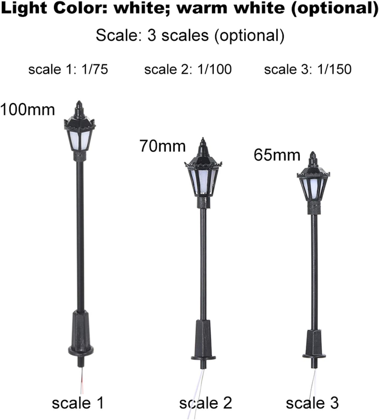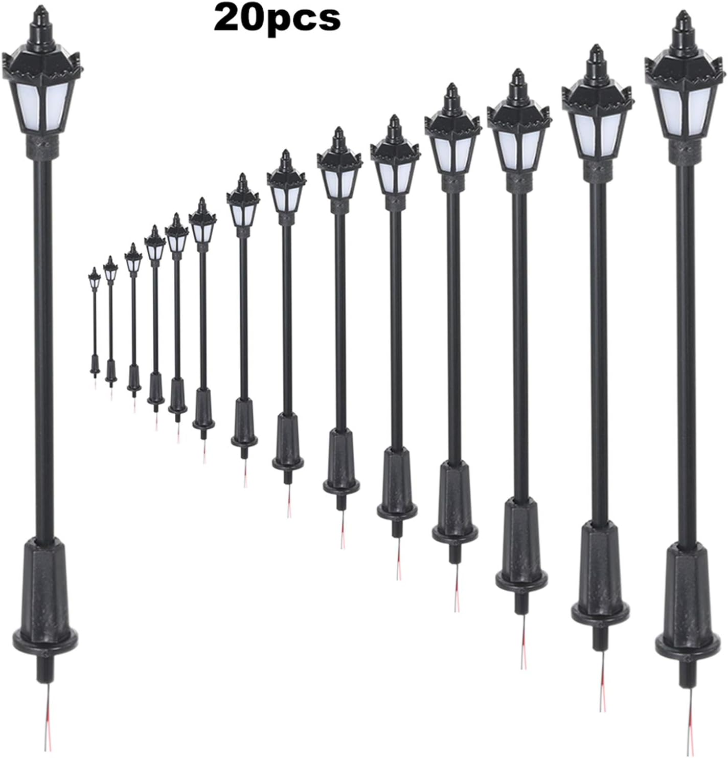 Questi lampioni sono adatti per l'uso solo a tensione di alimentazione di 3V. Questo modello di lampione è bello e l'illuminazione funziona correttamente. Un set di 20 luci per parco giochi stradale o ferroviario. Illumina il tuo layout paesaggistico con questo fantastico lampione modello! Completato con fili e lampadina, perfetto per il paesaggio del modello ferroviario.