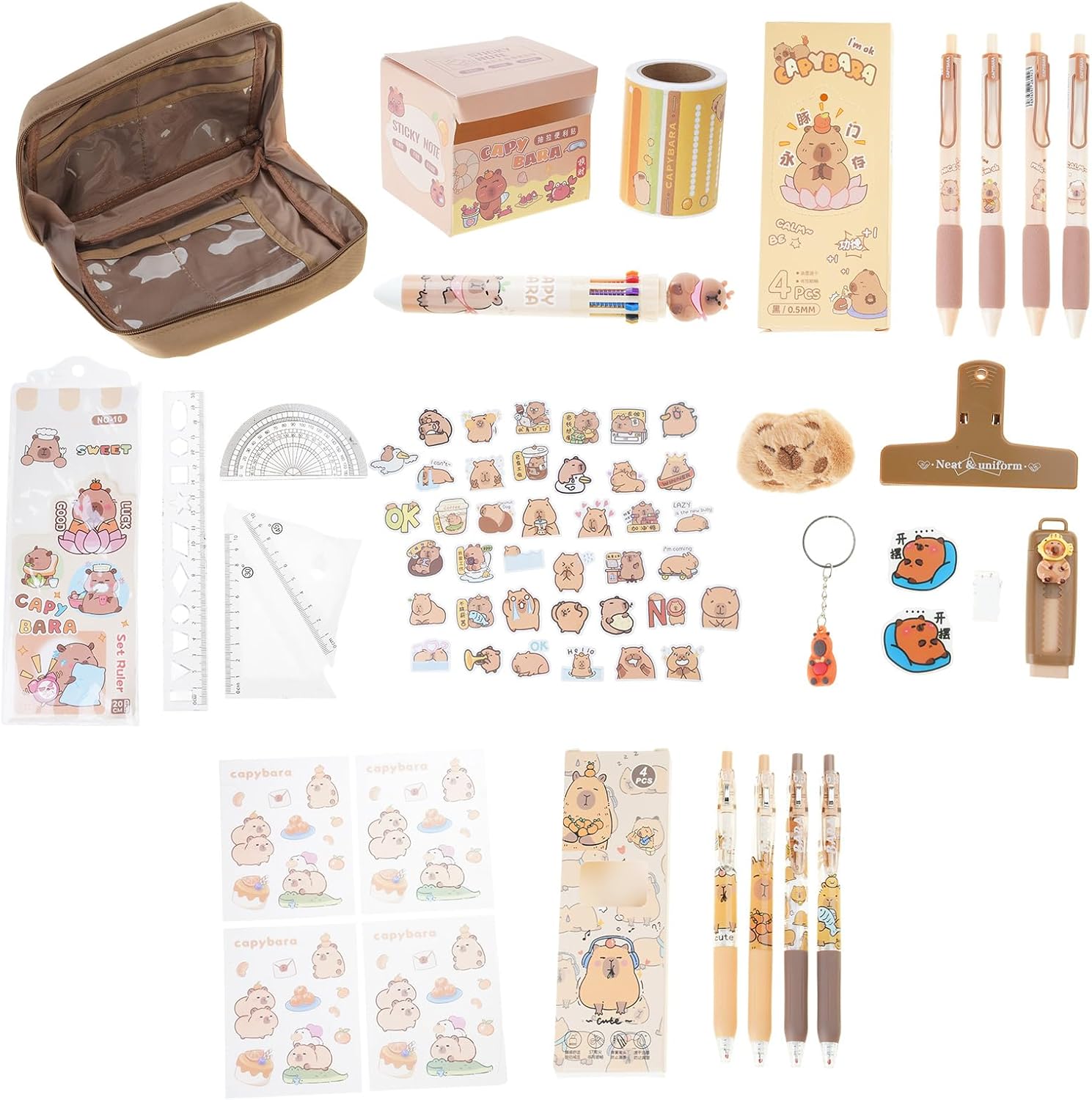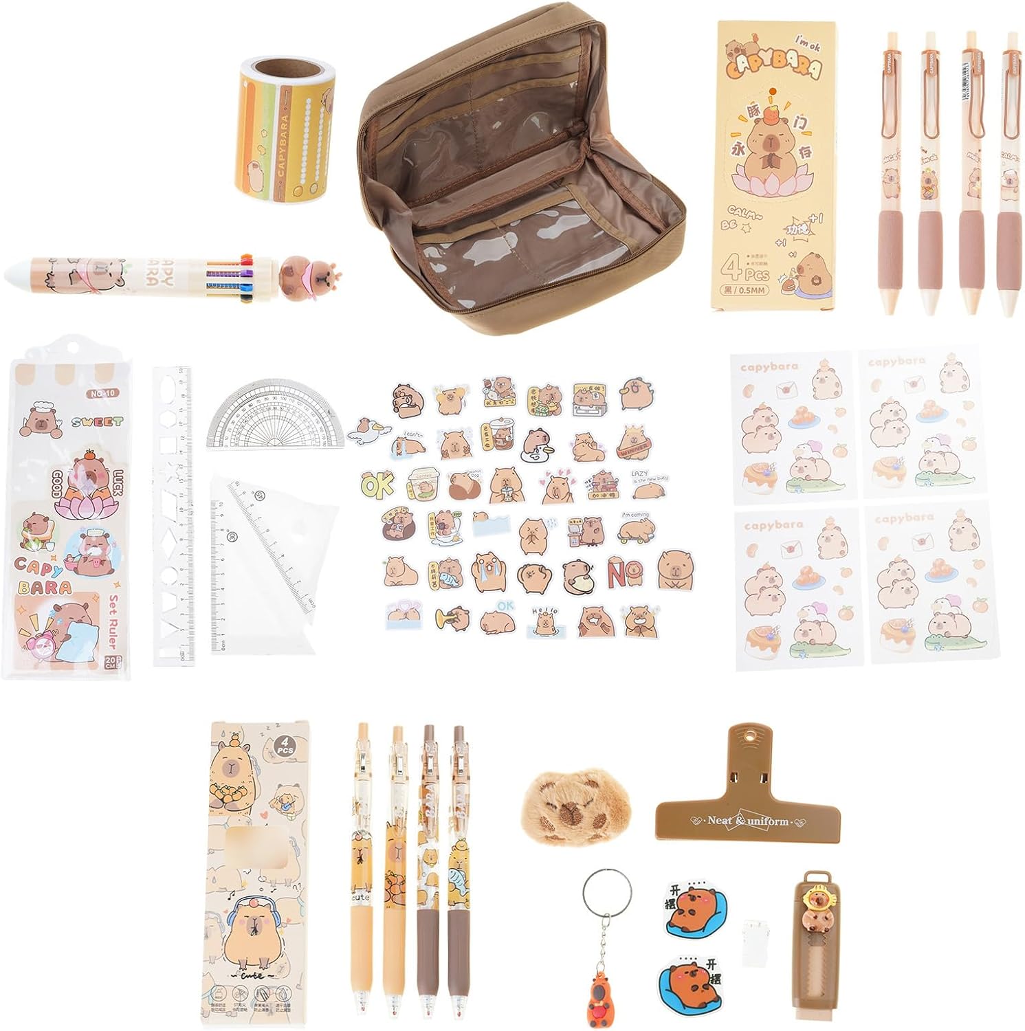 Perfettamente dimensionato per zaini scolastici, i cassetti ufficio o studi d'arte, l'astuccio a forma cartone animato conserva in modo sicuro strumenti scrittura, righelli e gomme da cancellare aggiungendo fascino stravagante alle routine studio e lavoro Questo cartone animato cancelleria per studenti è ottimo per riempire le calze Natale, regalo compleanno per bambini, forniture cancelleria per ritorno a scuola, per giochi per bambini, per l'aula degli studenti Struttura a scomparti multipli e tessuto in tela resistente all'acqua e all'usura, questa cancelleria estetica include materiale scolastico essenziale e strumento scrittura per riporre oggetti multifunzionali Questa cancelleria da 21 combina funzionalità e fascino, con astuccio capacità da 12 scomparti, 8 penne a inchiostri gel retrattili, 10 colori in 1 penna a 1 graffetta magnetica, 4 pinze per cartoni animati, 2 gomme retrattili, 4 strumenti geometria matematica, 30 adesivi, 1 confezione foglietti adesivi, 1 portachiavi con 4 adesivi, 1 spilla, per un'efficiente organizzazione scuola/ufficio Adatta a bambini, studenti, adolescenti, artisti, appassionati journaling e professionisti, questa collezione articoli cancelleria con animali dei cartoni animati supporta progetti creativi quotidiani, attività in classe e esigenze gestione della scrivania
