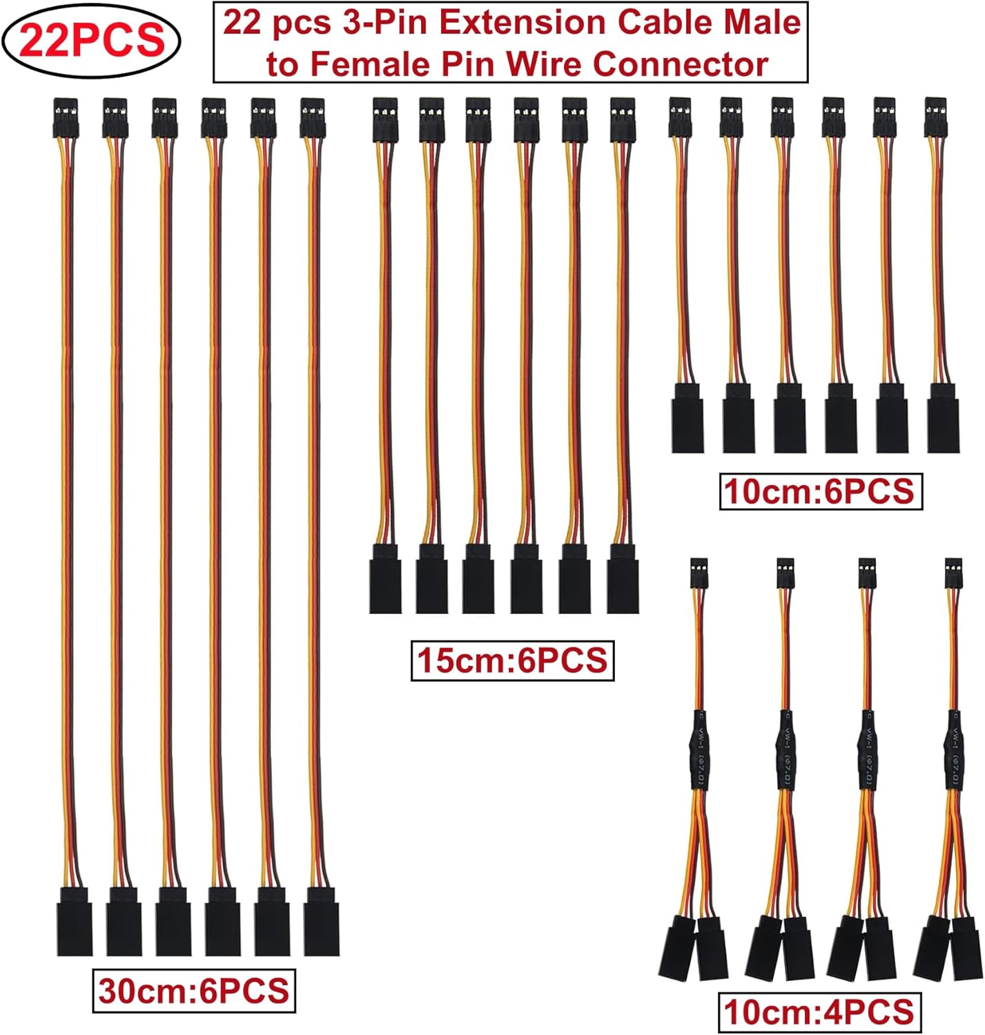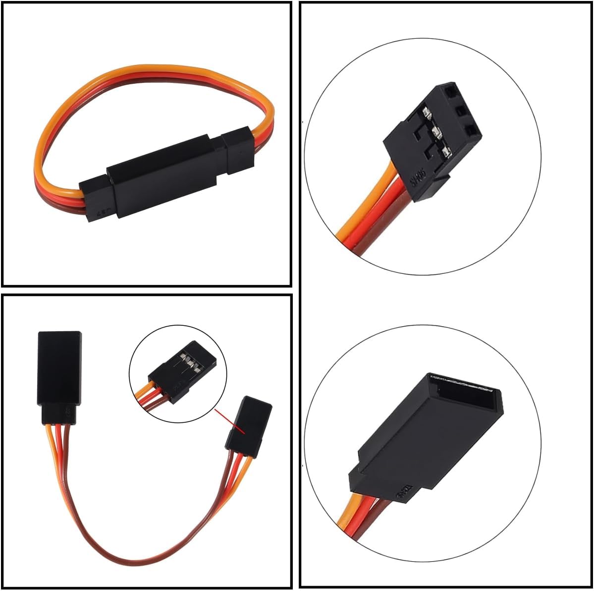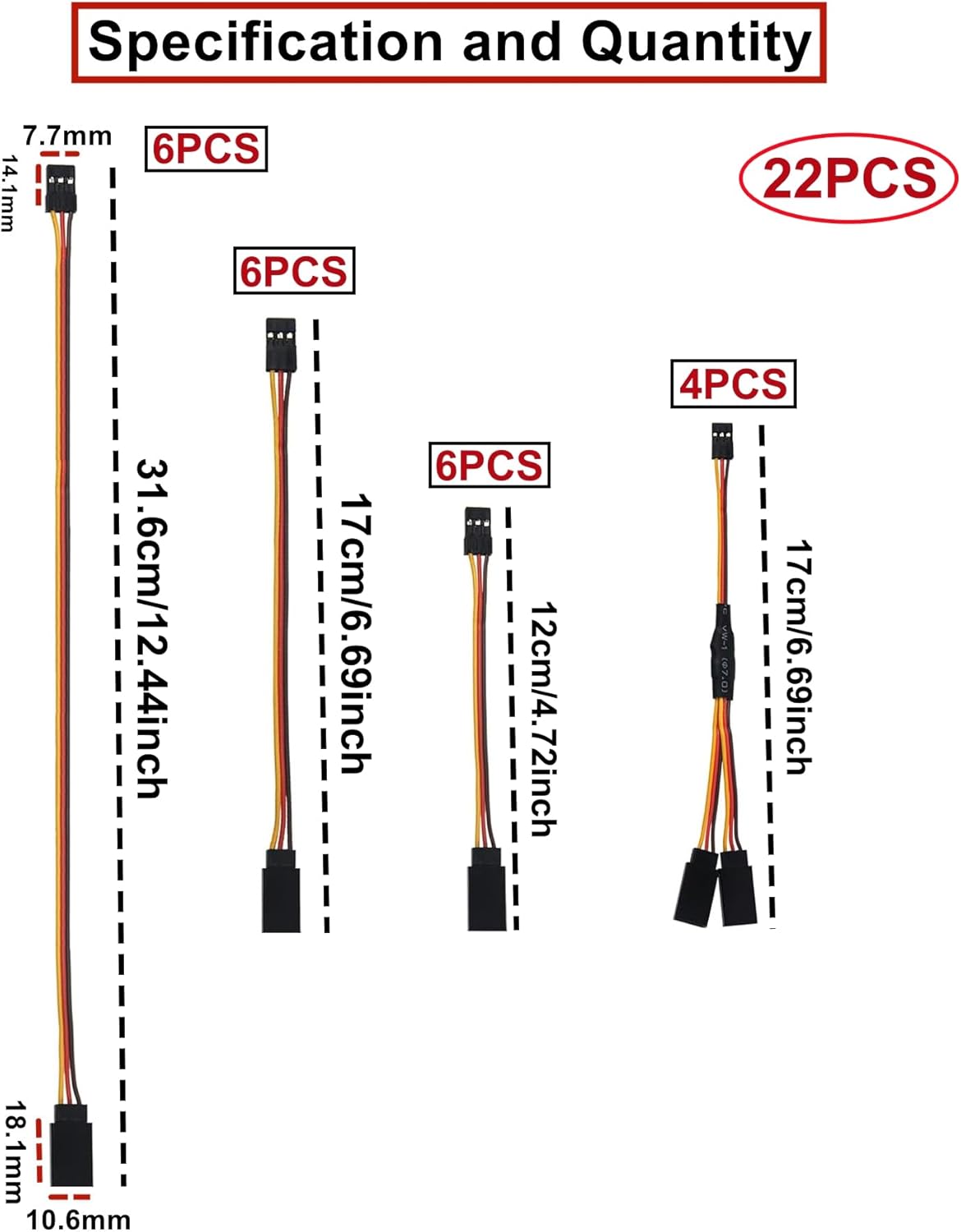 Specifiche tecniche: 4 diverse lunghezze di 10 cm, 15 cm, 30 cm e (cavo a Y da 15 cm da 1 a 2), cavo di prolunga per servocomando, i colori sono marrone, rosso e arancione. Alta qualità: il nucleo interno del cavo di prolunga per servocomando RC è realizzato in filo di rame stagnato, morbido e con una buona conduttività elettrica. La connessione è stabile e può sopprimere le interferenze. Il nucleo esterno è realizzato in PVC, che previene le perdite ed è più sicuro. Ampie applicazioni: i cavi di prolunga per servocomando possono essere utilizzati per servocomandi Futaba e JR, ideali per il collegamento di servocomandi o ricevitori di auto RC, aerei, elicotteri e droni. Facile da usare: cavo di prolunga per servocomando da femmina a maschio. Dotato di un connettore femmina da un lato e di un connettore maschio dall'altro. Progettato per connettori JR, può essere collegato al ricevitore e al motore dello sterzo. Connessione solida, prolunghe di alta qualità per servocomandi. La confezione include: 22 cavi di prolunga servo a 3 pin maschio-femmina, filo AWG 22, 6 cavi di prolunga da 100 mm, 6 da 150 mm, 6 da 300 mm e 4 cavi a Y da 1 a 2 (150 mm). Diverse dimensioni possono soddisfare le tue diverse esigenze.