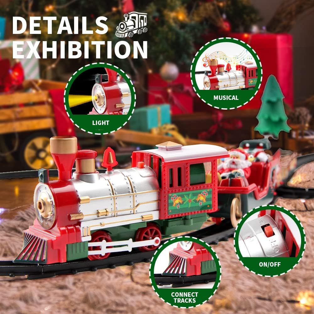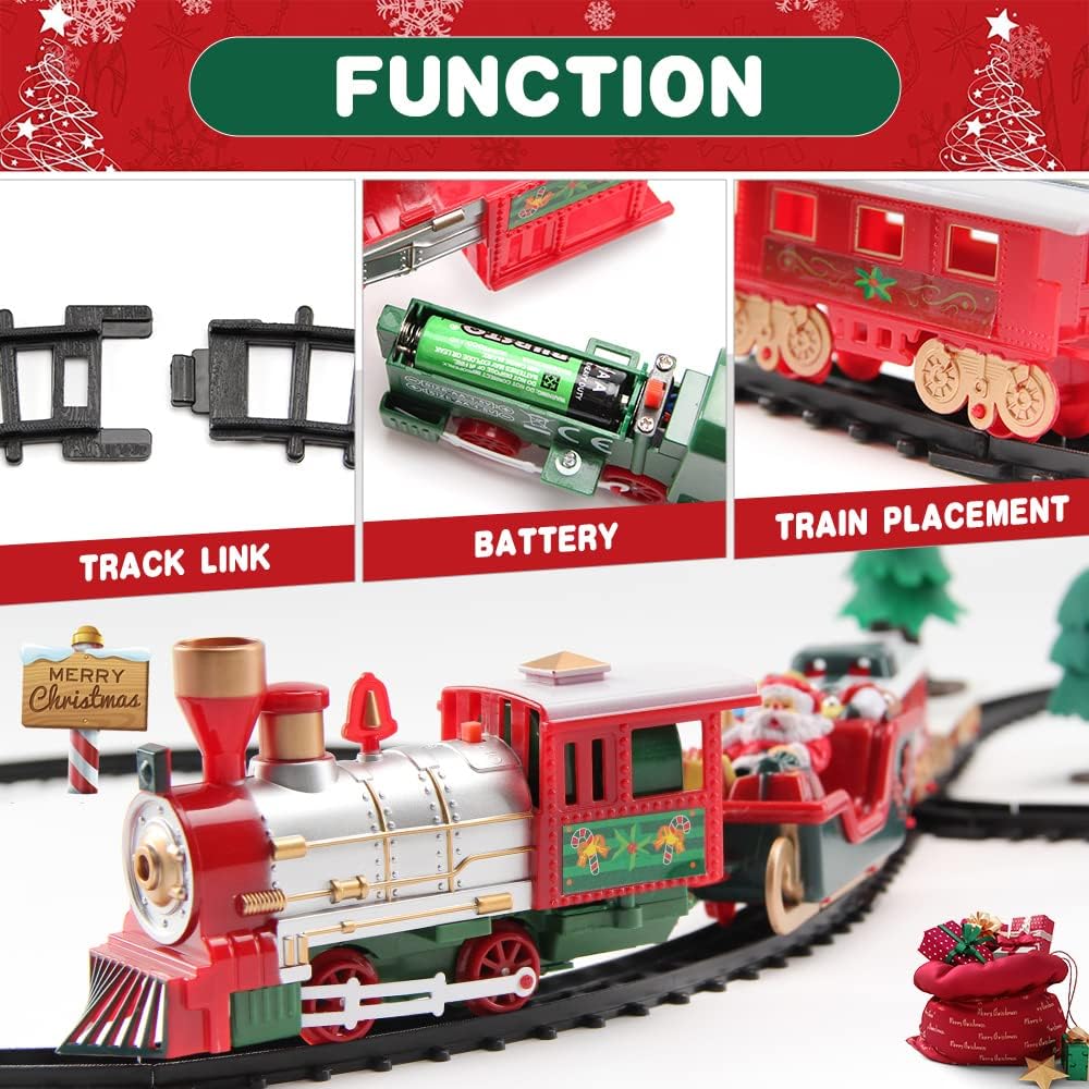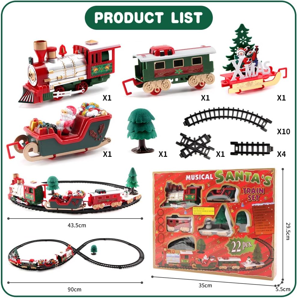 Treno elettrico di Natale. Modello sonoro molto realistico. Il treno suona la melodia di Jingle Bells e fa luce. Set completo di 22 pezzi ideali per realizzare un circuito: 1 locomotiva (15,5 cm x 7,5 cm x 4 cm), 1 carro passeggeri, 1 carro di Babbo Natale, 1 carro vassoio con pupazzo di neve e albero di Natale rimovibili. Ideale per essere parte di decorazioni natalizie (ad esempio villaggio di Natale, ghirlande di Natale, albero di Natale...). Decorazione natalizia originale. Con 15 binari: 10 grandi binari da 23 cm di lunghezza, un binario incrociato, 4 piccole rotaie. Include anche un albero di Natale decorativo. Alimentazione: 2 batterie AA non incluse. Un pulsante on/off sulla locomotiva per tutte le funzioni (avviare il treno, suono e luce).