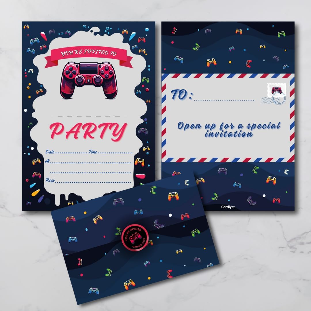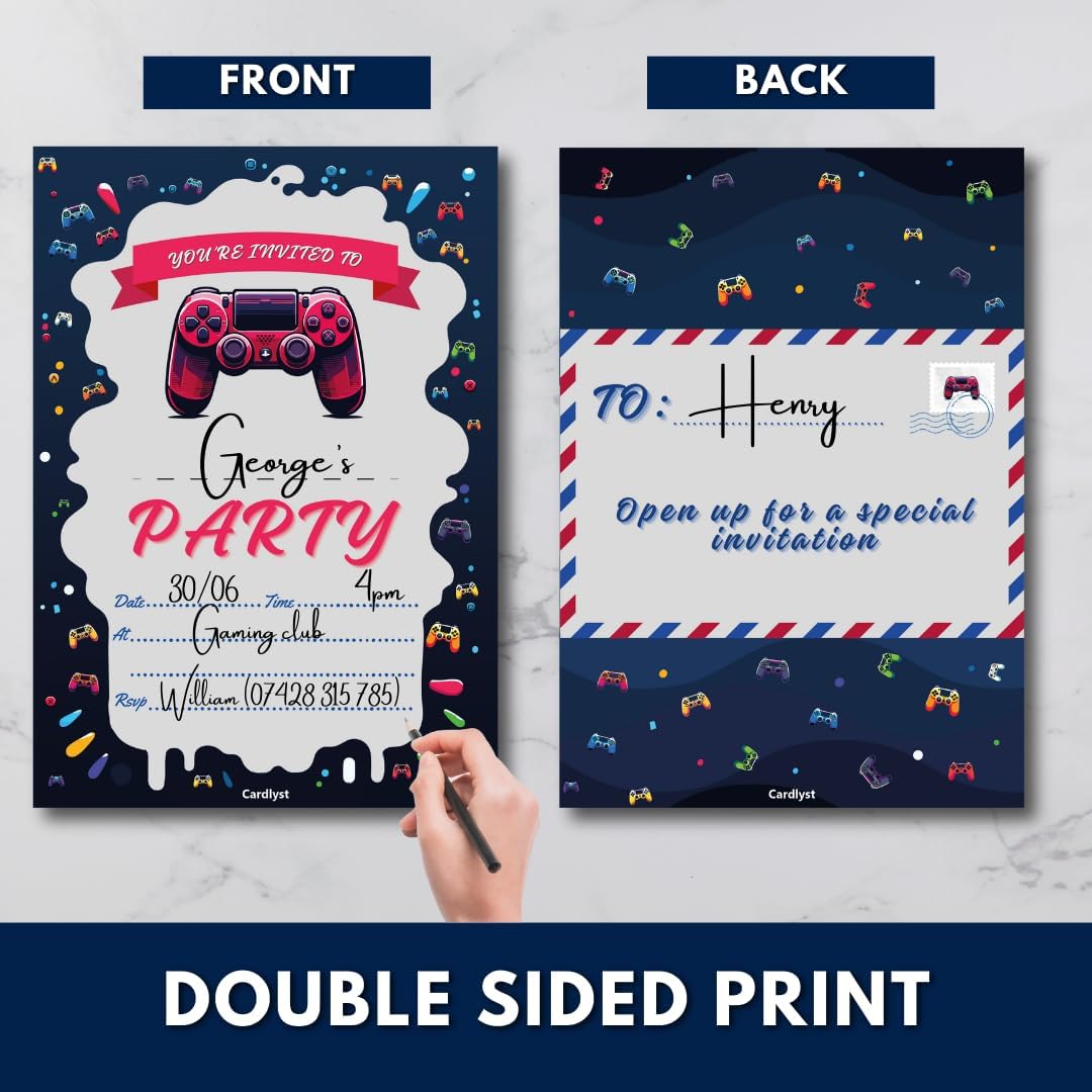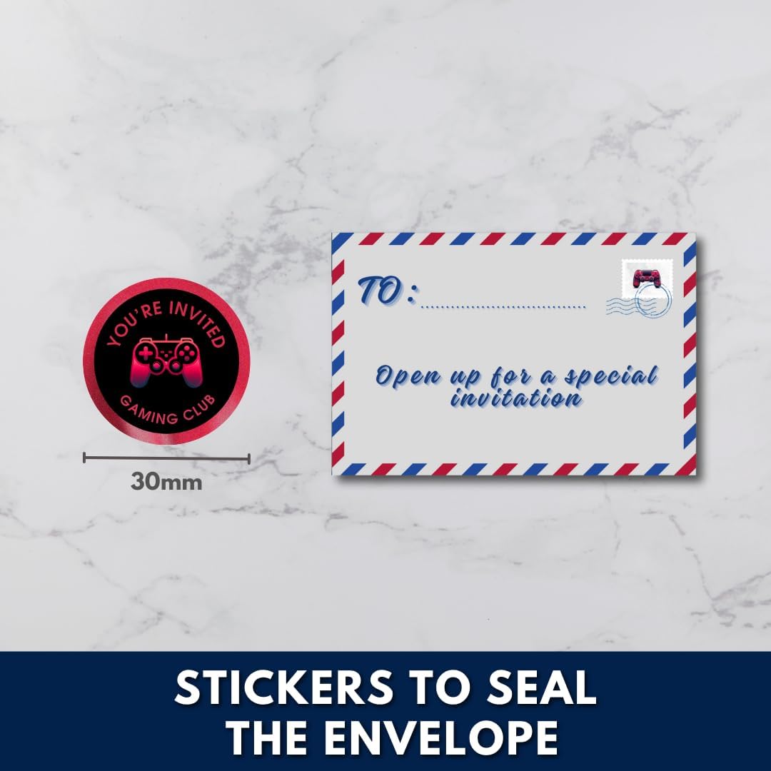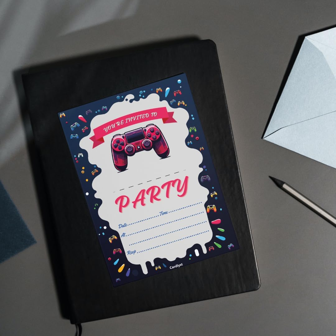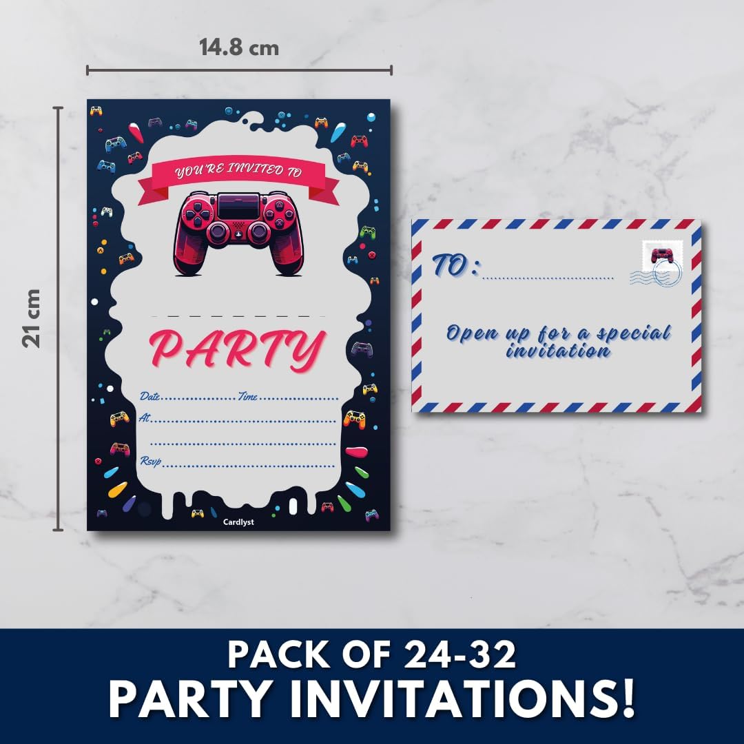 Inviti per feste di gioco: questo set include 24-32 inviti per feste di gioco dal design dinamico. Sono in formato A5, misurano 148,5 x 210 mm, offrendo ampio spazio per annotare i nomi dei tuoi ospiti, la data, l'ora, il luogo e il contatto RSVP. Perfetto per ambientare la scena per una serata di gioco epica! Design innovativo della busta: con una stampa unica su entrambi i lati, questi inviti assomigliano a una classica console di gioco quando piegati. La parte anteriore imita il design elegante di una console, mentre la parte posteriore presenta un vivace motivo di controller di gioco e icone pixelate, immergendo i tuoi ospiti in un universo di gioco prima ancora che la festa inizi! Include adesivi per giocatori: ad accompagnare questo pacchetto ci sono 24-32 adesivi "Game On". Utilizzali per sigillare i tuoi inviti, aggiungendo un ulteriore livello di eccitazione. I tuoi ospiti saranno desiderosi di unirsi alla tua avventura di gioco! Una qualità oltre il gioco: questi inviti sono più di una semplice carta, sono una testimonianza della tua passione per i giochi. Realizzati con precisione nel Regno Unito, rappresentano la tua meticolosa pianificazione ed entusiasmo. Con 250 g/m², sono abbastanza resistenti per sopravvivere al viaggio verso i tuoi compagni di gioco, piegandosi senza problemi come caricare il tuo gioco preferito. Un impegno per il nostro pianeta: inviare questi inviti significa che non stai solo chiamando gli amici a una serata di gioco; stai anche facendo una dichiarazione sulla sostenibilità. Completamente riciclabili, questi inviti sono un cenno verso una comunità di gioco più eco-consapevole. Inoltre, con ogni confezione, contribuiamo alla piantagione di alberi nel Regno Unito, mescolando il tuo amore per i giochi con un impegno per la terra.