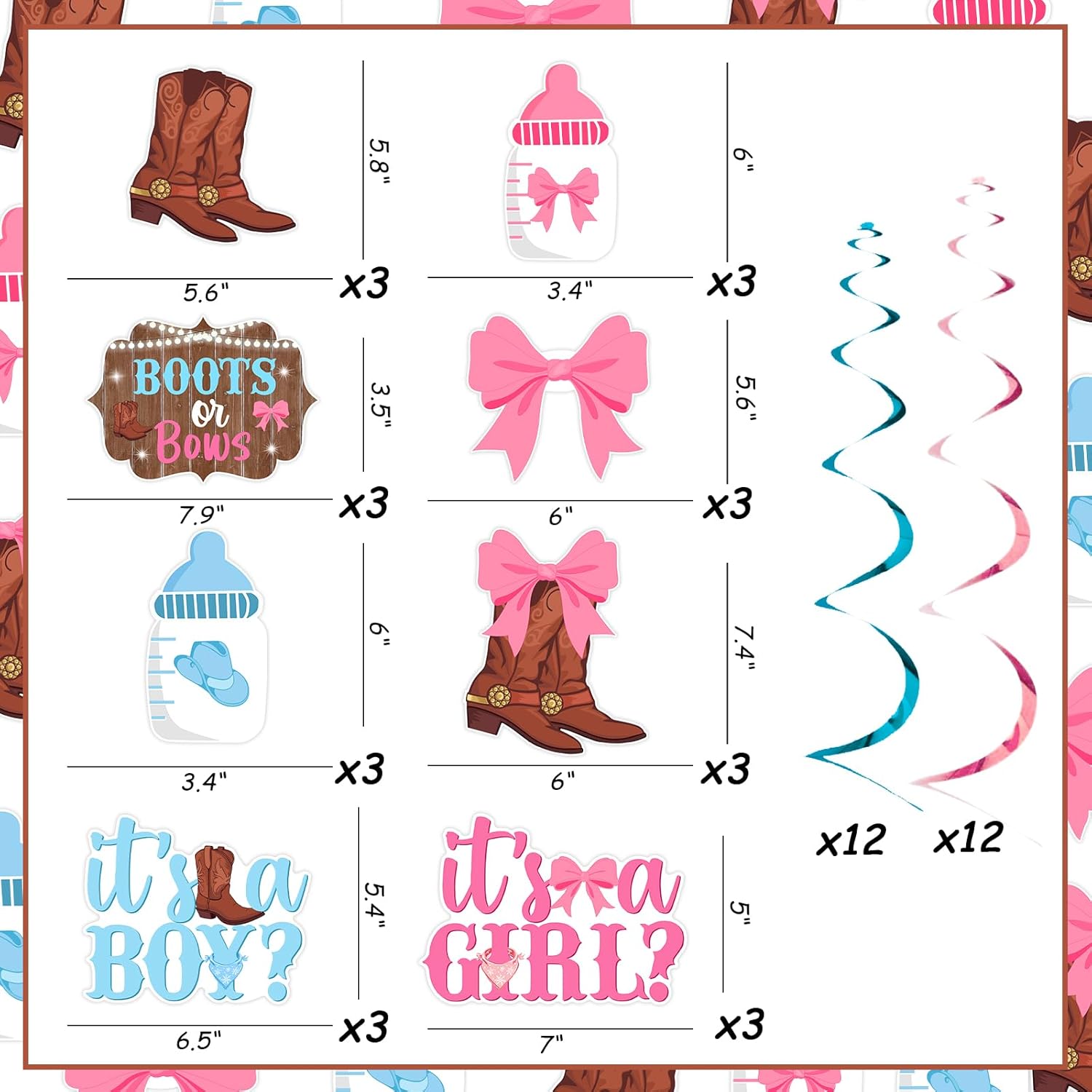 Contenuto della confezione: riceverai 24 pezzi di stivali o fiocchi da appendere, sufficienti per soddisfare le tue esigenze di decorazioni per feste, per portare un'atmosfera diversa alla tua festa. Stivali o vortici da appendere con fiocco: questi vortici appesi hanno una tonalità marrone generale con stivali e motivi di fiocco su entrambi i lati, che è un'ottima scelta per feste a tema cowboy. Puoi decorarlo per decorare la tua stanza, che darà ai tuoi ospiti una sensazione speciale. Facile da usare: questi stivali o fiocchi appesi turbinii sono dotati di vortici pre-infilati che sono facili da appendere. È possibile posizionare facilmente questi vortici appesi ovunque, rendendolo conveniente. Ampia applicazione: adatto per feste a tema cowboy, feste di rivelazione di genere, baby shower, e adatto anche per appenderlo ovunque tu voglia, come soffitto, soggiorno, porta, parete e puoi persino appenderlo all'albero all'aperto. Utilizza queste decorazioni per aggiungere un'atmosfera affascinante per te. Qualità premium: questi vortici da appendere sono realizzati in cartoncino e materiale laminato con un bellissimo motivo su entrambi i lati. Sono spessi e resistenti e non si deformano facilmente. Sufficiente per essere utilizzato ripetutamente in vari luoghi.