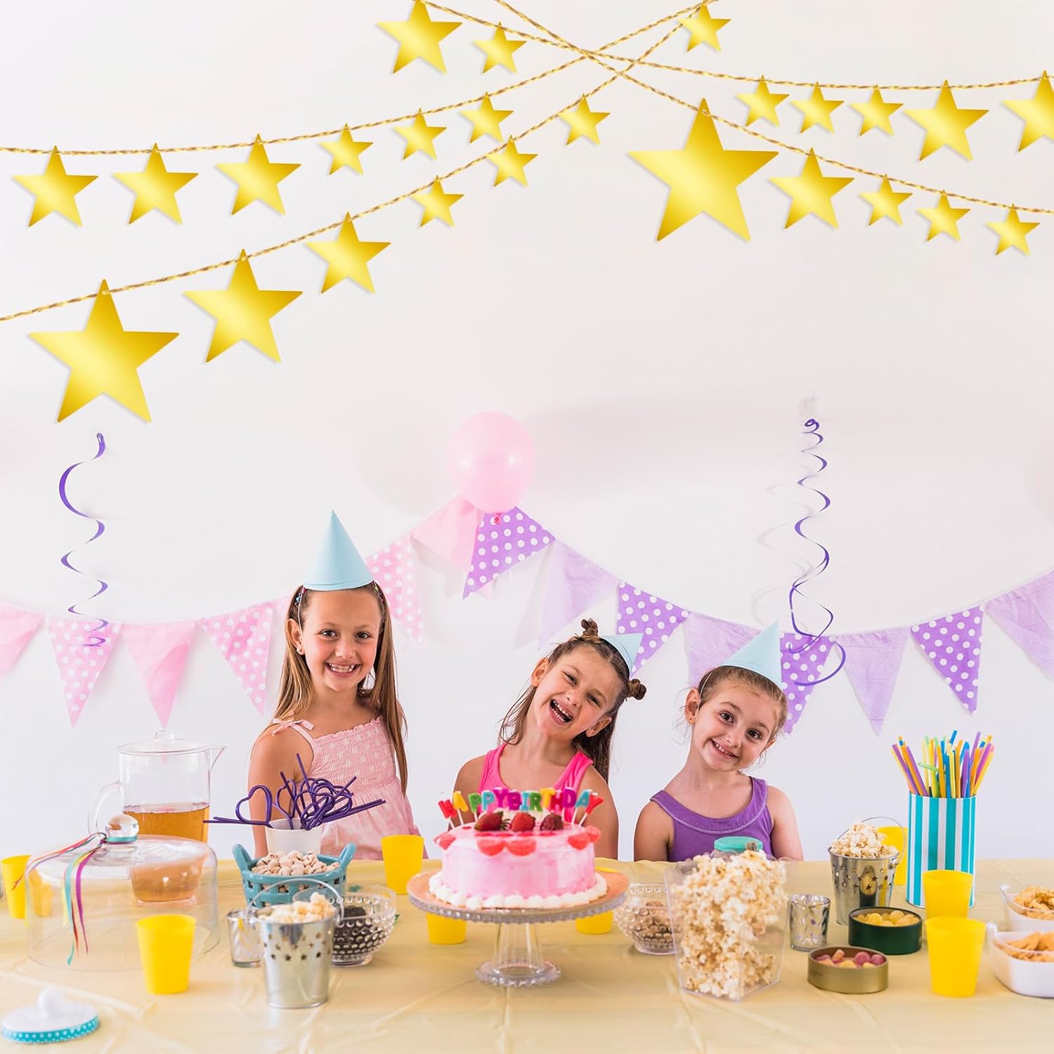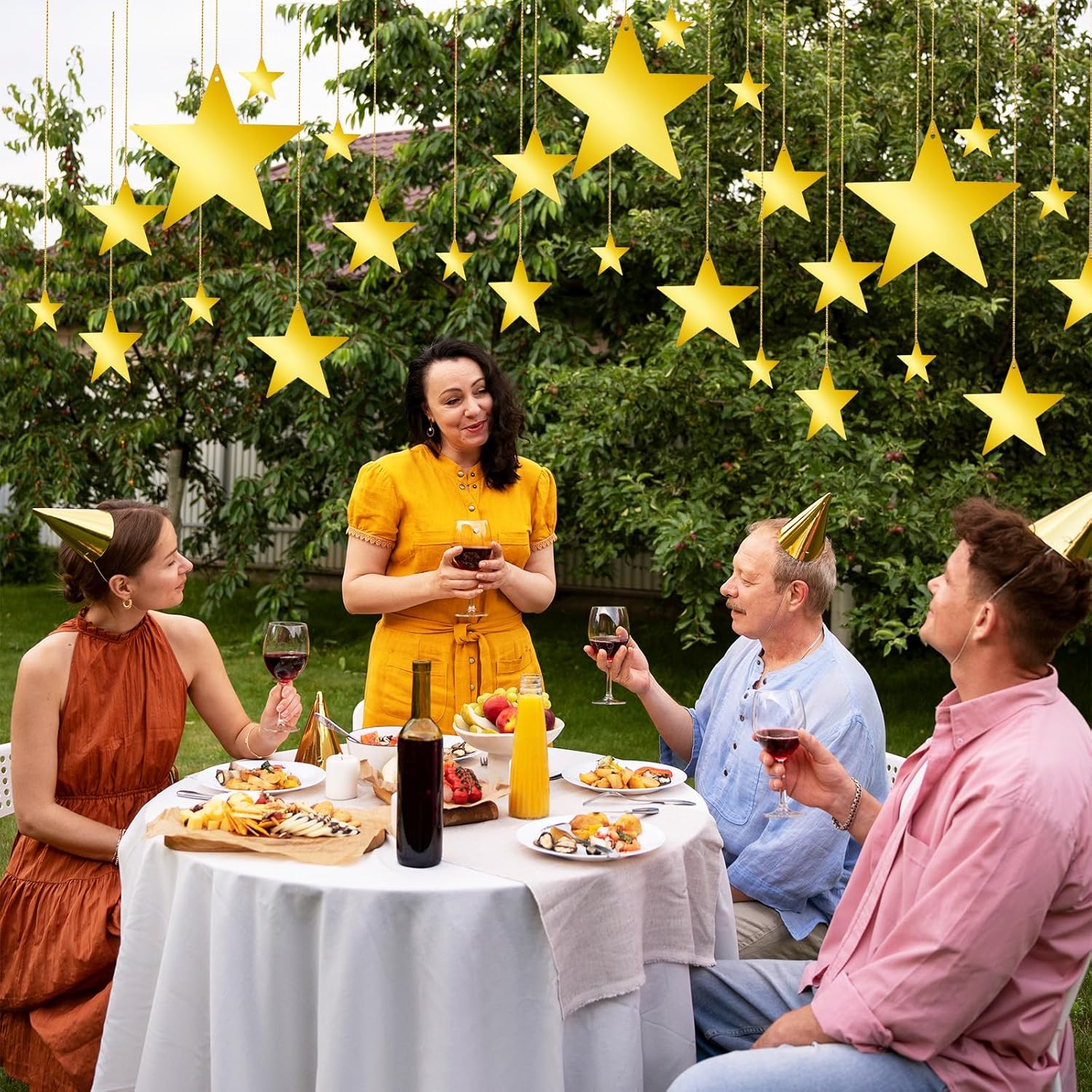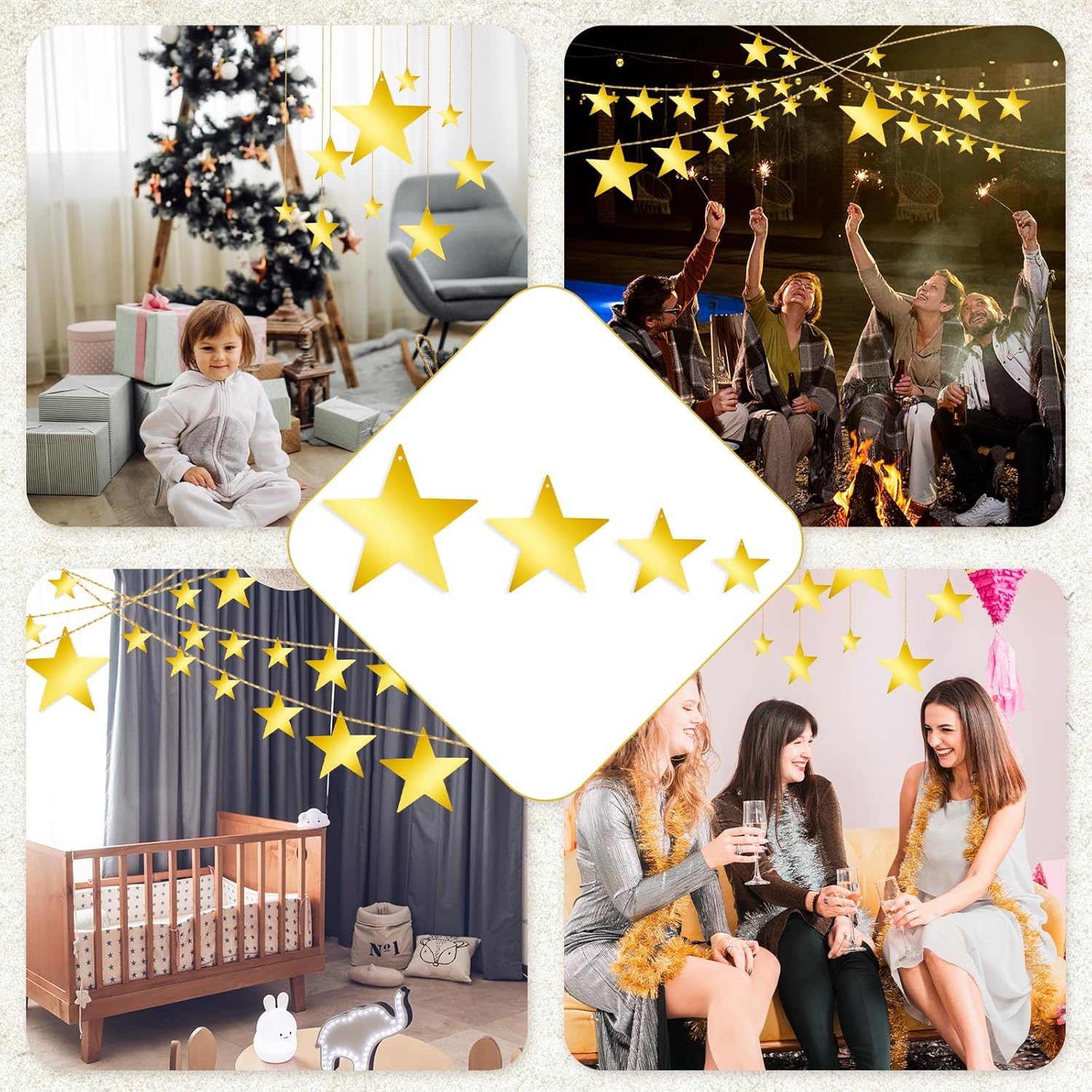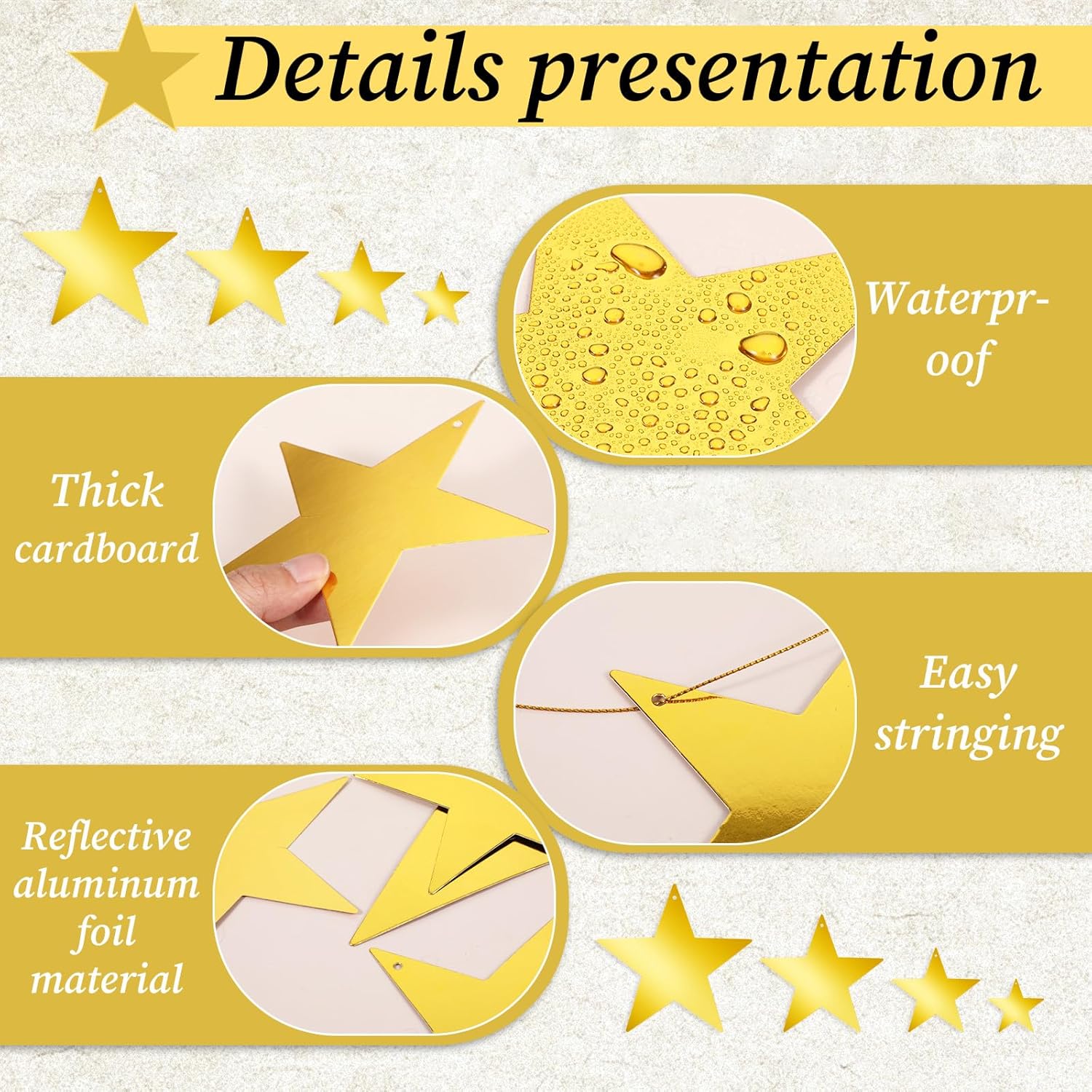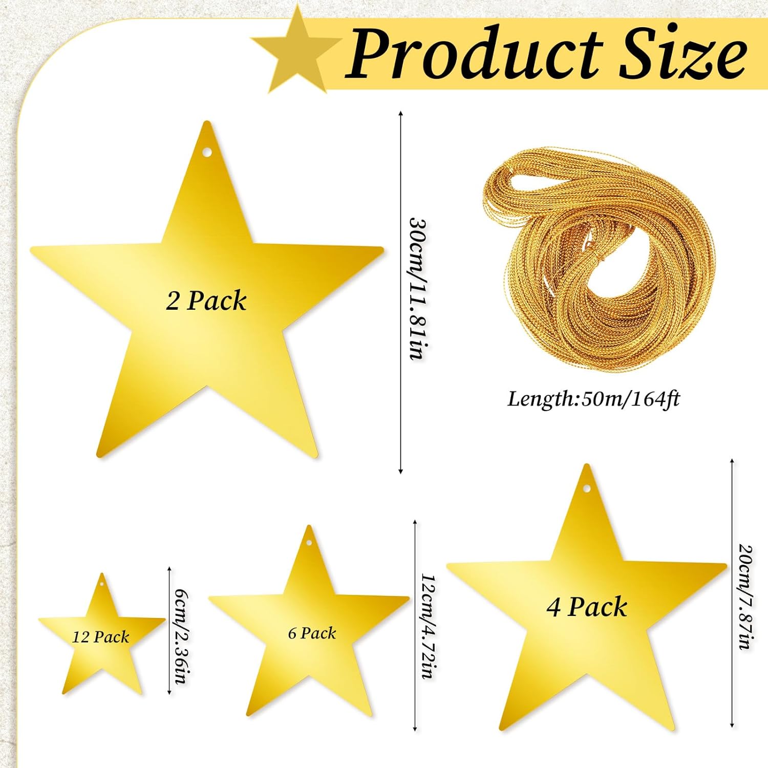 La confezione include: riceverai 24 decorazioni a stelle dorate, tra cui 2 pezzi da 30 cm, 4 pezzi da 20 cm, 6 pezzi da 12 cm, 12 pezzi in 6 cm e una corda di nylon dorato da 50 m. Con abbondanti quantità e varie dimensioni, questi ritagli di stelle ti aiuteranno a creare una festa a tema vivace e bella. Materiale di qualità: queste stelle sospese sono realizzate in cartone, spesso, robusto, durevole, garantendo un uso duraturo senza deformazioni o danni, mantenendo la loro lucentezza. Grazie al loro materiale in cartone, sono sottili e possono essere facilmente riposti in un cassetto quando non in uso. Design squisito: questi ritagli a stella d'oro glitterati sono realizzati in colore oro brillante con superficie lucida, che è abbagliante alla luce e migliora istantaneamente lo stile dello spazio, aggiungendo un'atmosfera meravigliosa per festival o eventi. Facile da usare: ogni decorazione a stella glitterata ha un piccolo foro, è possibile infilare la corda di nylon attraverso di essa e appenderlo ovunque tu voglia, decorando la tua festa, stanza, luogo di nozze o qualsiasi spazio vivace. Ampia applicazione: il cartone lucido a stella può essere appeso direttamente a pareti, tavoli, tavolini, può anche essere incollato o appeso a pareti o soffitti, creando un'atmosfera festosa per la tua casa, San Valentino, feste di compleanno, riunioni di vacanza o luoghi di nozze, aggiungendo calore e lasciando un'impressione memorabile.