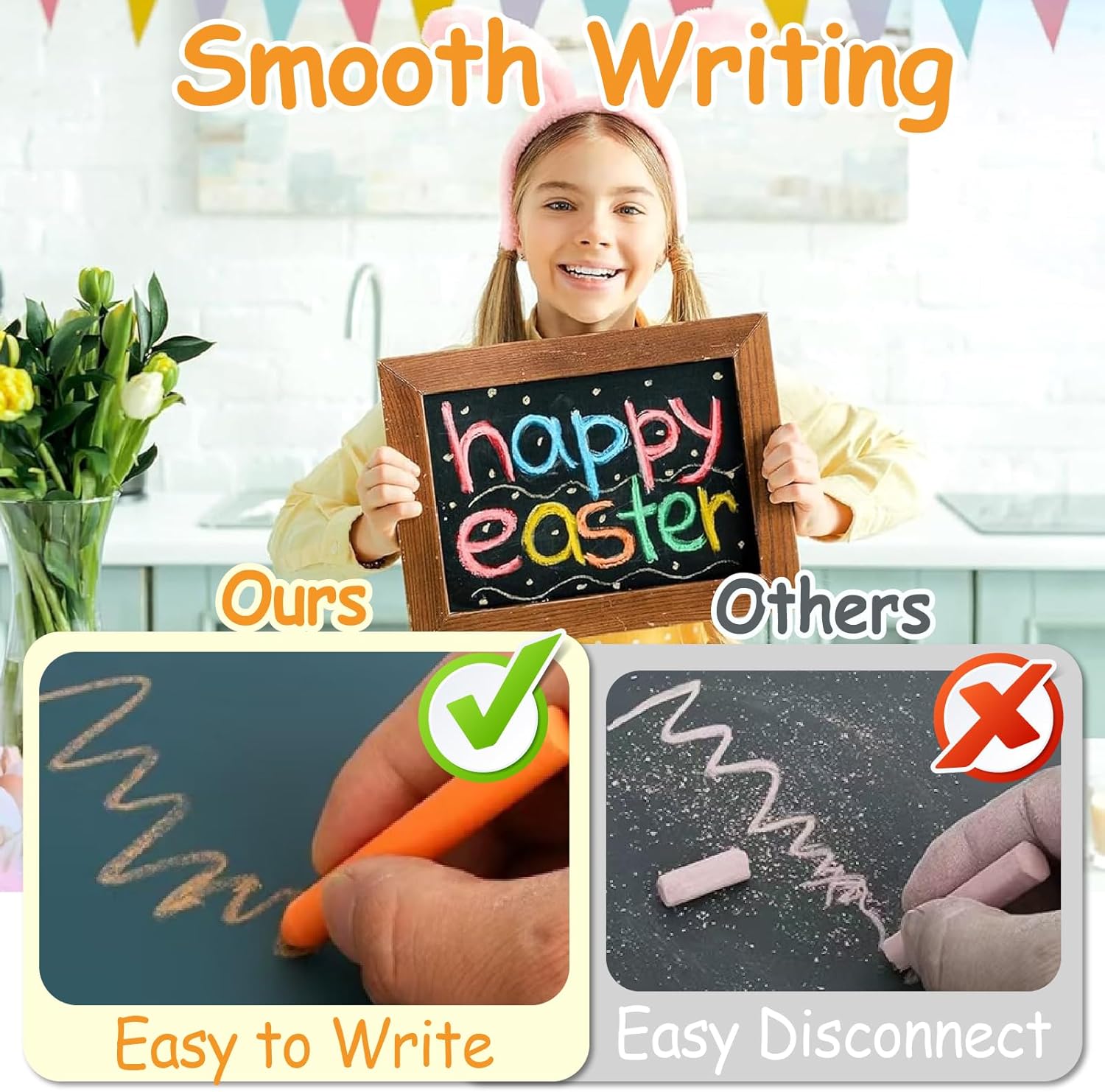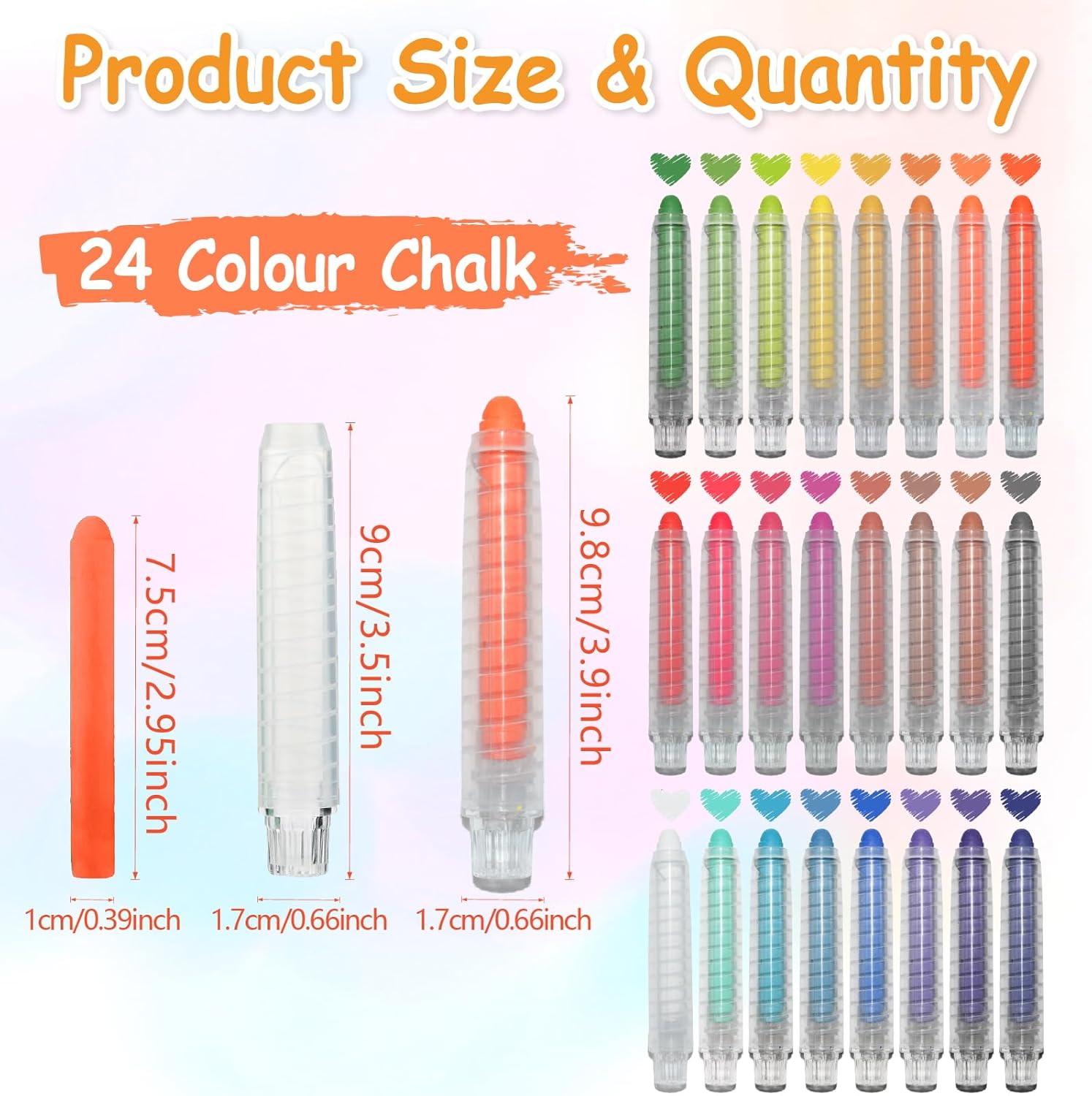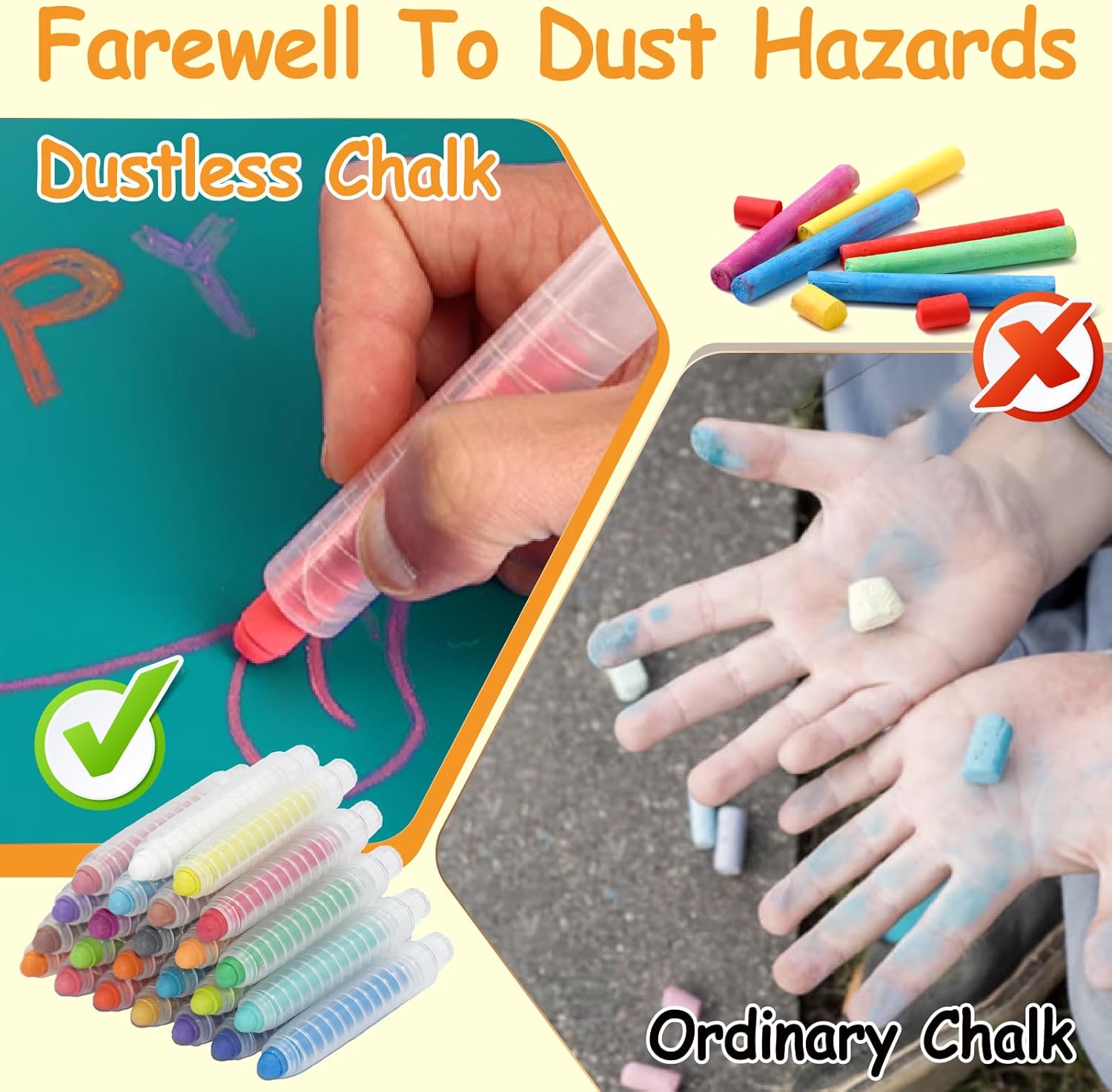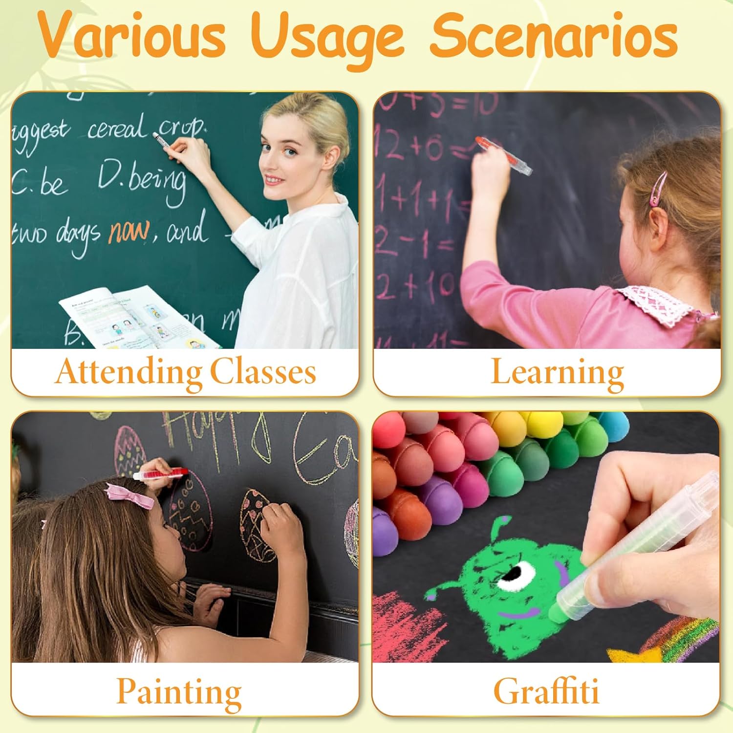 La confezione include: 24 gessetti senza polvere con 24 supporti extra per gesso, 7,5 cm di lunghezza, 1 cm di diametro, gesso lavabile per soddisfare le esigenze di colorazione dei bambini, migliora le loro capacità cognitive di pittura Facili da usare: pennarelli a gesso per lavagna, lavabili, si possono facilmente pulire con un panno umido o lavarli con un rapido getto d'acqua, inoltre questi colori possono essere facilmente rimossi dai vestiti Design perfetto: ogni pennarello colorato ha una copertura separata per il gesso per proteggerlo dalla rottura, poiché il gesso colorato non tossico per bambini tiene le mani dei bambini lontano dal gesso e protegge le mani Attenzione particolare: utilizzare una spugna o un panno imbevuto di acqua per pulire la scrittura a mano, è più pulito, il gesso privo di polvere è realizzato con una elevata densità di materiali a gesso privi di polvere Ampio utilizzo: con gesso colorato per bambini con kit privo di polvere, i vostri bambini possono dare libero sfogo alla loro immaginazione e creatività per creare una varietà di dipinti squisiti, perfetti per lavagne, vetri, finestre, specchi, vetro, carta, legno, ecc