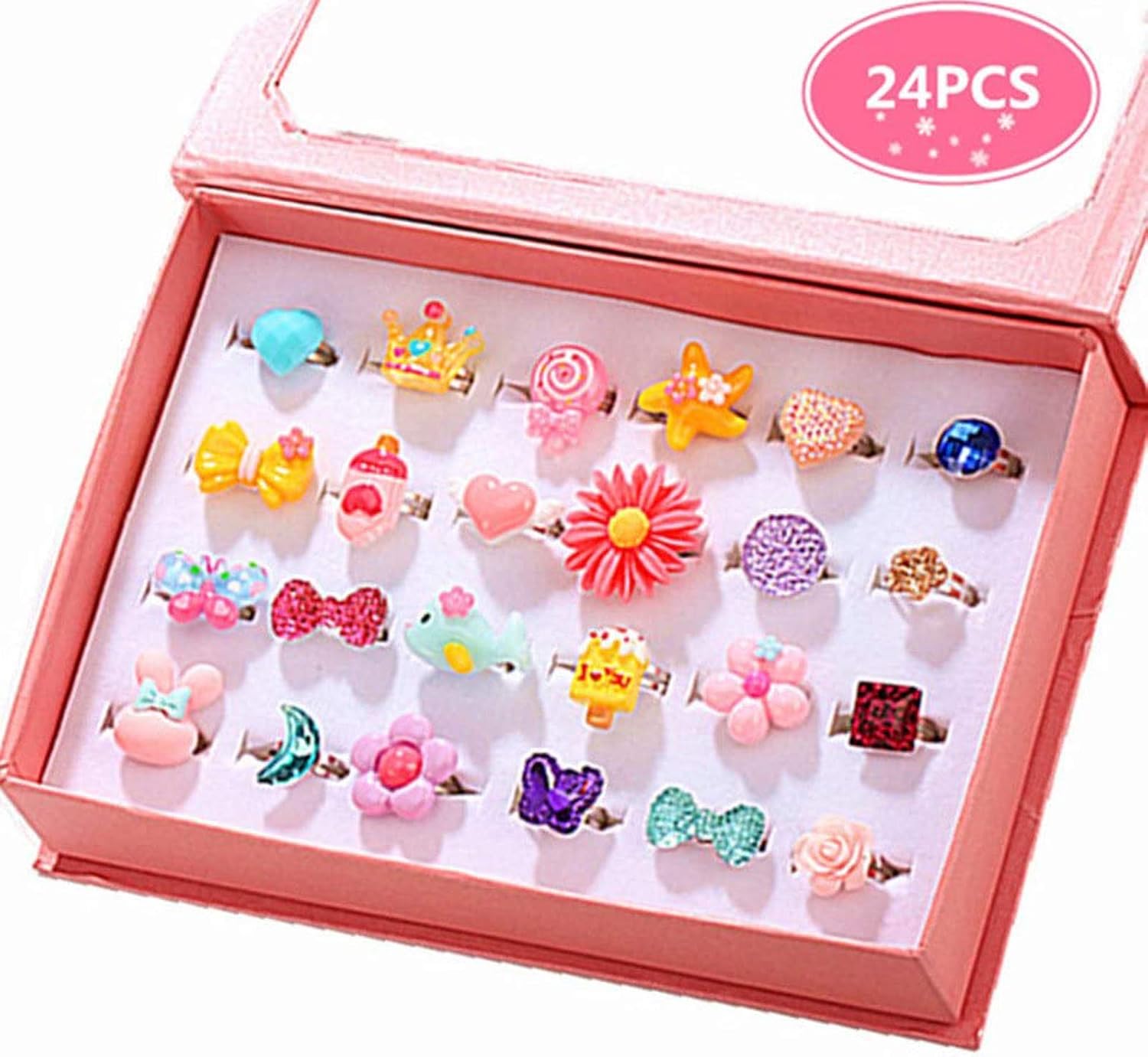 ❤Pacchetto comprendente: 24 anelli per bambine dal design unico regolabili con scatola rosa. Gli anelli per bambini per ragazze affascineranno le vostre figlie. Come unicorno, stella marina, girasole, farfalla, pietra preziosa finta, fiore, gelato, cuore mostrato come immagine. ❤Misura regolabile: anelli gioielli per bambine, si adattano molto bene ai bambini. Non aver paura di comprare. Ideale per le ragazze che giocano a fare finta e vestono anelli ❤Materiale: materiale di alta qualità, non tossico e metallico, senza nichel, delicato sulla pelle, sicuro e di facile manutenzione. Anelli per bambini per ragazze È facile da abbinare alla maggior parte degli anelli per bambini, fai finta di giocare e travestirsi ❤Ampia applicazione: anelli per bambine regolabili, perfetti per la festa di compleanno della principessa, festa di finzione a tema principessa, festa di Halloween, Natale, riempitivo piñata, preliminari del tea party, regalo di carnevale per bambine. Vesti le tue ragazze per renderle bellissime principesse! ❤Servizio clienti per anelli eleganti, anelli gioiello per bambine: parti mancanti o danni durante il trasporto, inviaci un messaggio. Supporteremo sempre il miglior servizio per la scatola degli anelli dei nostri bambini
