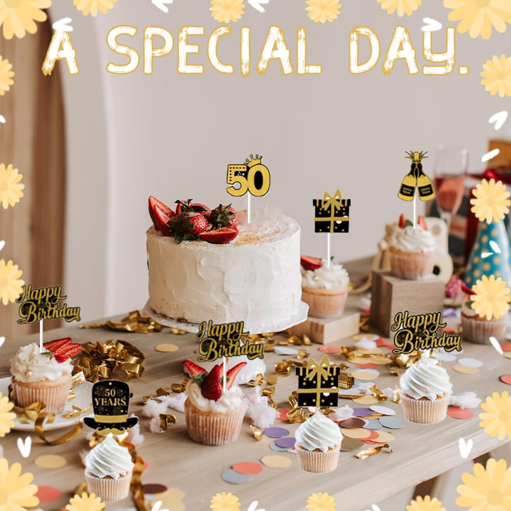 Adatto al tema del 50° compleanno: progettato appositamente per le feste di compleanno dei 50 anni, con una vasta gamma di modelli (come il numero “50”, corone, bicchieri da vino, ecc.), che si adattano perfettamente all'atmosfera della festa di compleanno e aggiungono un tocco di cerimonia esclusiva. Aspetto raffinato e materiali di alta qualità: i colori nero e oro conferiscono un aspetto lussuoso e elegante, i materiali sono resistenti e durevoli e la stampa dei motivi è chiara. Le bandierine hanno un design raffinato, sono stabili una volta inserite nella torta o nei cupcake e non si rovesciano facilmente, valorizzando il tavolo dei dolci. Quantità e modelli vari: include 24 bandierine con design diversi, in grado di soddisfare la maggior parte delle esigenze di decorazione dei dolci. Sia che si tratti di una torta grande o di cupcake, è possibile creare un ricco effetto visivo, creando un'atmosfera festosa. Facile da usare: il design del bastoncino è semplice, non richiede operazioni complesse, basta inserirlo delicatamente nel dolce per completare la decorazione. Risparmia tempo nella preparazione, rendendo più facile l'organizzazione della festa, anche i principianti possono creare rapidamente un bellissimo tavolo dei dolci. Adatto a molteplici occasioni: non solo per feste di compleanno in famiglia, ma anche per decorare feste di compleanno per i 50 anni in ristoranti, sale per feste e altri luoghi. Aggiungi decorazioni a torte di compleanno, cupcake, piccoli dolci e crea un'atmosfera allegra.