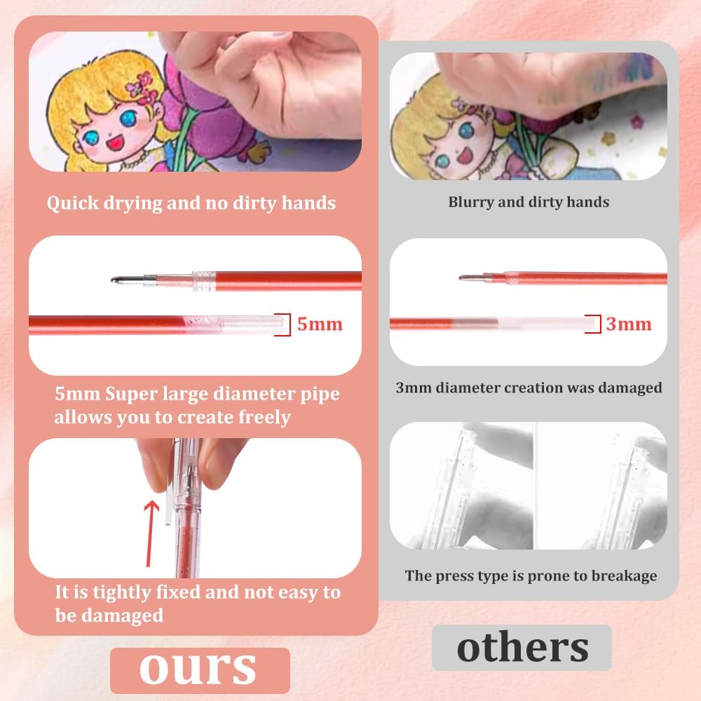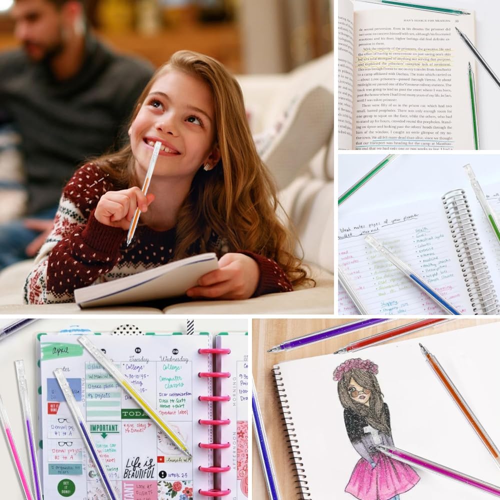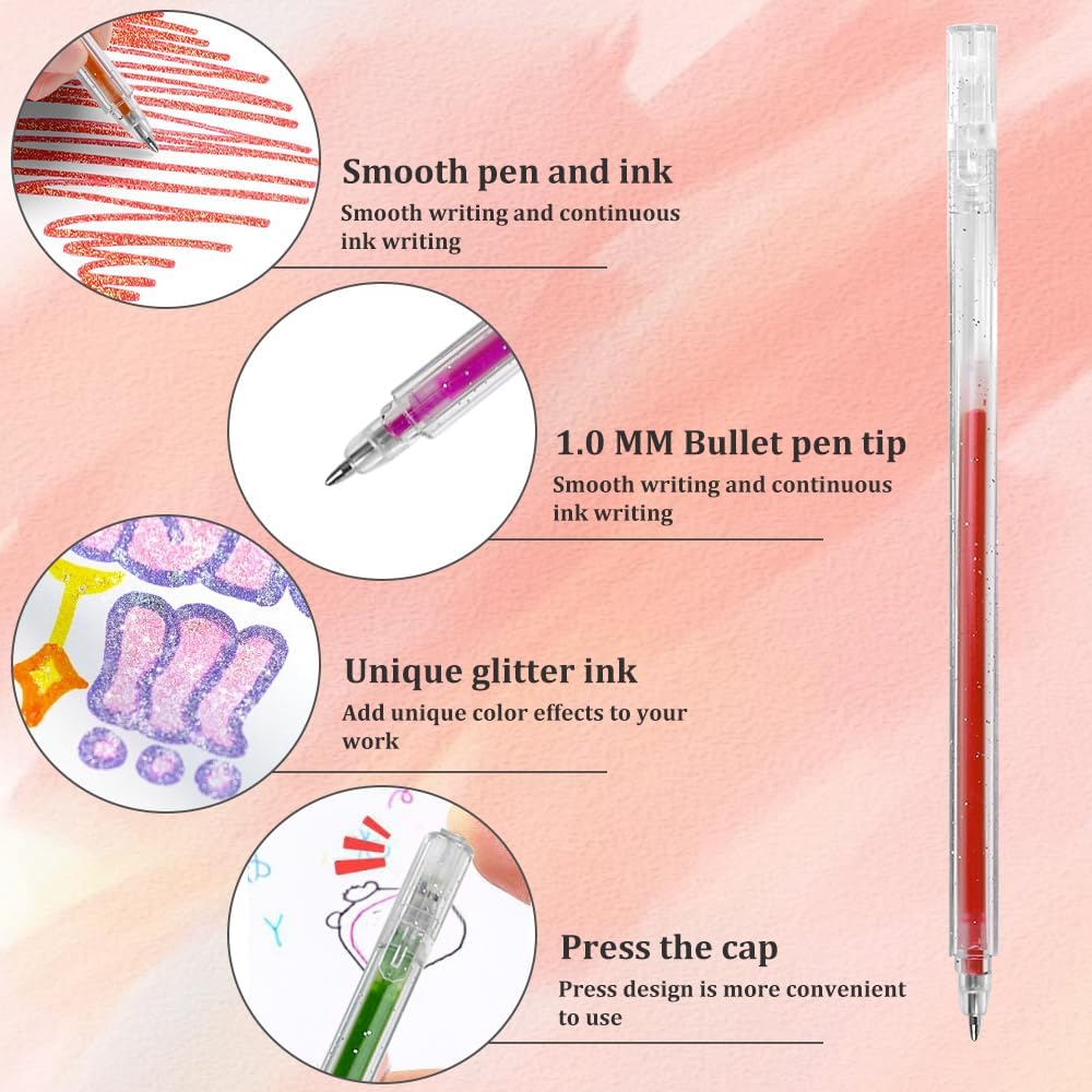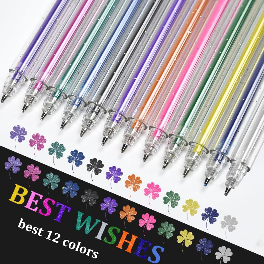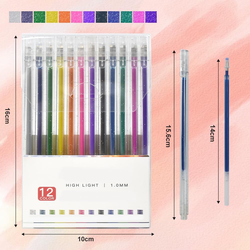 【Effetto scintillante e cangiante】 Queste Gel Pen Metalliche creano un affascinante effetto luccicante a forma di stelle mentre si scrive, soprattutto sotto la luce del sole, con riflessi brillanti e cangianti. I bambini saranno attratti da questo effetto magico, che stimolerà il loro interesse per lo studio e la creatività. Che sia per prendere appunti o disegnare, renderà la scrittura più divertente e i compiti o le opere d'arte più vivaci! 【12 colori vivaci + ricariche ad alta capacità】 Il set include 12 penne glitter colorate dai toni vivaci e brillanti, con una scrittura fluida e scorrevole. Ogni penna è dotata di una ricarica ad alta capacità dello stesso colore, per una durata prolungata e una creatività senza limiti. I molteplici colori soddisfano diverse esigenze, come disegnare, evidenziare o decorare journal, rendendole il compagno perfetto per lo studio e l’arte! 【Tecnologia a rapida asciugatura, senza sbavature】 Grazie all’inchiostro di alta qualità che si asciuga all’istante, evita macchie sulla carta o sulle mani. Sia che siate mancini o destrimani, potrete usare queste penne metallizzate Lunga Durata senza preoccuparvi di sfocature. Assicura appunti e disegni sempre nitidi e un’esperienza di scrittura senza stress! 【Design ergonomico】 La punta scorrevole da 1,0 mm con sfera in acciaio garantisce un flusso d’inchiostro uniforme, ideale per lunghe sessioni di scrittura. Il fusto trasparente permette di controllare il livello dell’inchiostro, mentre il clip resistente ne facilita il trasporto e la stabilità sulla scrivania. Il design anti-rotolamento evita cadute accidentali. 【Sicuro ed ecologico, perfetto per bambini】 Progettate per i più piccoli, queste Penne glitter colorate sono realizzate con materiali atossici ed ecologici. La presa antiscivolo si adatta comodamente alle manine, riducendo la fatica durante la scrittura. Ideali per disegnare, journaling, biglietti d’auguri, appunti e molto altro, sono la scelta perfetta per studenti, amanti del bullet journal e appassionati di fai da te. Un regalo che stimola la creatività in totale sicurezza!