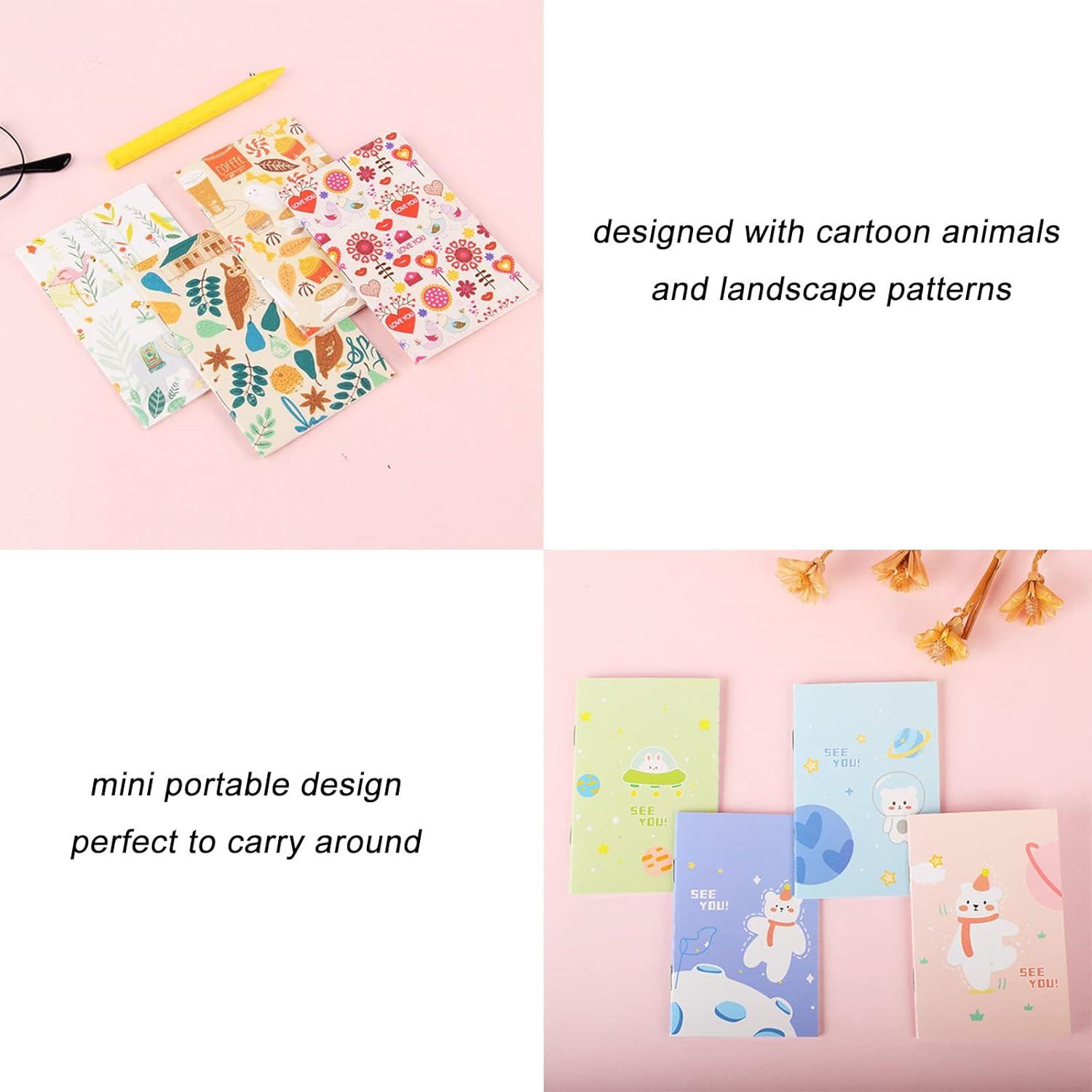 【Dimensioni adatte】 Riceverai 24 quaderni con copertina morbida in 6 stili diversi, adotterai un design compatto e mini portatile, le dimensioni di ciascun taccuino si adattano alle dimensioni tascabili, rendendolo perfetto da trasportare. 【Design Unico】Questi mini quaderni sono progettati con animali dei cartoni animati e motivi paesaggistici, carini e divertenti, non solo possono essere usati come quaderni, ma il grazioso design della copertina consente loro di essere usati come decorazioni. 【Regalo perfetto】 Questi quaderni tascabili possono essere dei bei regali per bambini, studenti, sono molto utili per lavorare e studiare, sono ottimi per far scrivere ai bambini, il che può sviluppare una buona abitudine di scrittura tra gli studenti. 【Materiale Premium】 Questi quaderni tascabili sono realizzati con carta resistente e di alta qualità, non facile da rompere, con 32 pagine (16 fogli) e sono stati progettati con 13 righe, facili da scrivere, possono essere utilizzati a lungo. Ampio utilizzo: adatto per registrare la tua ispirazione e le tue idee sempre e ovunque, puoi anche usarli per registrare lezioni, promemoria quotidiani, schizzi o quaderni di viaggio, adatti a casa, ufficio, scuola e altre occasioni.