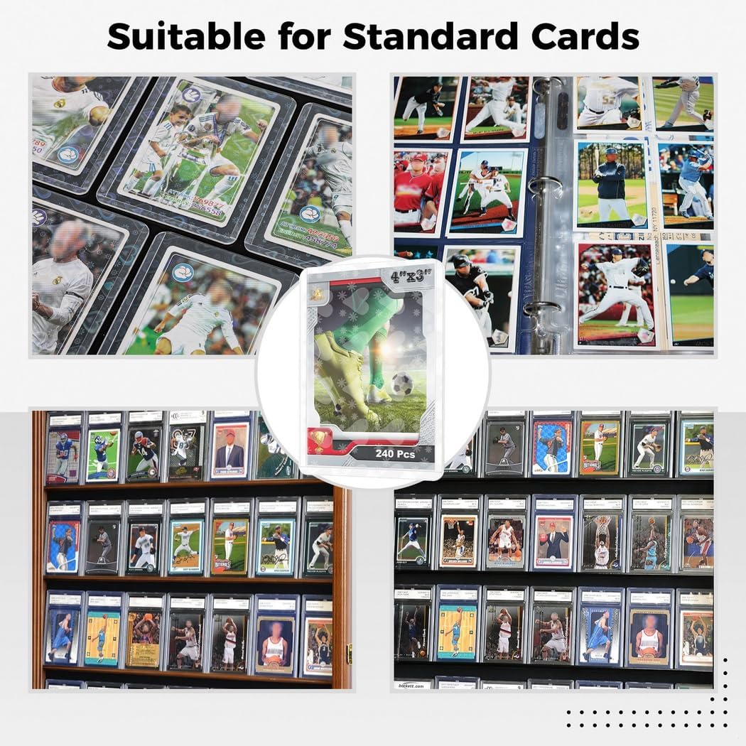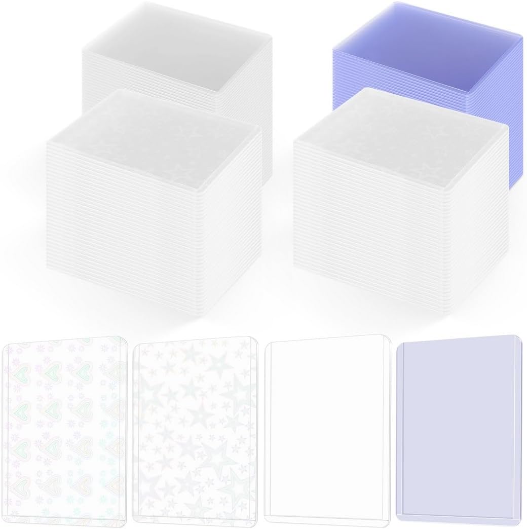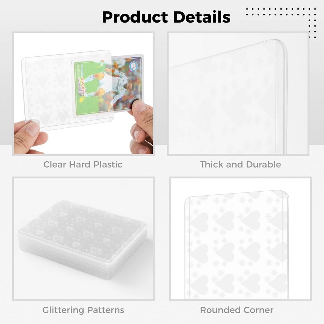 Selezione unica delle maniche: include maniche trasparenti, blu, cuore e stella; motivi visivamente sorprendenti che brillano e brillano da diverse angolazioni Su misura per carte collezionabili standard: può contenere carte fino a 9,7 x 6,6 cm; adatto per una varietà di carte da collezione, dallo sport agli anime Materiale di alta qualità: realizzato in plastica resistente, priva di acidi, inodore, consente una facile visualizzazione delle carte senza distorsioni Protezione di lunga durata: protegge le carte da polvere, graffi, olio e umidità; le mantiene in perfette condizioni per anni Semplice e conveniente: fai scorrere facilmente le tue carte nelle custodie; protegge gli angoli, consentendo di mescolare e giocare senza problemi