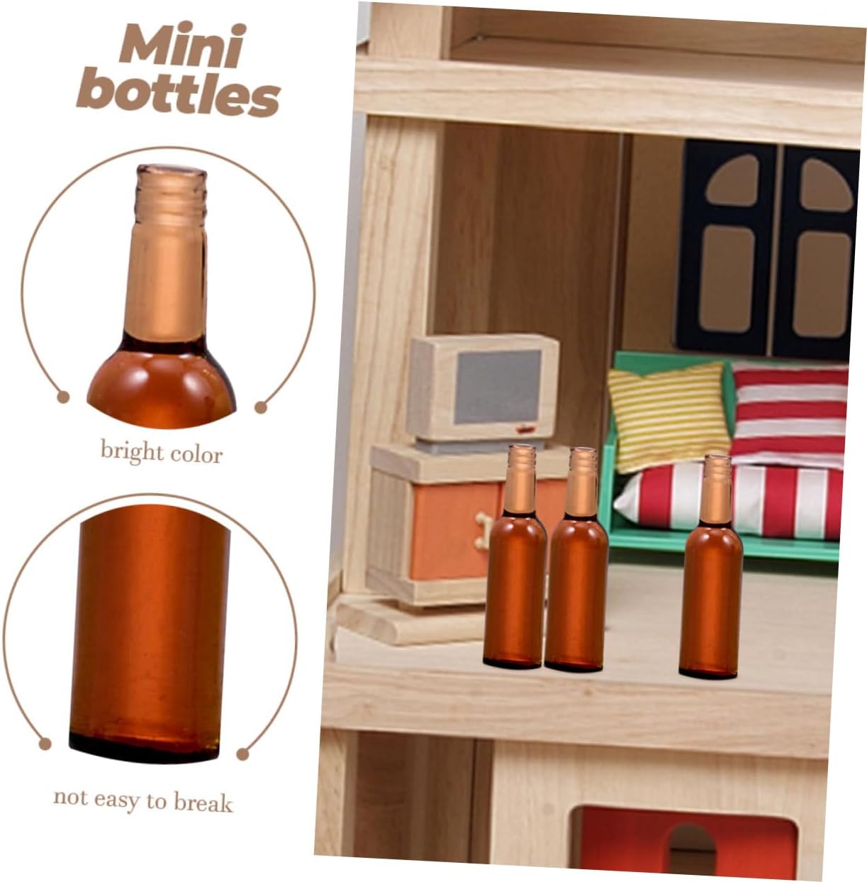 Decorazioni per bottiglie di vino in miniatura per case delle bambole: applicate per la decorazione del soggiorno di casa, per la decorazione della tavola o per le decorazioni della scena della festa della casa delle bambole, le miniature della casa delle bambole soddisfano le tue diverse esigenze. Bottiglia di birra per casa delle bambole: dimensioni ridotte, peso leggero, occupano quasi spazio, questi modelli di bottiglie di birra possono sicuramente divertire i tuoi bambini. Giocattoli per bottiglie: realizzate con materiali in resina, queste mini bottiglie di birra hanno un alto grado di simulazione, ottime per la decorazione della casa delle bambole. Bottiglia in miniatura della casa delle bambole: utilizzando materiali in resina, effetto altamente simulato, queste bottiglie di birra in miniatura sono facili da posizionare nella casa delle bambole dei tuoi bambini. Bottiglia di vino in miniatura: buona fattura, queste mini bottiglie di birra sono molto delicate e realistiche, con buoni effetti decorativi.