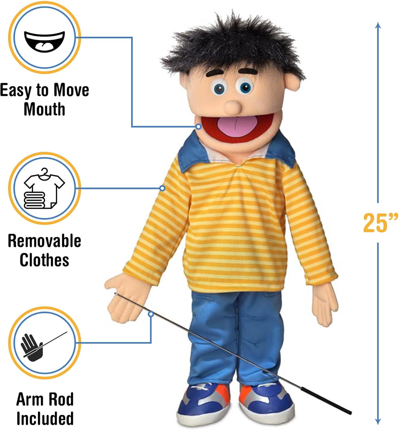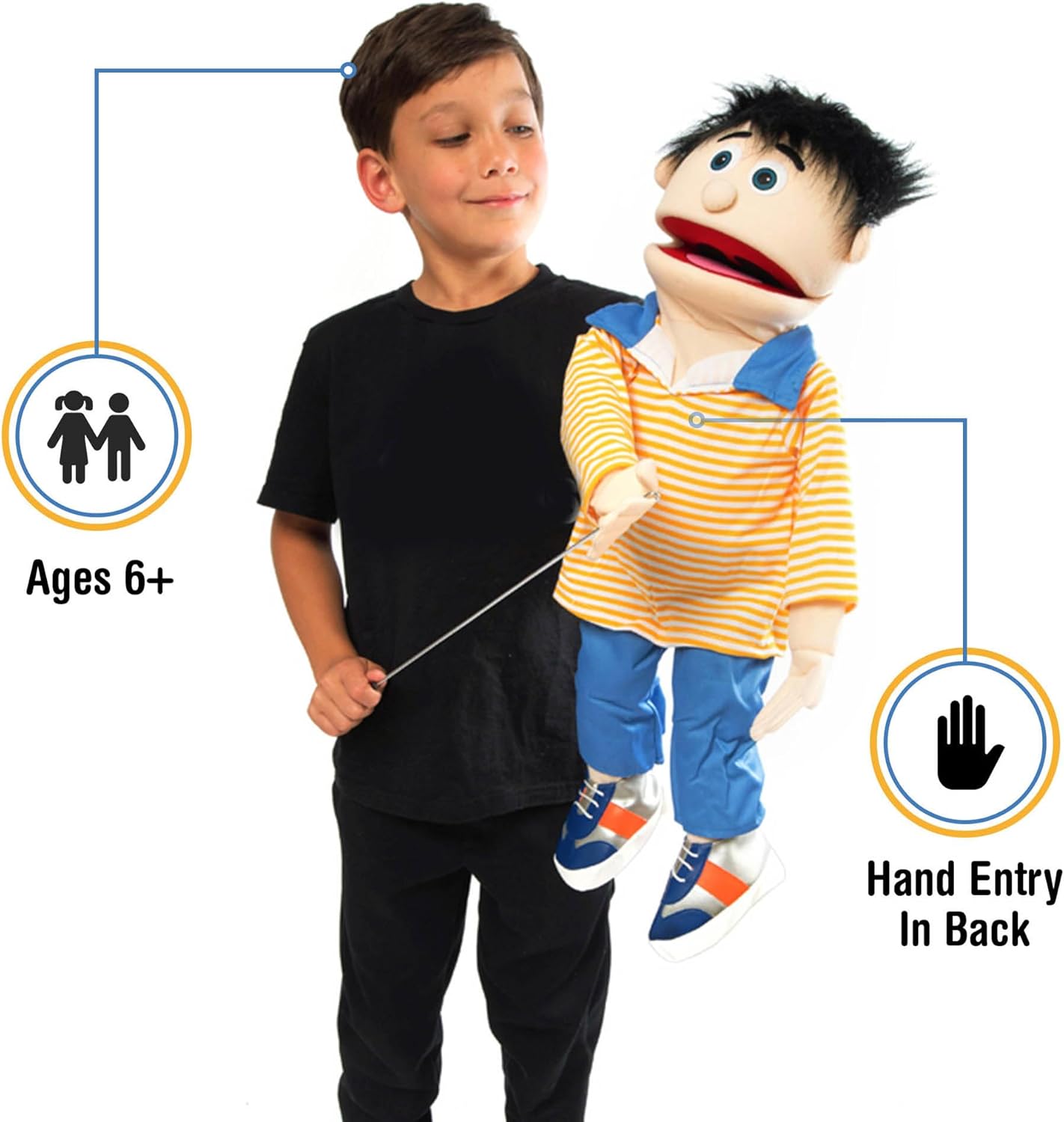 Burattino ventriloquo di alta qualità realizzato da Silly Pups. Bocca facile da muovere. Ingresso manuale dal retro del burattino. Include 1 asta di controllo del braccio che può essere agganciata a entrambe le mani per il movimento. Altezza: circa 65 cm. Peso leggero: ca. 500 g. Il burattino può essere rivestito con abiti per bambini dai 18 mesi in su.