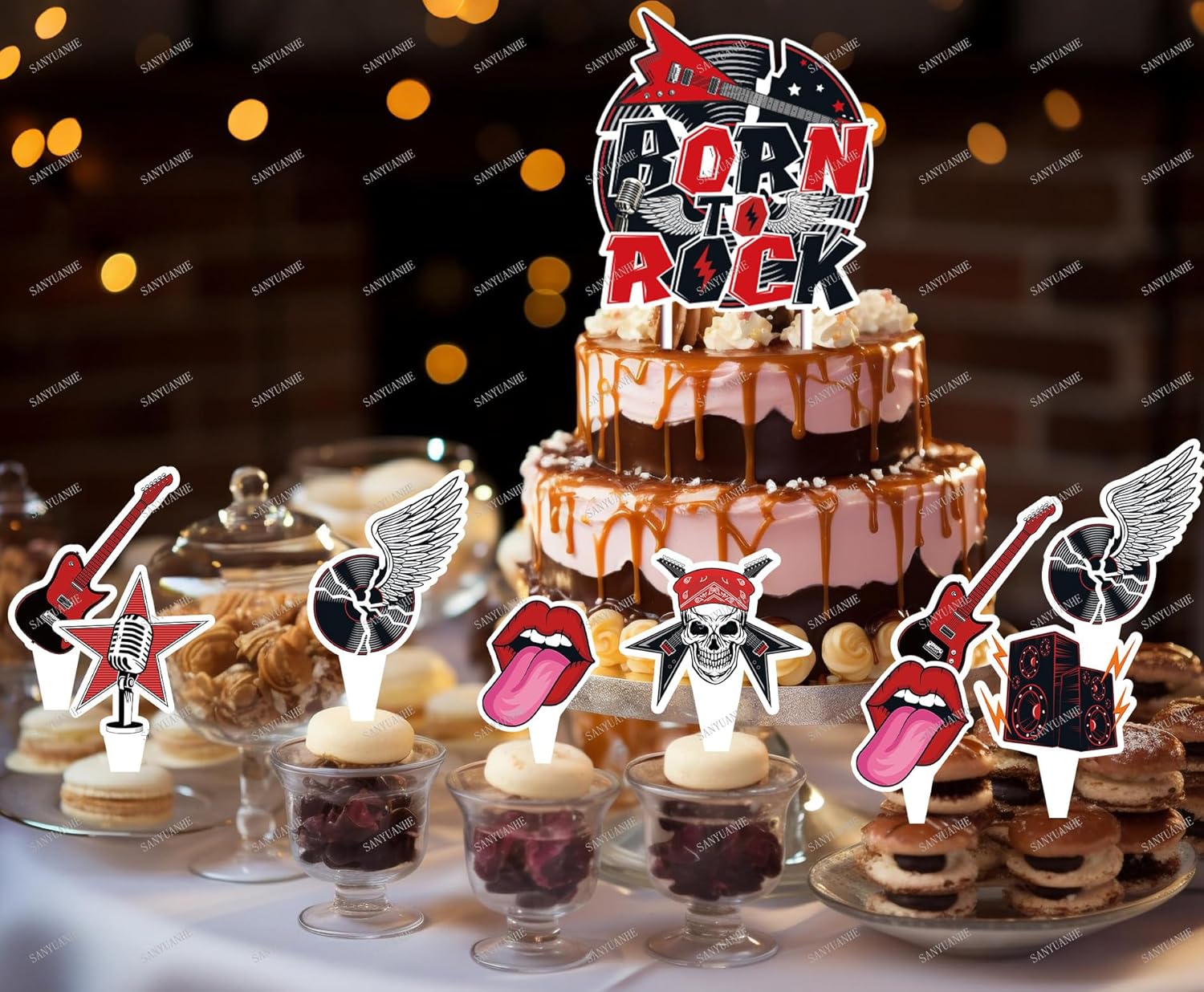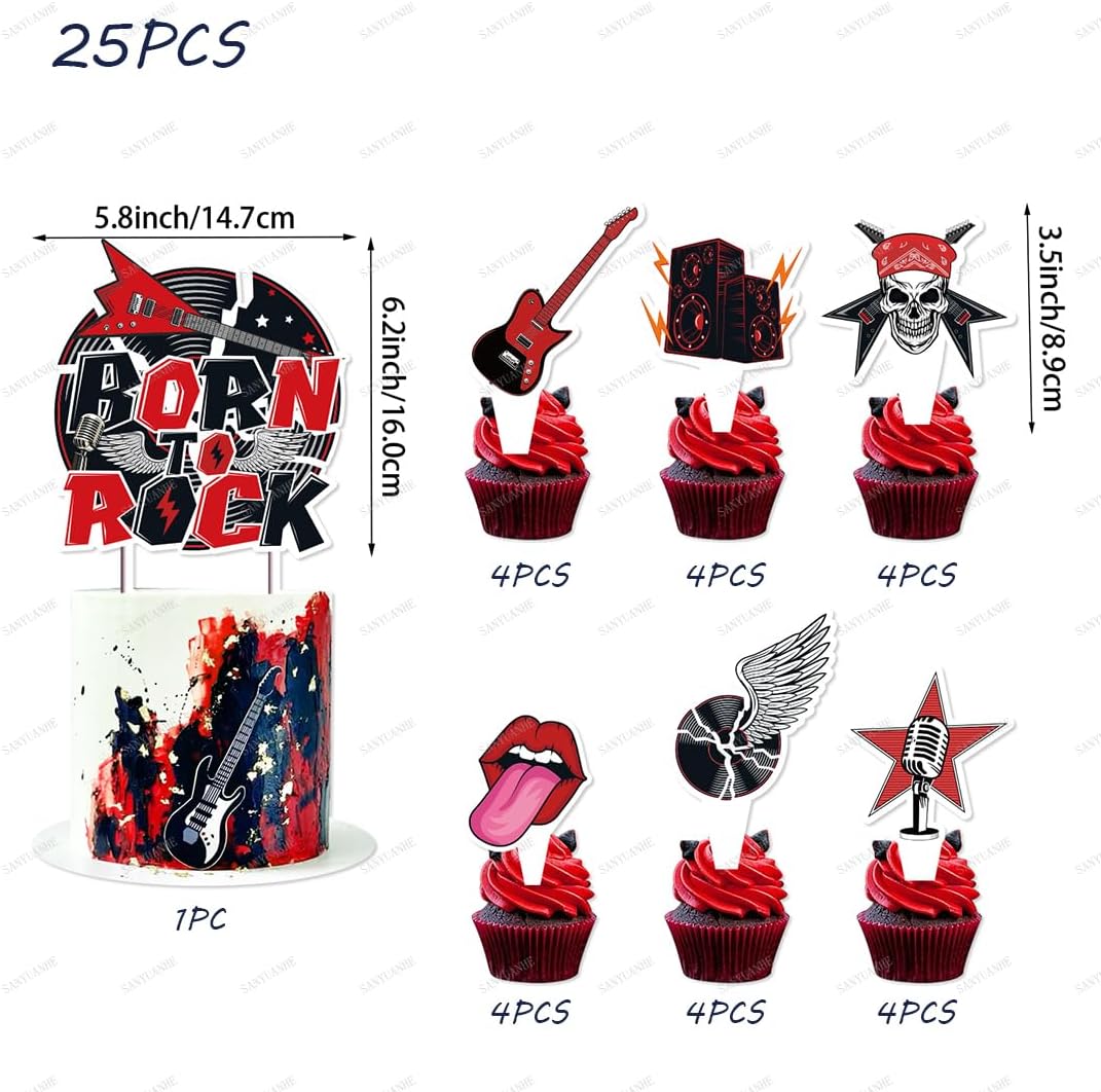 Decorazione rock'n'roll: set di decorazioni per gonne, 1 grande decorazione per torte + 24 piccole decorazioni per torte, combinabile con cupcake per torte più attraenti. Decorazione per torta Rock-Party. Materiale: in robusto cartone e bambù, motivo nero e rosso, inodore e facile da pulire, sicura e facile da usare. Facile da montare: questa decorazione per torta con motivo rock può essere facilmente fissata inserendo le bacchette di bambù nella torta. Perfetto per torte, cupcake, gelati, frutta, dessert, biscotti, formaggi e molto altro ancora. Dai alle tue prelibatezze un aspetto più appetitoso e rendi la tua festa ancora più divertente. Torta fai da te: con diversi design, soddisfa le tue esigenze di decorazione personalizzate, fai da te per compleanni, matrimoni e celebrazioni, libertà creativa per ogni occasione. Scena applicabile: è perfetto per feste a tema rock'n'roll, decorazione rock di compleanno, musica rock, feste scolastiche, matrimoni o altre feste importanti. Decorazioni per feste Killerclown per creare una bella atmosfera da festa.
