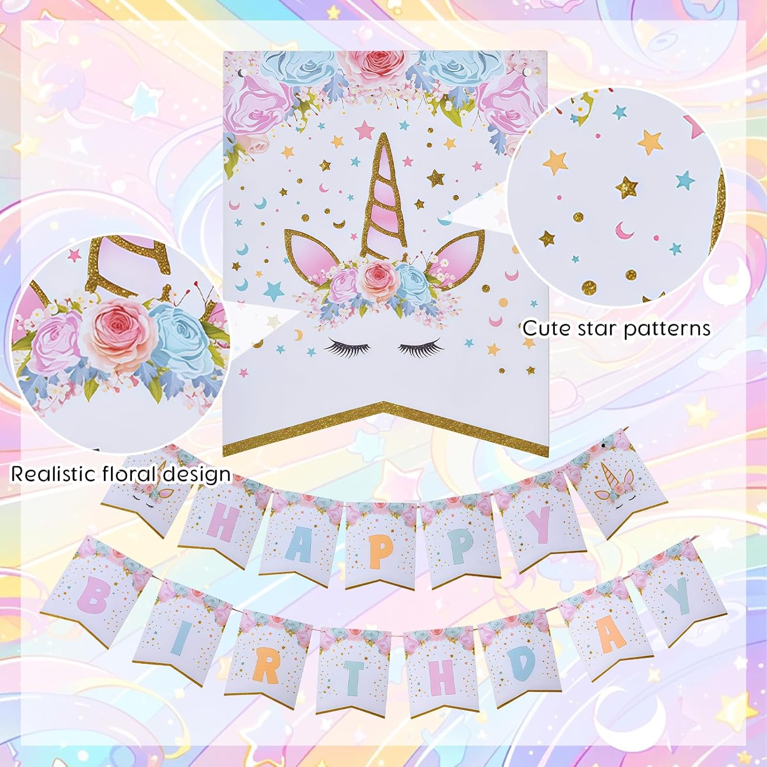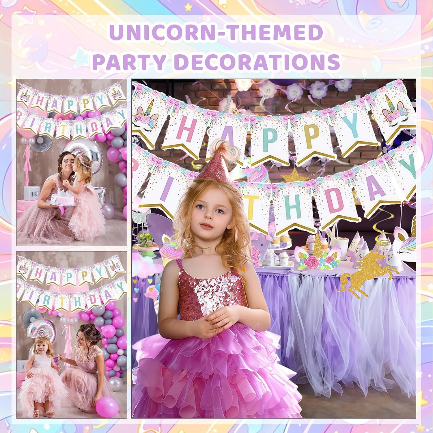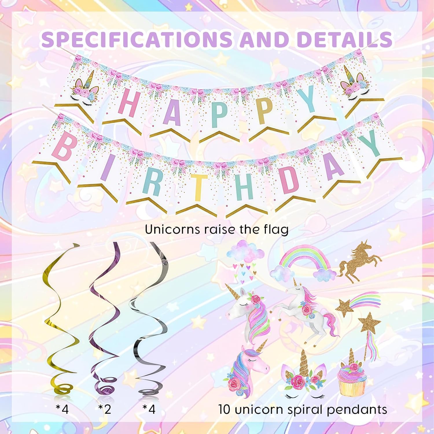 Decorazioni per feste con unicorno: include uno striscione di buon compleanno con un unicorno arcobaleno e ganci decorativi con unicorno per i compleanni dei bambini. Queste decorazioni sono ideali per dare un tocco speciale alla tua festa e stupire gli ospiti. Grucce decorative Unicorno: include 10 grucce in alluminio, 10 grucce con ritagli da 7" e 10 grucce con ritagli da 5", per un totale di 30 grucce in alluminio. Queste decorazioni versatili possono essere appese a pareti e soffitti, aggiungendo uno stile speciale alla tua festa. Utilizzo: appendili a pareti e soffitti per aggiungere uno stile speciale alla tua celebrazione. Combinali con altri accessori e decorazioni per feste a tema unicorno per creare un'atmosfera completamente festosa. Queste decorazioni sono ideali per aggiungere un tocco speciale alla tua festa e impressionare gli ospiti. Installazione semplice: risparmia tempo per altre importanti attività di pianificazione del compleanno. Queste decorazioni per feste con unicorno sono semplici da configurare e rendono la preparazione della tua festa facile e veloce. Riutilizzabili e durevoli: le decorazioni a tema unicorno sono realizzate in plastica e carta di alta qualità, garantendone durata e riutilizzabilità. Puoi usarli ripetutamente per abbellire le tue feste e aggiungere un tocco speciale