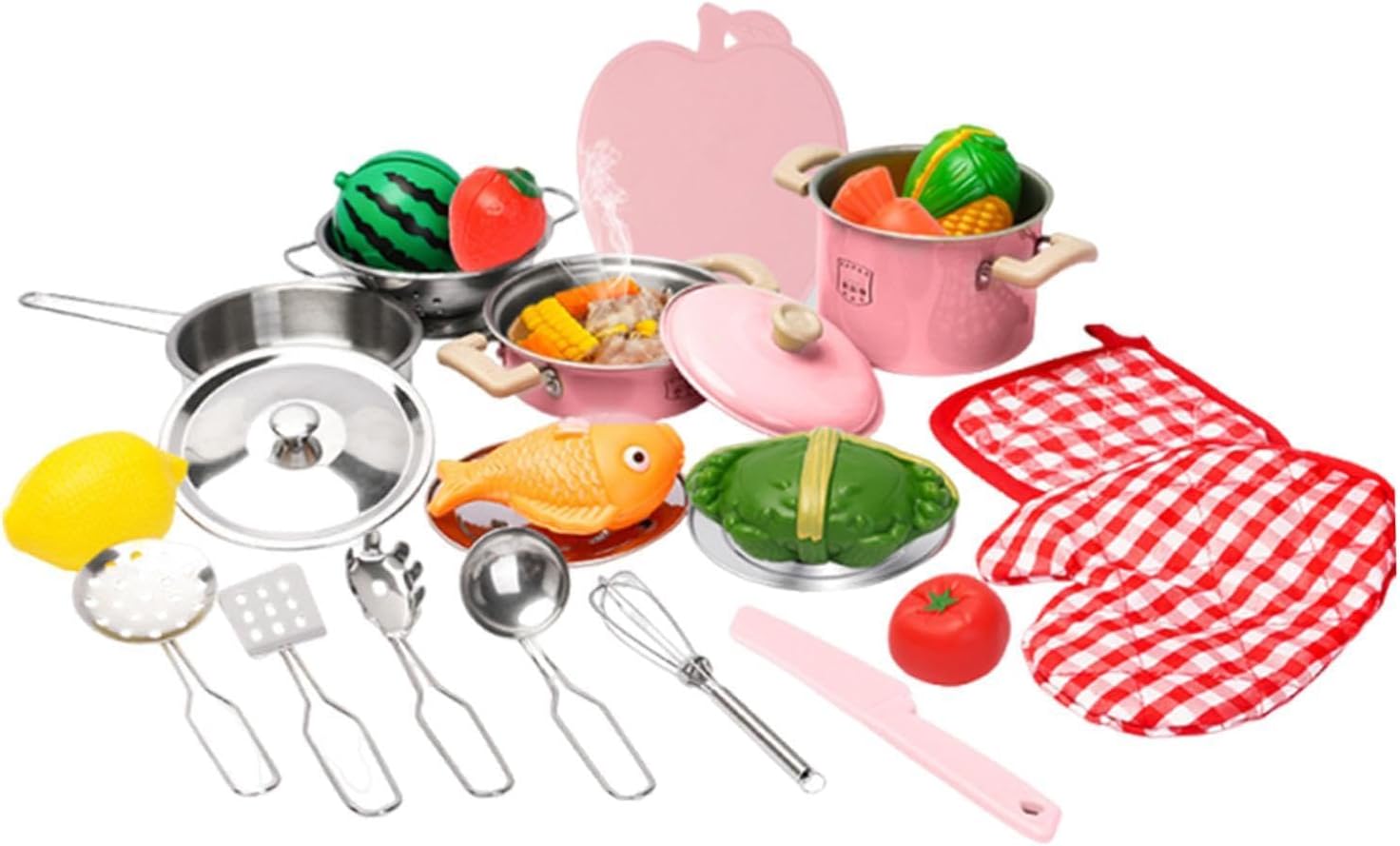 【Momenti preziosi 】Trasforma il gioco interattivo in apprendimento precoce! Il nostro kit di cucina per bambini ti aiuta a insegnare vere abilità culinarie, creando al contempo momenti di commovente legame familiare. 【Imparare giocando】Insegna ai bambini a giocare a fare chef, insegnando loro i fondamenti della cucina. Questo set da cucina educativo offre una nuova esperienza, trasformando i bambini in della creatività culinaria. 【Materiale】 utensili da cucina sono realizzati principalmente in acciaio inossidabile, resistente alla ruggine e dalla struttura robusta. Ottimi per bambini, neonati e bambini. 【Un bel regalo】Consigliato come regalo di compleanno o di festa per bambini di età superiore ai 3 anni 【Set di accessori per giocattoli da cucina per bambini】 Il set da 25 pezzi include una pentola a doppia parete, una fruttiera, un secchio per l'acqua calda, una padella, un piatto da caffè, un cucchiaio, un mestolo, una frittura, sbattitore per le uova, verdure e frutta simulate, ecc.