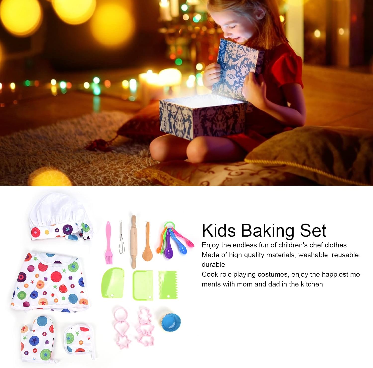Questo prodotto è stato testato per la sicurezza per garantire un uso sicuro. I giocattoli fai -da -te possono coltivare efficacemente l'abilità e la capacità pratica di cura dei bambini e sperimentare una vita familiare diversa. Questo set di chef include 26 forniture per il gioco di ruolo in cucina, che possono soddisfare le diverse esigenze di produzione dei bambini e sperimentare diversi giochi di cucina. È un prodotto ideale per il fai -da -te. Questo set da cuocere per bambini per le ragazze sarebbe il compleanno dei bambini e i regali di Natale di sempre. Lascia che godano i festival con un divertimento senza fine portato da questo costume da chef per bambini. Questo set di cottura per i bambini è realizzato con materiali e lo chef set per bambini dai 3 anni in su è lavabile e riutilizzabile, molto facile da pulire e resistente per un uso a lungo. I bambini che indossano questo set di costumi da gioco chef possono godersi il momento più felice con mamma e papà in cucina e che possono incoraggiare la creatività e l'individualità dei tuoi figli.