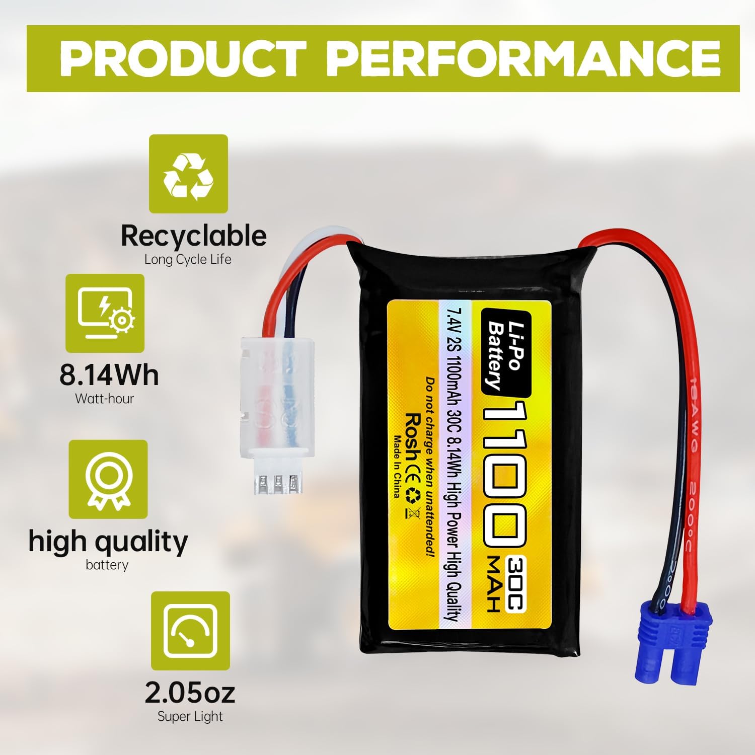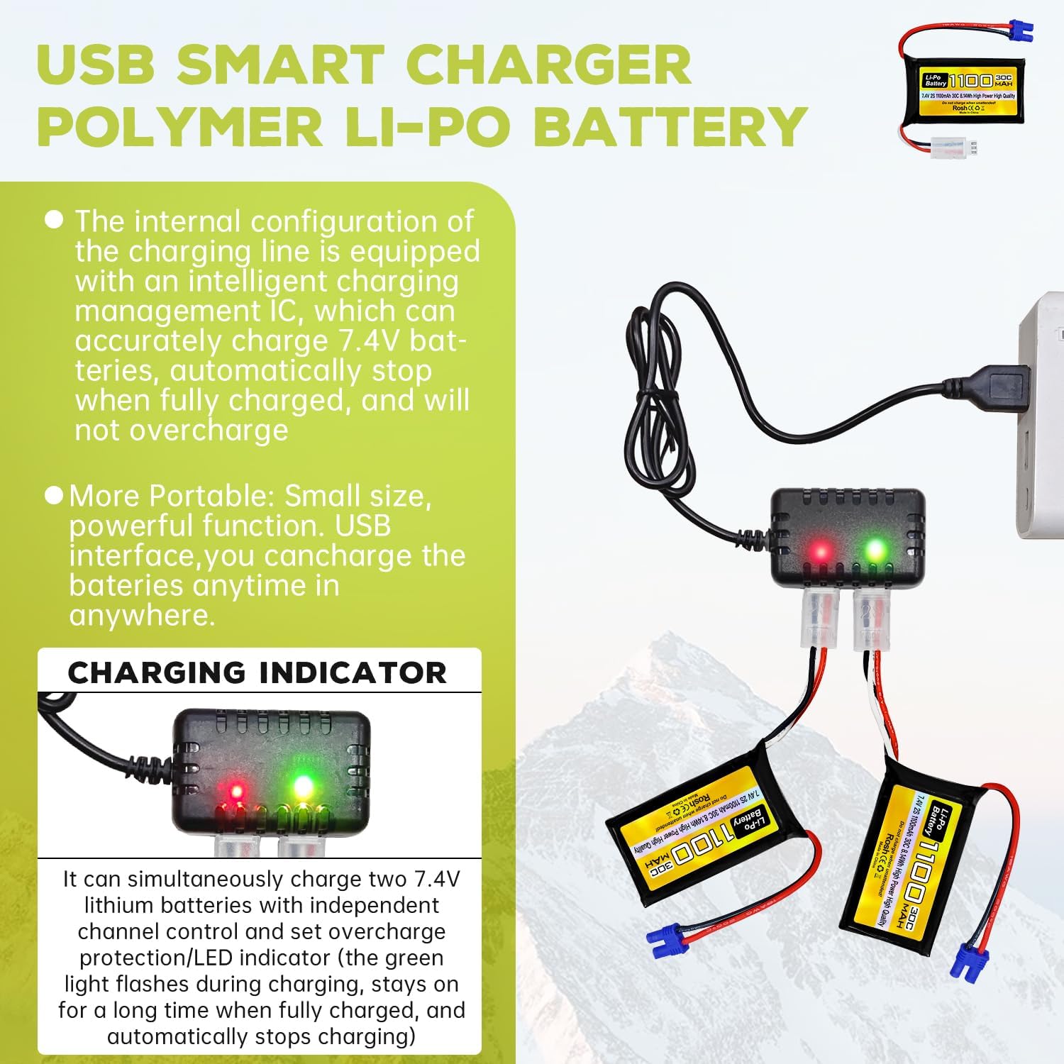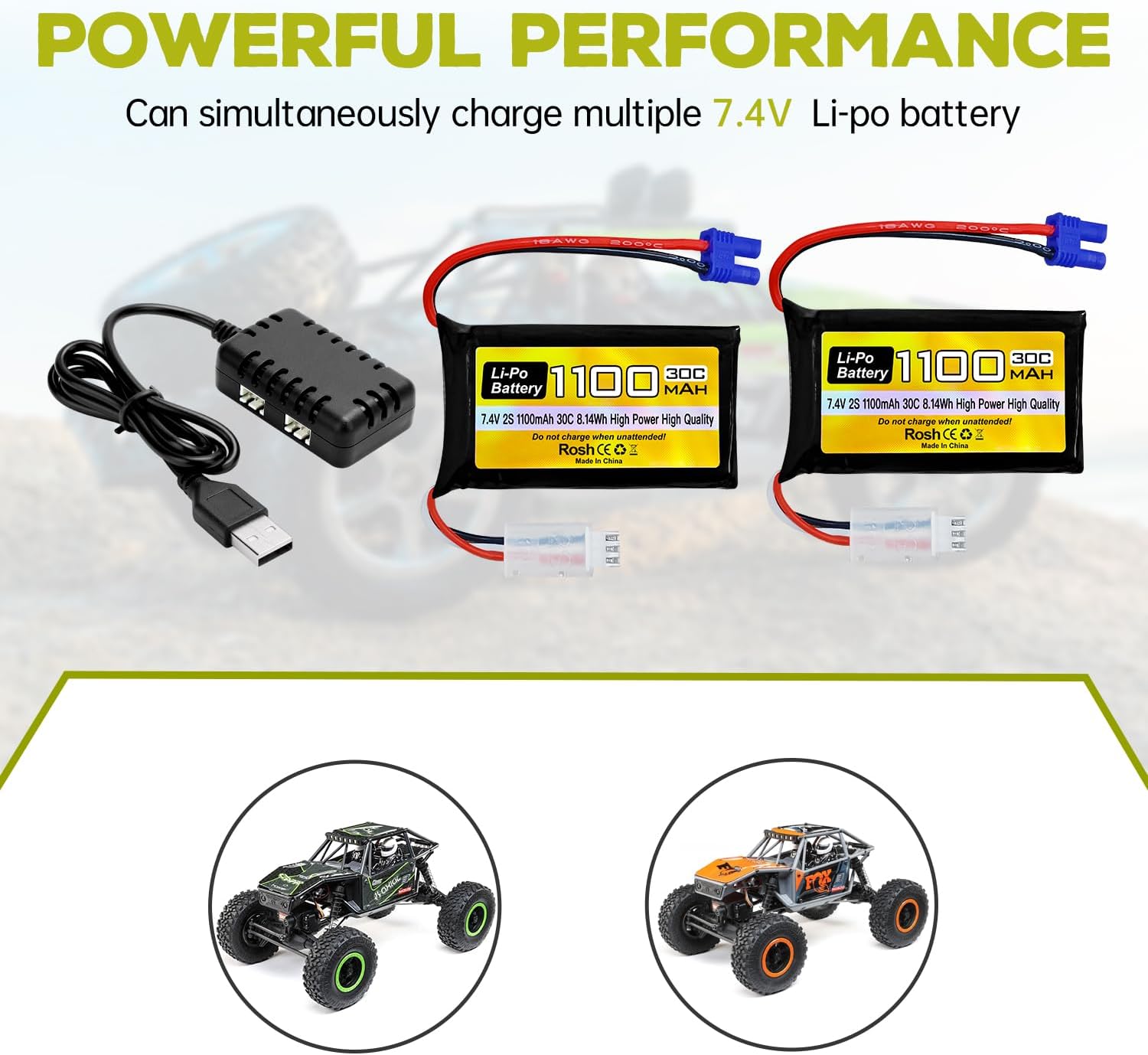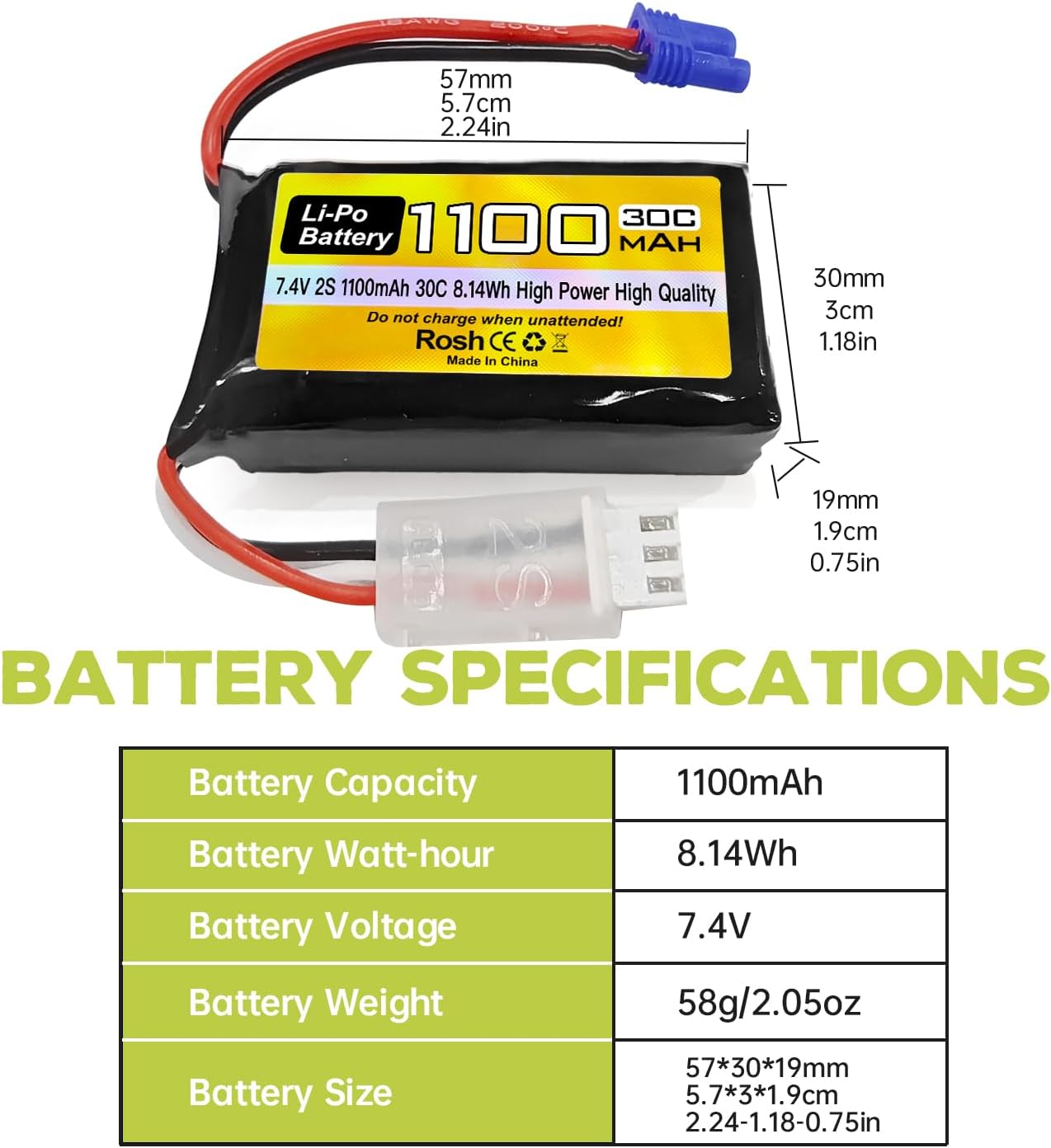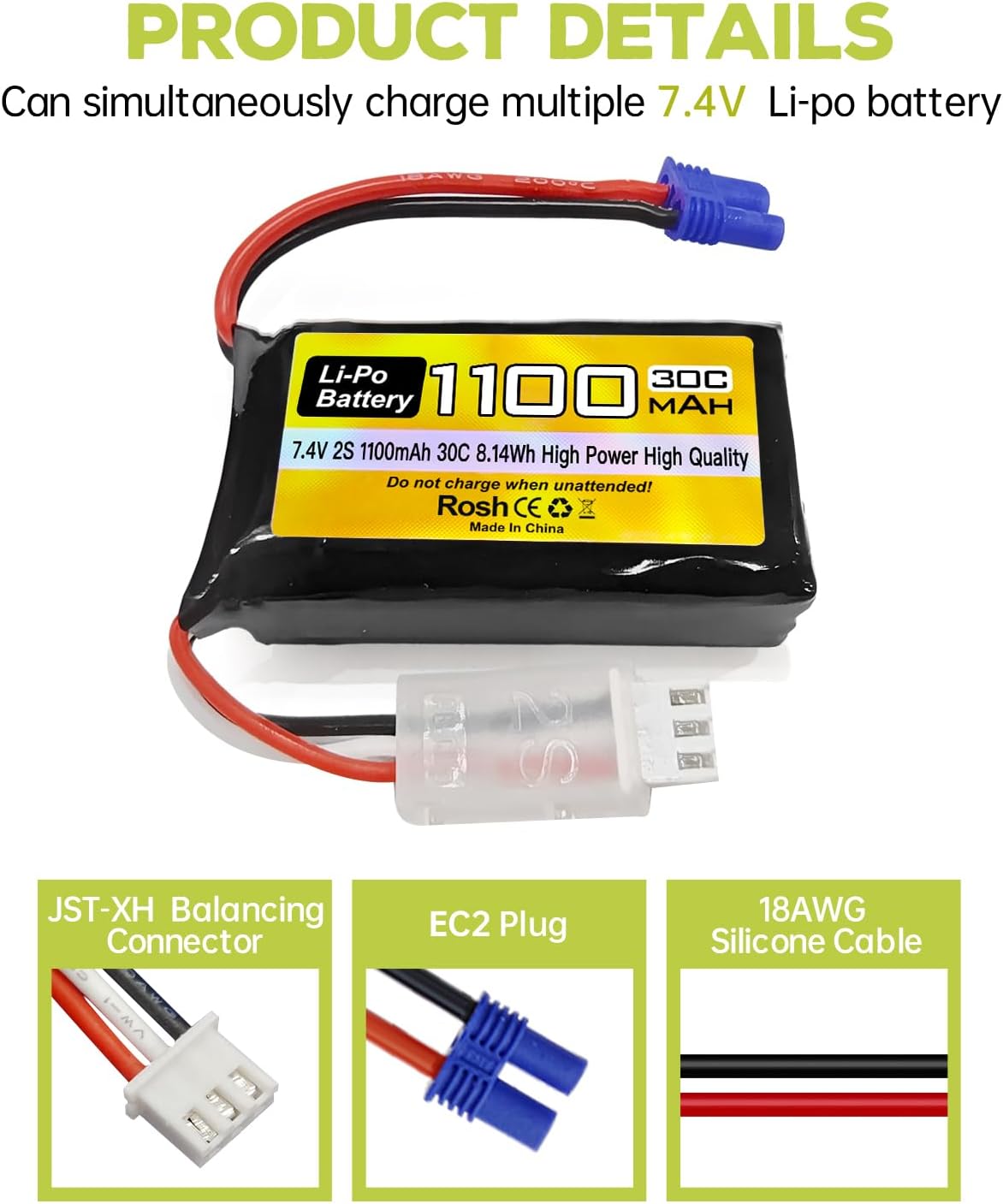 Compatibilità: Questo 7.4V 1100mAh 2S EC2 Plug Lipo batteria con 2-in-1 caricabatterie è adatto per AXIAL UTB18 auto RC, aerei RC, drone FPV, elicottero drone quadcopter e modelli di gara barca RC ingegneria veicolo RC auto, auto giocattolo elettrico batteria. Protezione: La batteria è dotata di un meccanismo di protezione integrato che ne garantisce l'uso e la ricarica in tutta sicurezza. Questa caratteristica garantisce la durata della batteria, rendendola una scelta affidabile per le vostre attrezzature. Materiali di alta qualità: La batteria è realizzata con materiali di alta qualità, che ne garantiscono l'eccellente qualità e l'uso duraturo. Compatta e leggera: ha un design compatto con dimensioni di 58*30*18mm(2.29*1.8*0.7in) e pesa solo 55grammi/1PCS. Lista di imballaggio: Batteria 2PCS + Caricatore 2-in-1.