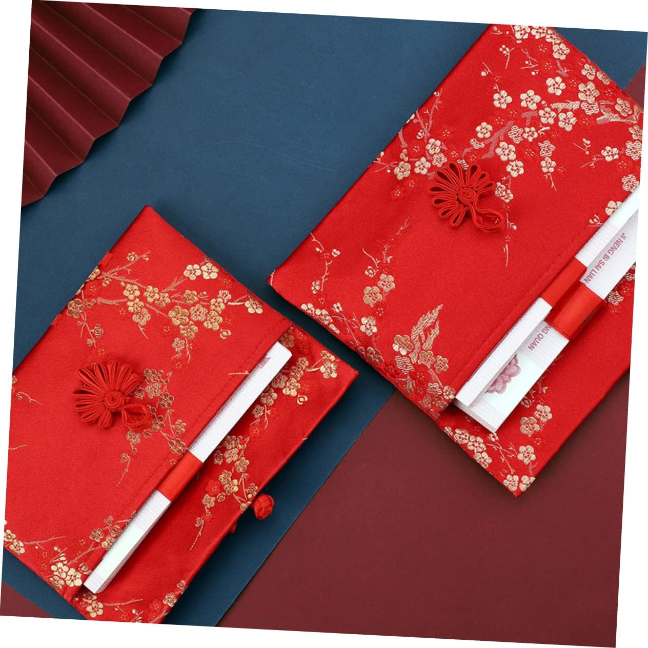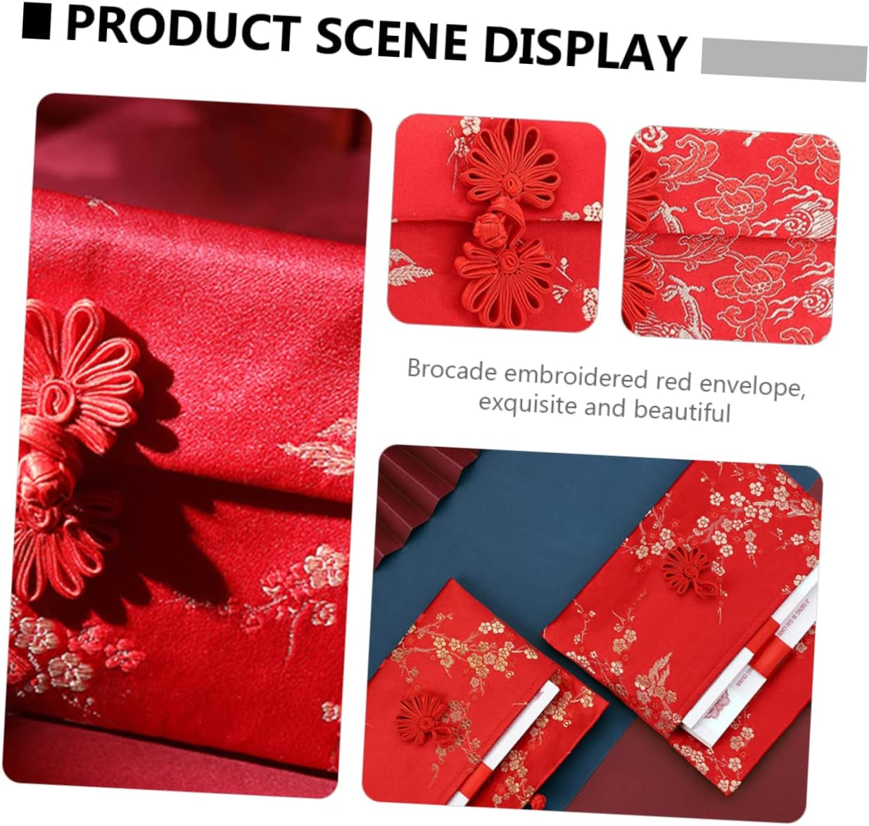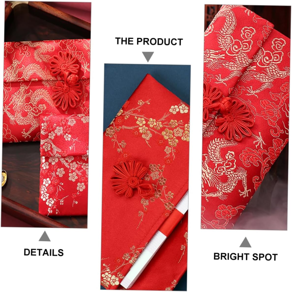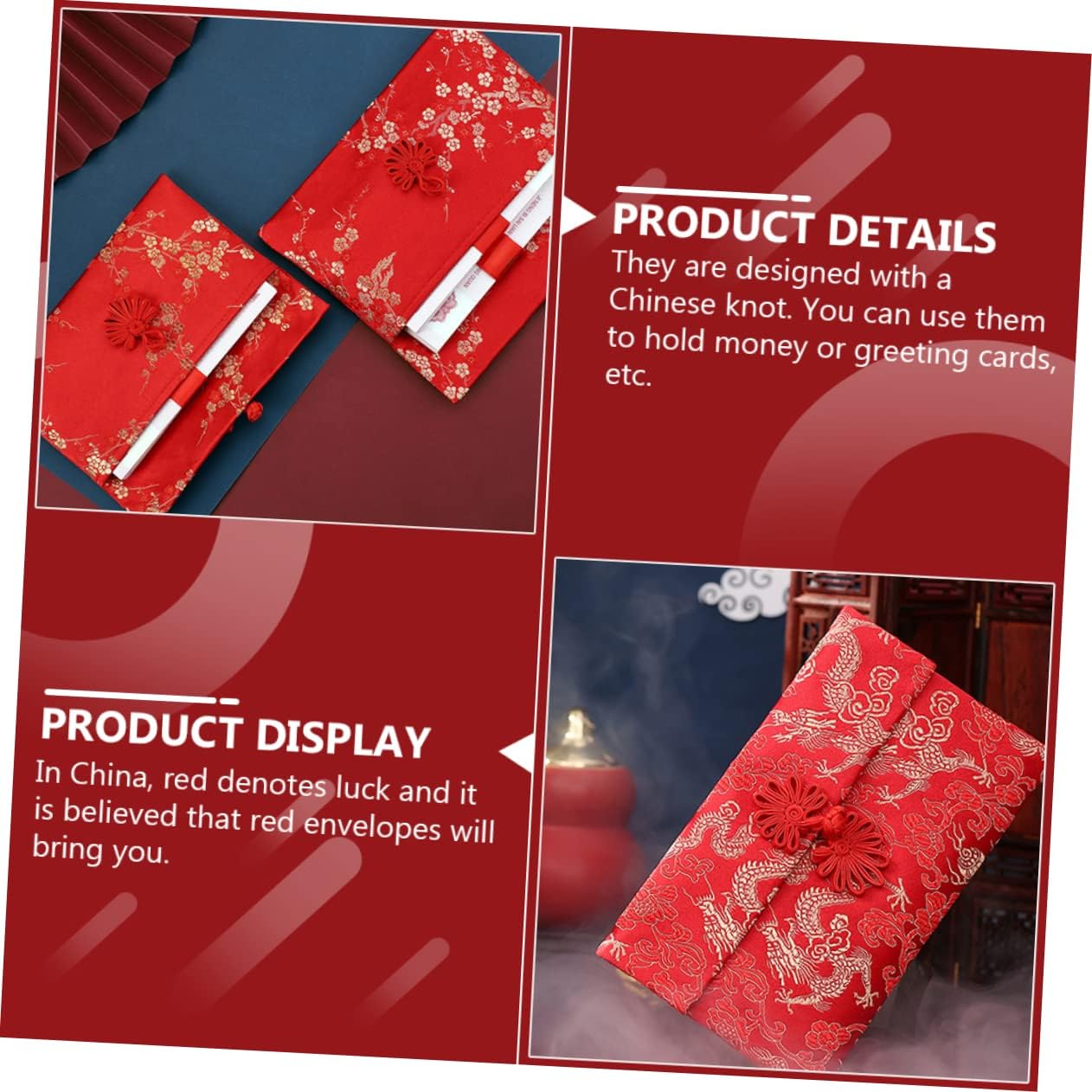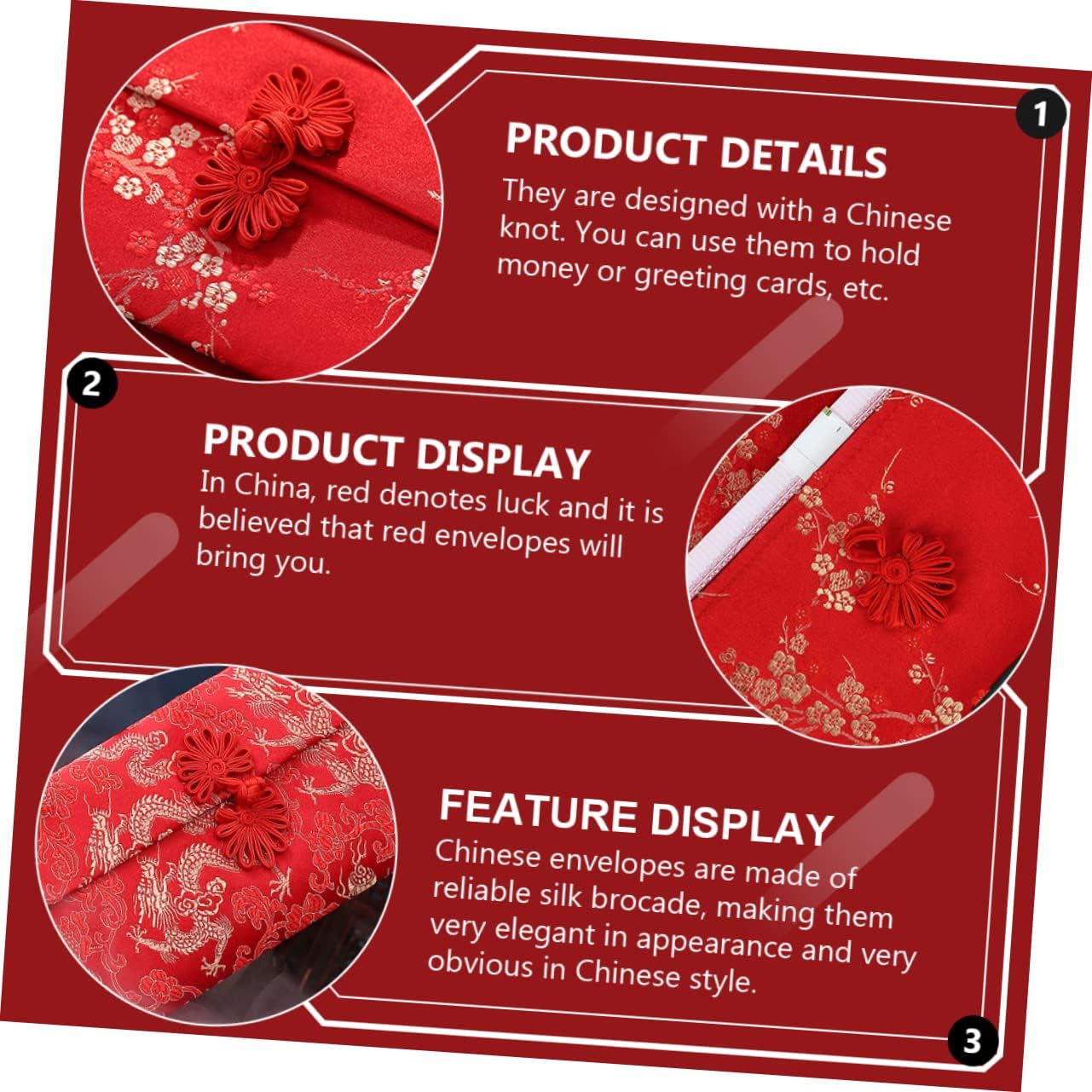 Le buste rosse sono realizzate con broccato di seta di con ricamo festivo cinese, design in stile e pulsanti di seta rendono l'eleganza insolita e . Con il design del bottone del nodo cinese e il forte sapore tradizionale cinese, sarà una piacevole sorpresa al ricevitore. Il rosso è il rappresentativo dei cinesi. Come , significa che desideri il ricevitore buona fortuna e salute. Queste buste cinesi sono dolci regali per bambini e anziani. È un di benedizione e compagno per parenti e amici nelle usanze cinesi.