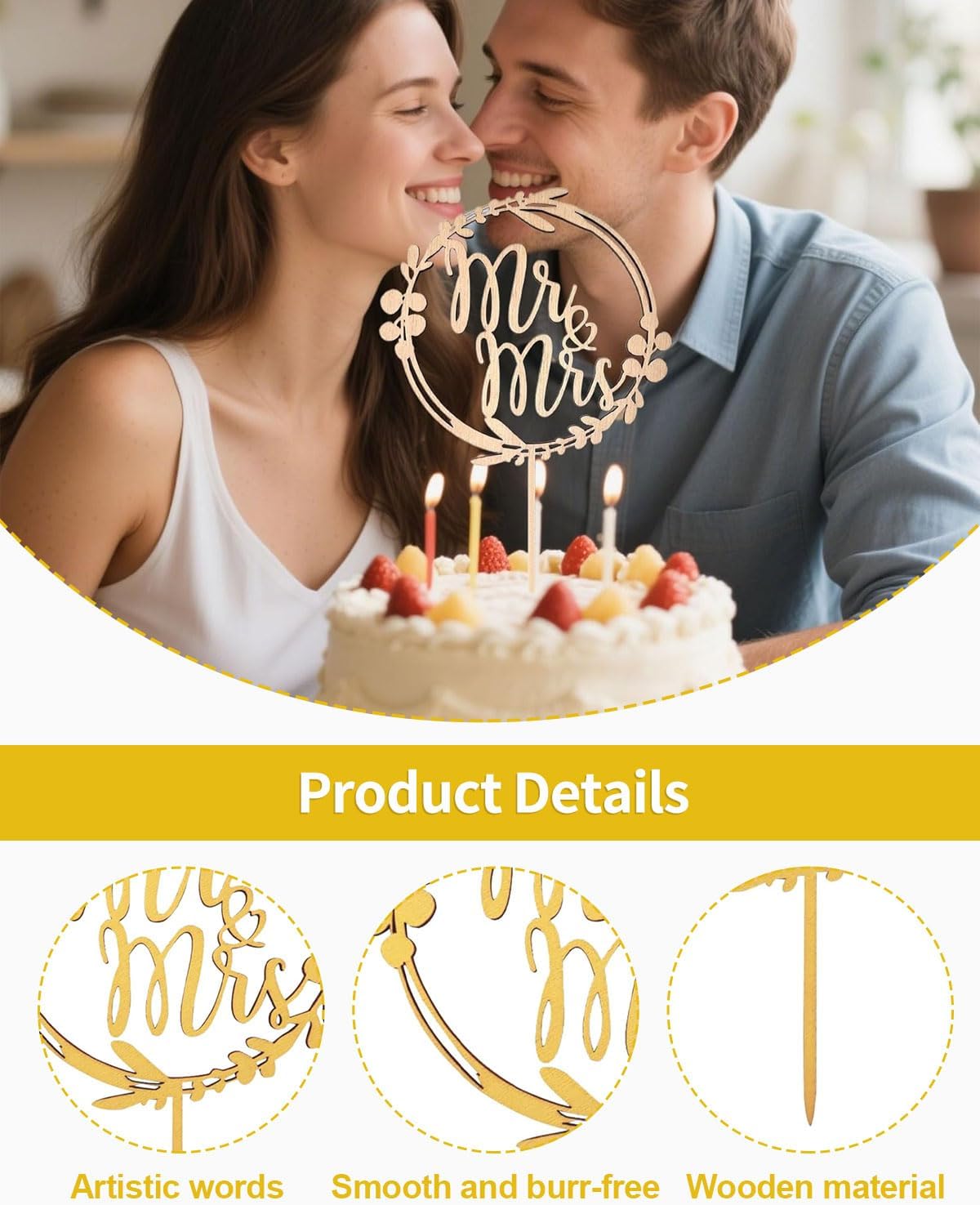 Set di decorazione personalizzata della torta di nozze: contiene una splendida decorazione della torta con le parole "Signore e Signora" e una decorazione della torta a forma di cuore con il nome o la data scritti. Lavorazione raffinata: ogni spina per torte è realizzata in legno di alta qualità e tagliata con una precisione tecnica laser per dare loro un aspetto elegante ed elegante. Versatile: queste decorazioni torte sono perfette per matrimoni, fidanzamenti, anniversari di matrimonio e altre occasioni. Questi elementi decorativi sono i punti salienti di ogni torta di nozze, dando un senso personale a ogni torta. Nota: Si prega di notare che questi scaffali per torte sono solo per scopi decorativi e non sono adatti al consumo. Evitare il contatto con forno o forno a microonde. Si prega di tenere il prodotto al di fuori del contatto dei bambini. Servizio di qualità: sebbene il legno sia stato lavorato con cura, possono verificarsi lievi irregolarità durante il trasporto.