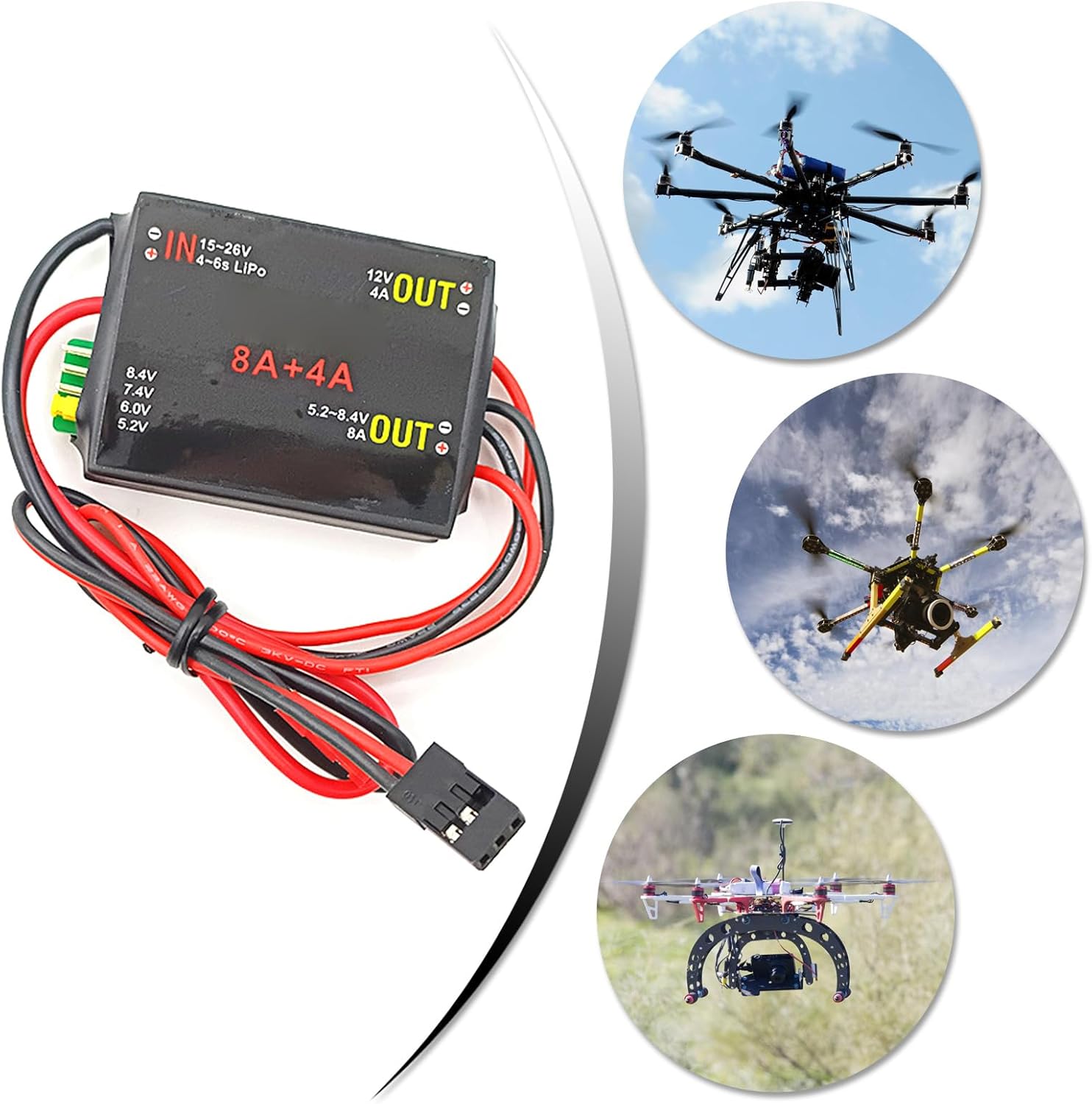 Le tensioni uscita possono essere selezionate in marce (5.2/6.0/7.4/8.4V), che può soddisfare l'uso attrezzatura del modello aeromobile varie tensioni specifiche Con protezione sovracorrente, in output Short Circuits Protective Superfente protettivo e altre funzioni Utilizzando chip regolatore tensioni efficienza, l'efficienza conversione 90% Switch esterni, facili da aprire e chiudere Ubec indicatori lavoro, che illumina quando l'UBEC funziona normalmente