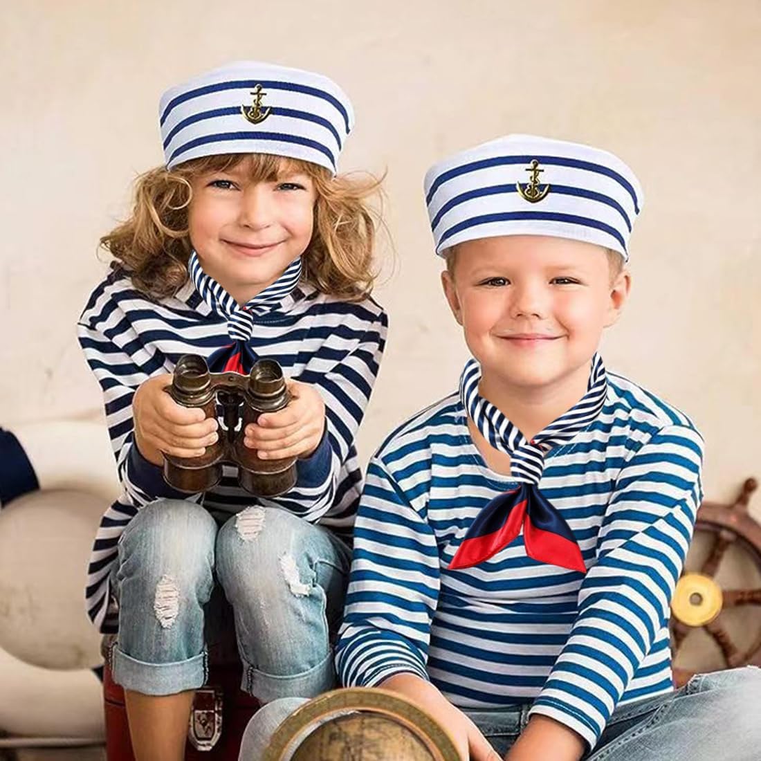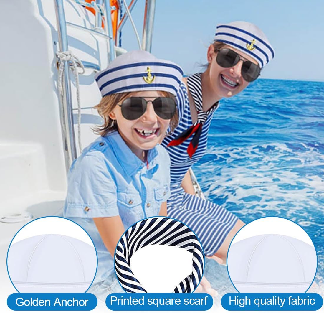 Set completo: Riceverai 2 cappelli da marinaio a righe blu e bianche e 2 fazzoletti quadrati con bordi rossi e strisce blu – perfetti per un autentico look da marinaio Materiale confortevole: Il cappello da marinaio e il fazzoletto sono realizzati in poliestere di alta qualità, morbido e liscio sulla pelle. Il cappello è decorato con un elegante motivo a barca a vela sulla parte frontale Adattabilità delle taglie: Il cappello da marinaio ha un'altezza della tesa di 9 cm e una circonferenza di 58 cm, ideale per adulti e adolescenti con una circonferenza della testa di circa 58 cm. Regolabile con forcine per taglie più piccole. Il fazzoletto misura 50 x 50 cm Occasioni versatili: Perfetto per feste a tema nautico, feste in costume, vacanze, pesca, spettacoli teatrali, cosplay, feste in piscina e molte altre occasioni in cui è richiesto un look marittimo Accessorio ideale per feste: Questo set da marinaio è un regalo perfetto per amici, familiari o per te stesso. Aggiunge un tocco speciale a ogni festa e diventa sicuramente un elemento di grande attrazione