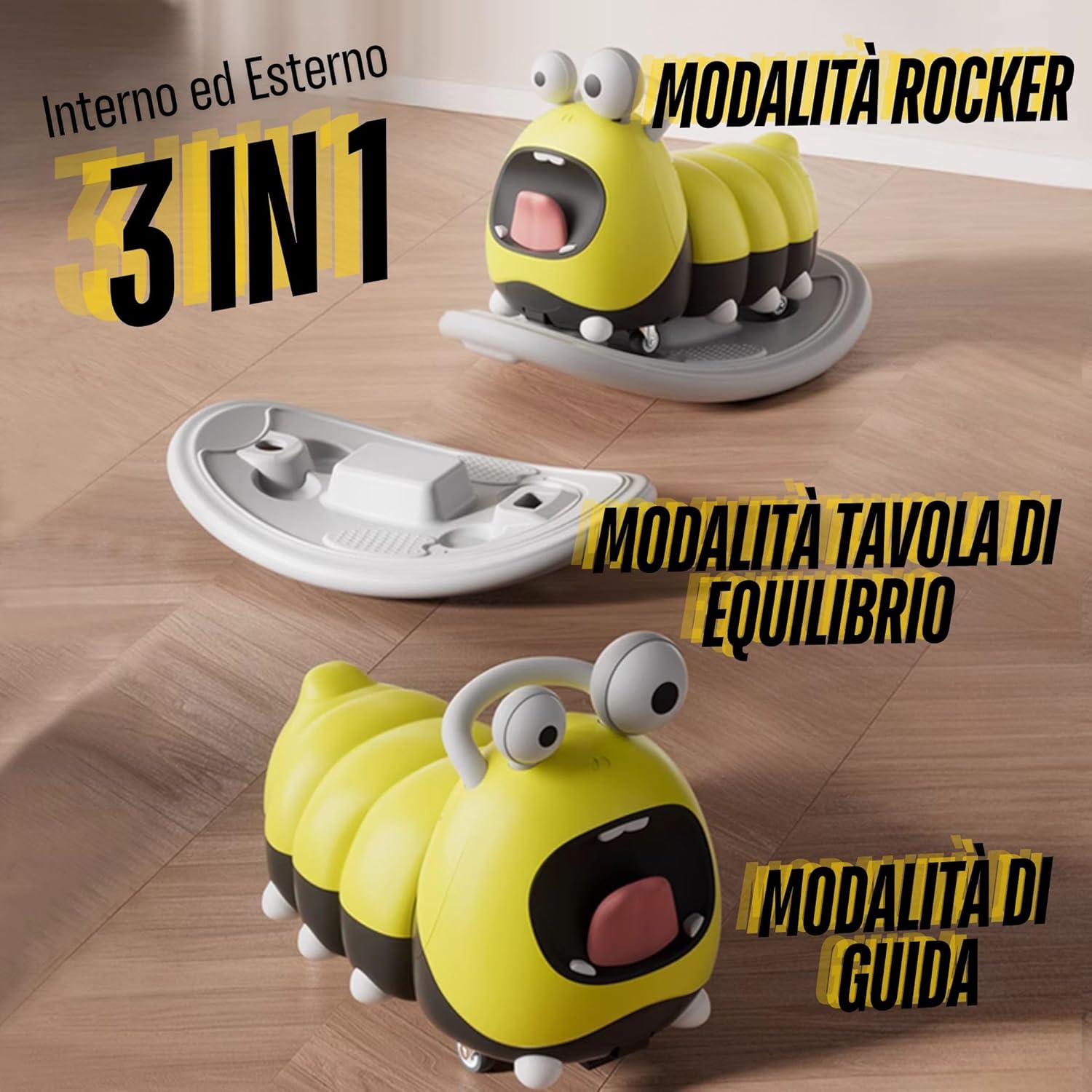 Design 3 in 1: scivolo, animale a dondolo e tavola di bilanciamento: un giocattolo versatile che cresce con il vostro bambino. Può essere utilizzato come scivolo classico, come divertente animale a dondolo o come tavola di bilanciamento, per ore di divertimento e promozione motoria. Sicuro a partire da 1 anno – Supporta l'equilibrio e lo sviluppo della corsa, appositamente progettato per bambini a partire dai 12 mesi. Supporta lo sviluppo di equilibrio, coordinazione e mobilità in modo giocoso. Materiale PP di alta qualità e sicuro: senza BPA, realizzato in robusto polipropilene alimentare (PP), privo di BPA e plastificanti nocivi, sicuro per neonati e bambini. Portata fino a 30 kg – durevole e stabile. Il veicolo antiscivolo YOYO supporta fino a 30 kg e offre una stabilità ben studiata durante l'oscillazione e la rotazione, ideale per interni ed esterni. Design adatto ai bambini: regalo perfetto per bambini. Il design a bruchi realizzato con amore, le morbide curve e i colori allegri rendono il veicolo 3 in 1 un regalo ideale per bambini a partire da 1 anno – sia per compleanno, Natale o semplicemente di tanto in tanto.
