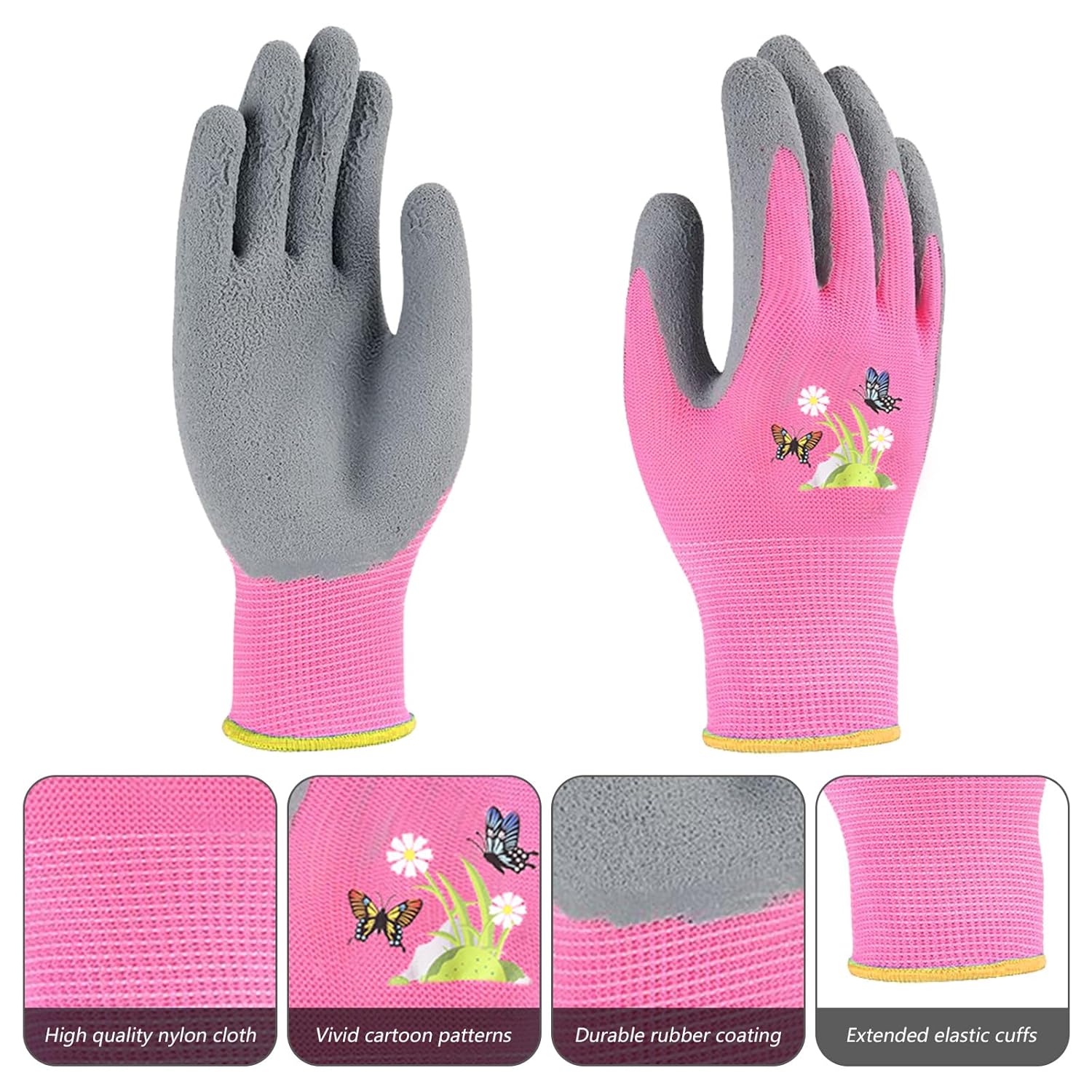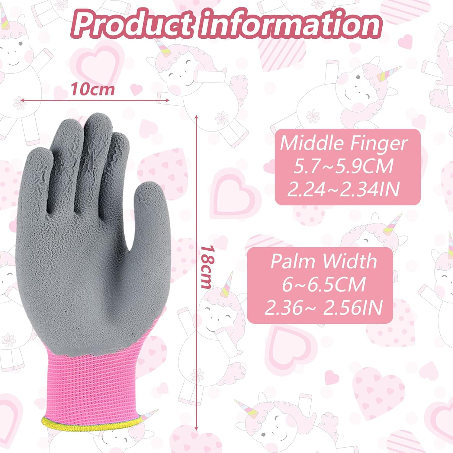 Guanti da lavoro per bambini: guanti da giardinaggio di sicurezza per bambini dai 3 agli 8 anni, adatti per il giardinaggio domestico, attività scolastiche all'aperto e altro ancora. Materiale di alta qualità: i guanti da giardinaggio per bambini sono realizzati in lattice e maglieria ad alta elasticità; i palmi e le dita dei guanti sono rivestiti in lattice per proteggerli da graffi, sporco, grasso e oli; Il tessuto ad alta elasticità è traspirante e accogliente per un uso confortevole! Design unico: ogni paio di guanti in lattice per bambini è progettato con un motivo diverso (unicorni, farfalle, fenicotteri, ecc.) in colori vivaci e accattivanti! Questi guanti protettivi per bambini assicurano che le mani del tuo bambino siano sicure e pulite. Facile da usare: il tessuto altamente elastico si adatta alle dita e non le ostacola. I bambini possono esplorare e giocare a loro piacimento, piantare fiori, coltivare verdure, osservare la natura e molto altro ancora. Ampia applicazione: i guanti di sicurezza sono adatti come regalo per le ragazze, ma anche per lavori leggeri, giardinaggio, aratura, raccolta di conchiglie sulla spiaggia, diserbo, attività all'aperto, esplorazione e molto altro.