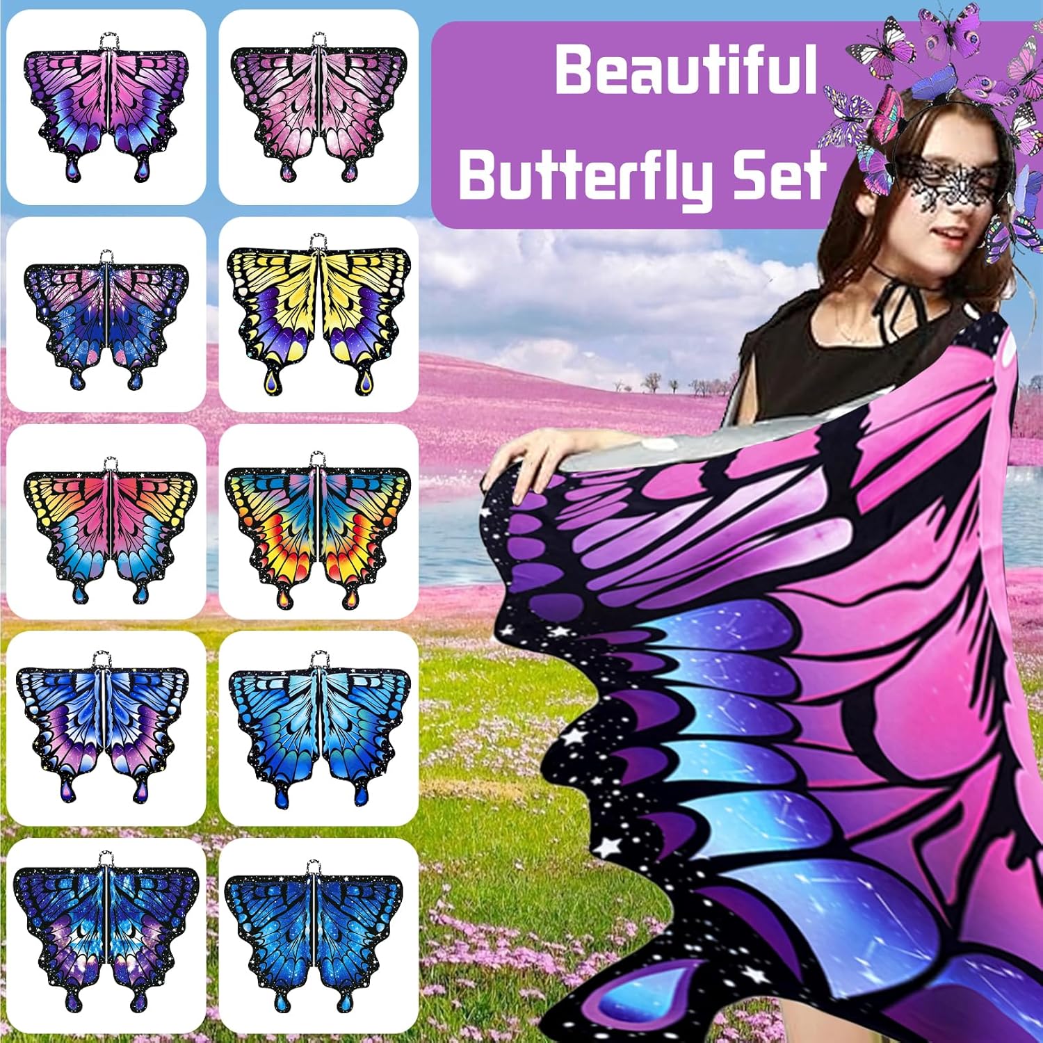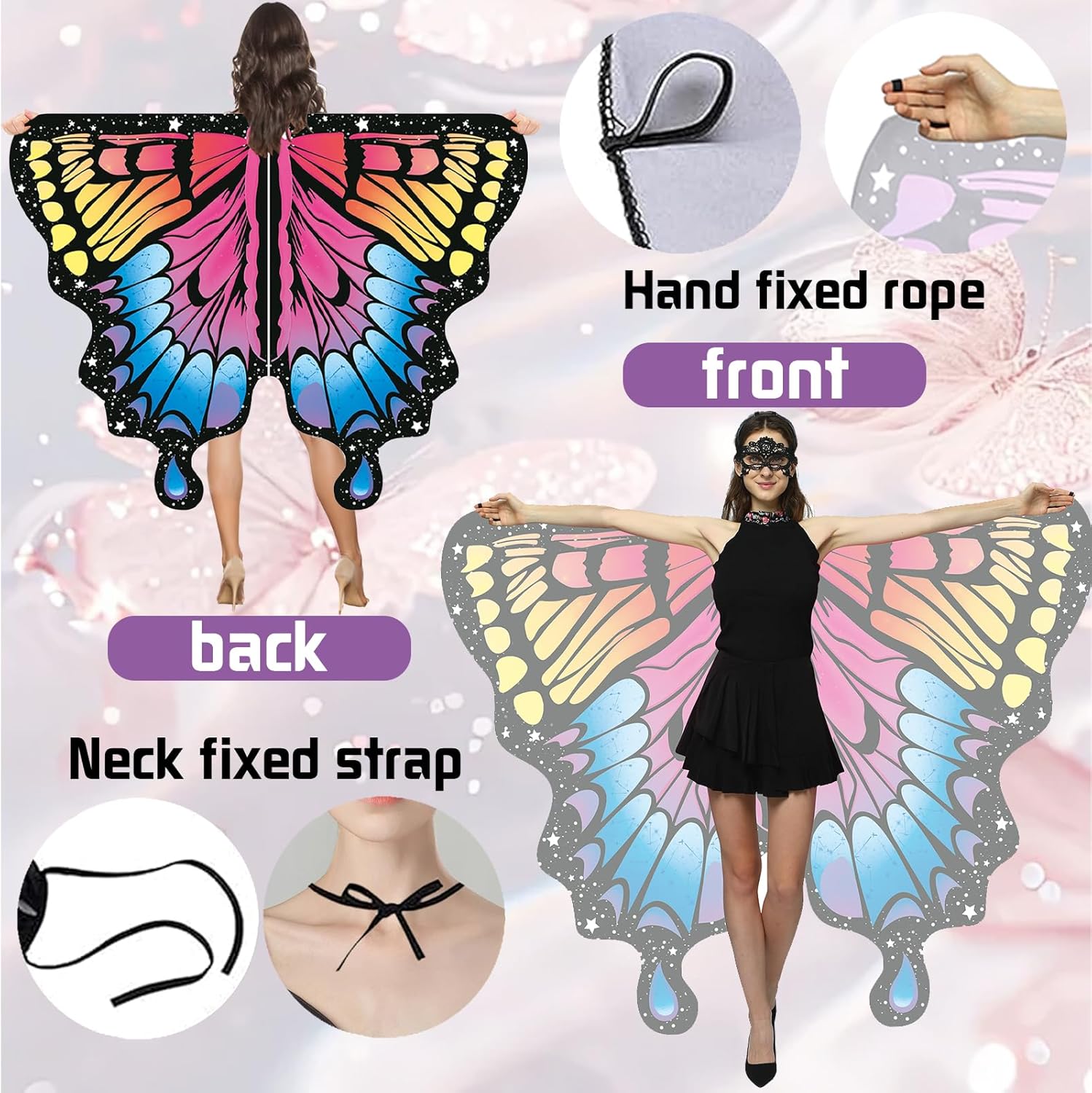 3 Pezzi Ali Farfalla Costume, 168 x 135 cmMantello Ali Farfalla, Farfalla Scialle Ragazza, Cerchietto Fascia Farfalla, Farfalla Donna Maschera, per Natale Halloween Cosplay Carnevale