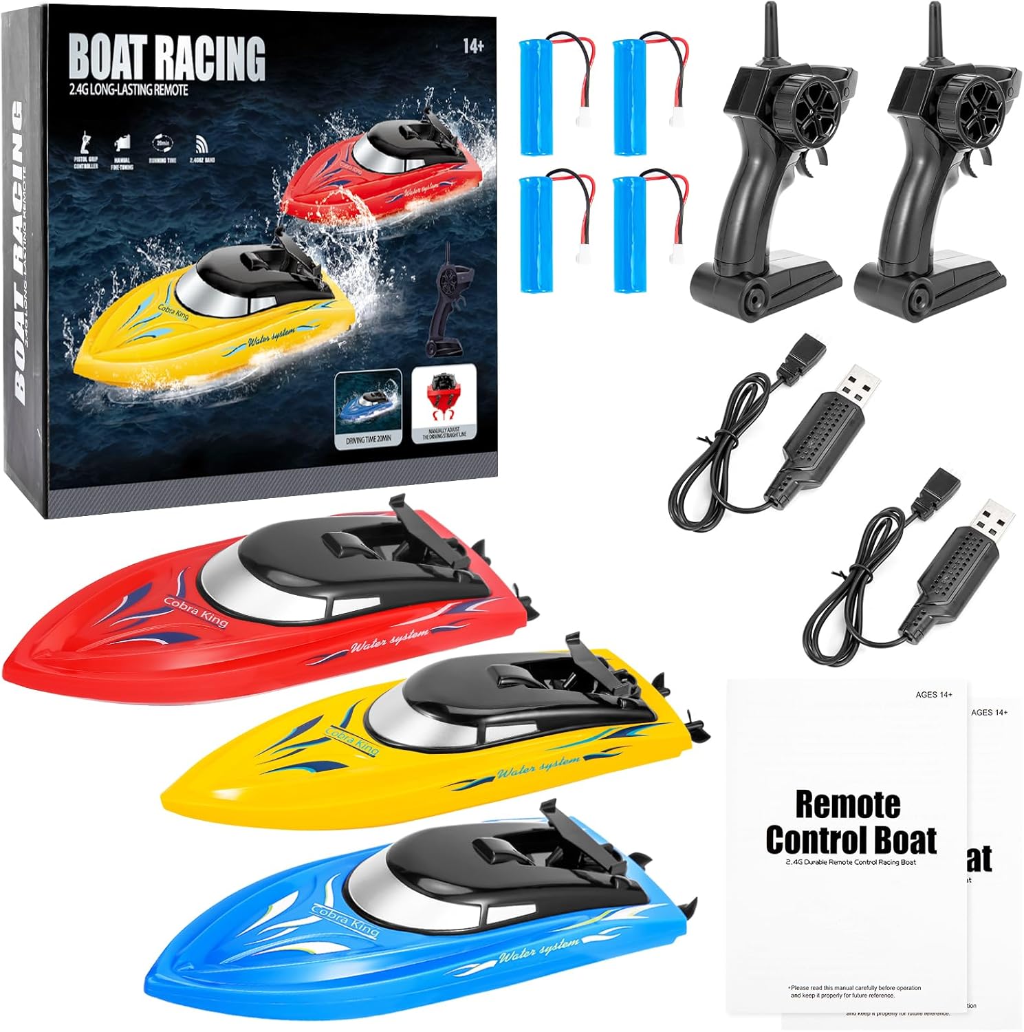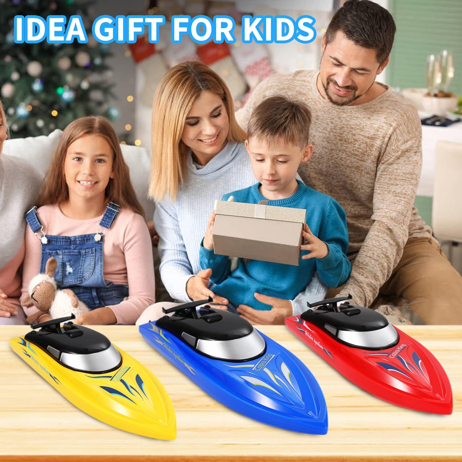 Barca telecomandata: set di 3 barche telecomandate per bambini con 6 batterie ricaricabili (di cui 3 batterie in barca), 3 telecomandi, 3 cavi di ricarica USB, 3 manuali per l'utente, 3 cacciaviti è il miglior regalo per bambini e ragazzi. (Si prega di mettere la barca in acqua prima di accendere il controller, è necessario lavorare in acqua). Telecomando ad alta velocità: la nave telecomando ad alta velocità che viaggia a velocità fino a 10 miglia all'ora sulla superficie è dotata di un telecomando a 4 canali 2, 4 GHz con un raggio di segnale di 40-50 metri, che si avvia solo quando viene rilevata l'acqua, protegge il motore e ne prolunga la durata. Lunga durata: la barca RC utilizza batteria ricaricabile da 3,7 V 650 mAh e cavo USB, il controller RC utilizza 2 batterie AA da 1,5 V (non incluse), tempo di riproduzione di 15-20 minuti e tempo di ricarica di 1,5 ore. Facile da controllare: i telecomandi ad alta velocità sono facili da tenere in mani piccole, in modo da poter imparare a controllare la barca a sinistra/destra/avanti. Con un telecomando a 2,4 GHz, è facile controllare la nave. Il miglior regalo per bambini/ragazzi: questo motoscafo perfettamente confezionato è un ottimo regalo per compleanno, Natale e Capodanno, la plastica ABS è più sicura e adatta per ragazzi e ragazze.