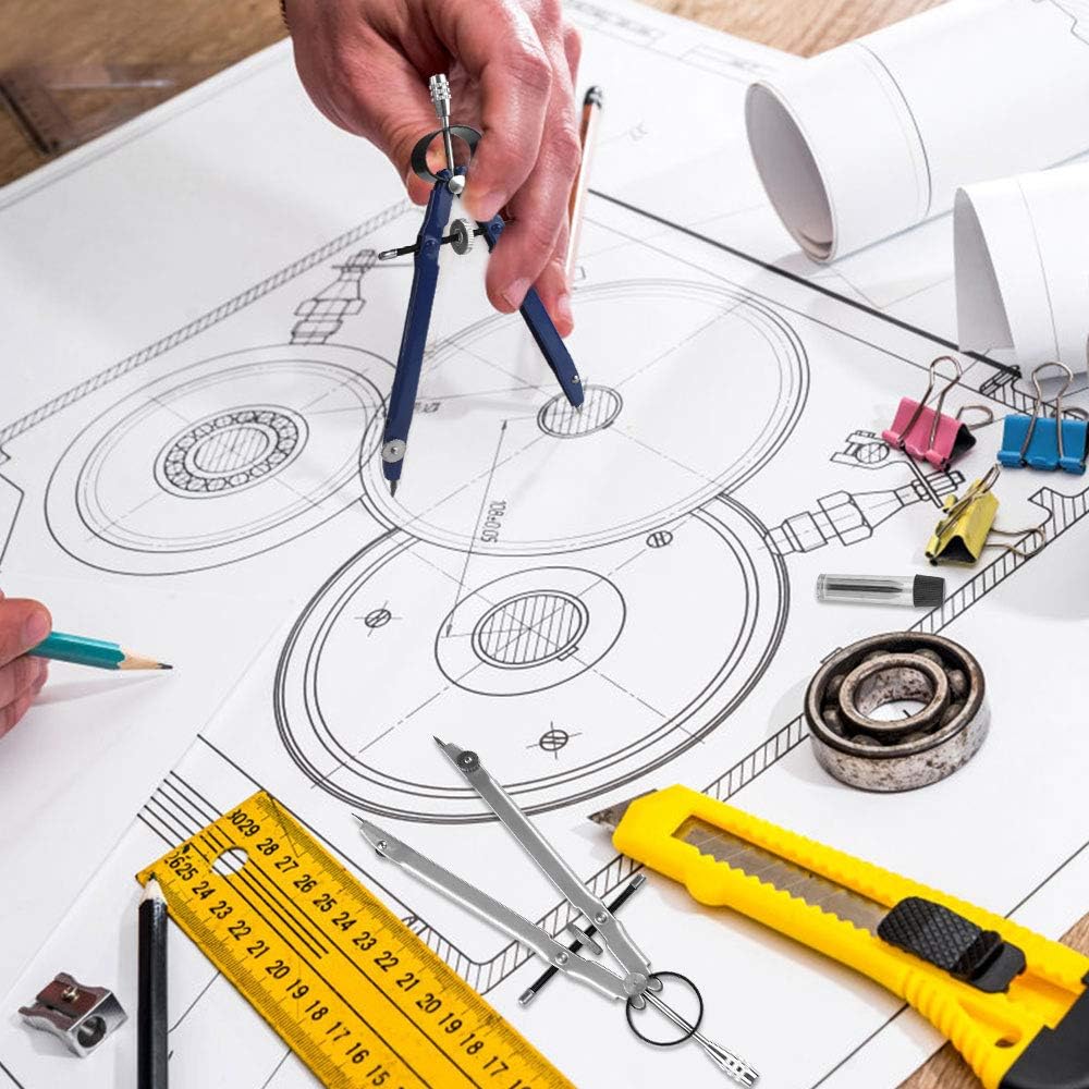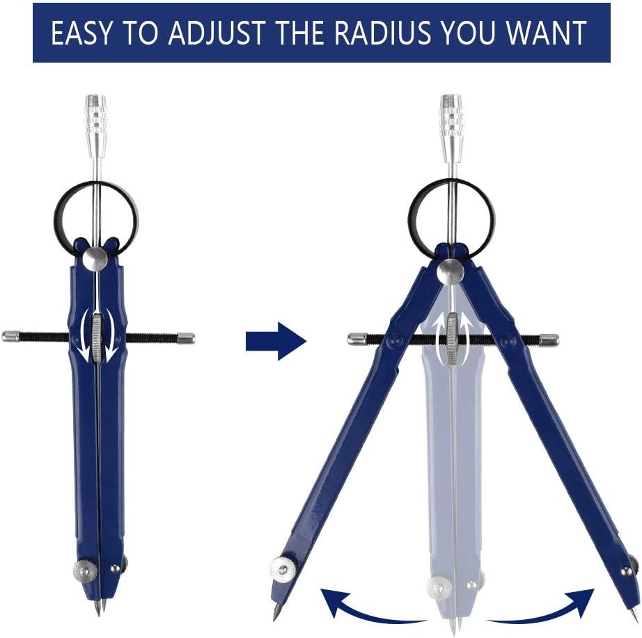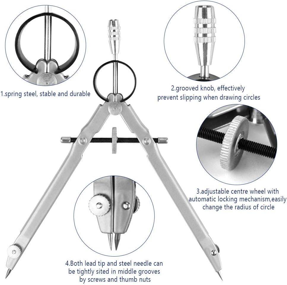 STRUMENTO SCOLASTICO ESSENZIALE: il compasso in metallo è il strumento scolastico essenziale per ogni studente delle scuole elementari e medie, il compass di facile utilizzo possono rendere più efficace l'apprendimento dei bambini.Quindi ogni studente dovrebbe avere la nostra compass. MATERIALE DI ALTA QUALITÀ E RESISTENTE: i compassi per tracciare sono realizzati in materiale di lega di alluminio e acciaio inox di alta qualità.Anticorrosivo, nessuna ruggine, resistente e durevole. DIMENSIONE REGOLABILE DI COMPASSO: la rotella centrale regolabile del compasso scuola elementare da disegno con meccanismo di bloccaggio automatico, non solo può cambiare facilmente il raggio del cerchio ma può anche impedire il movimento delle gambe durante il disegno. AMPIO USO: il compasso è perfetto per tutti gli studenti, insegnanti, artisti, architetti, matematici, ingegneri, falegnami. Può anche essere usato per disegnare, ecc. CONTENUTO DELLA CONFEZIONE: la confezione include 3 compasso disegno tecnico, un nero,un blu e un grigio, 3 scatole di punte di matita di ricambio (9 punte di matita), 3 set di accessori di viti di ricambio (6 dadi, 6 viti), complete kit per soddisfare le tue tutte esigenze. quindi, in modo da poter cambiare i tuoi accessori in qualsiasi momento.